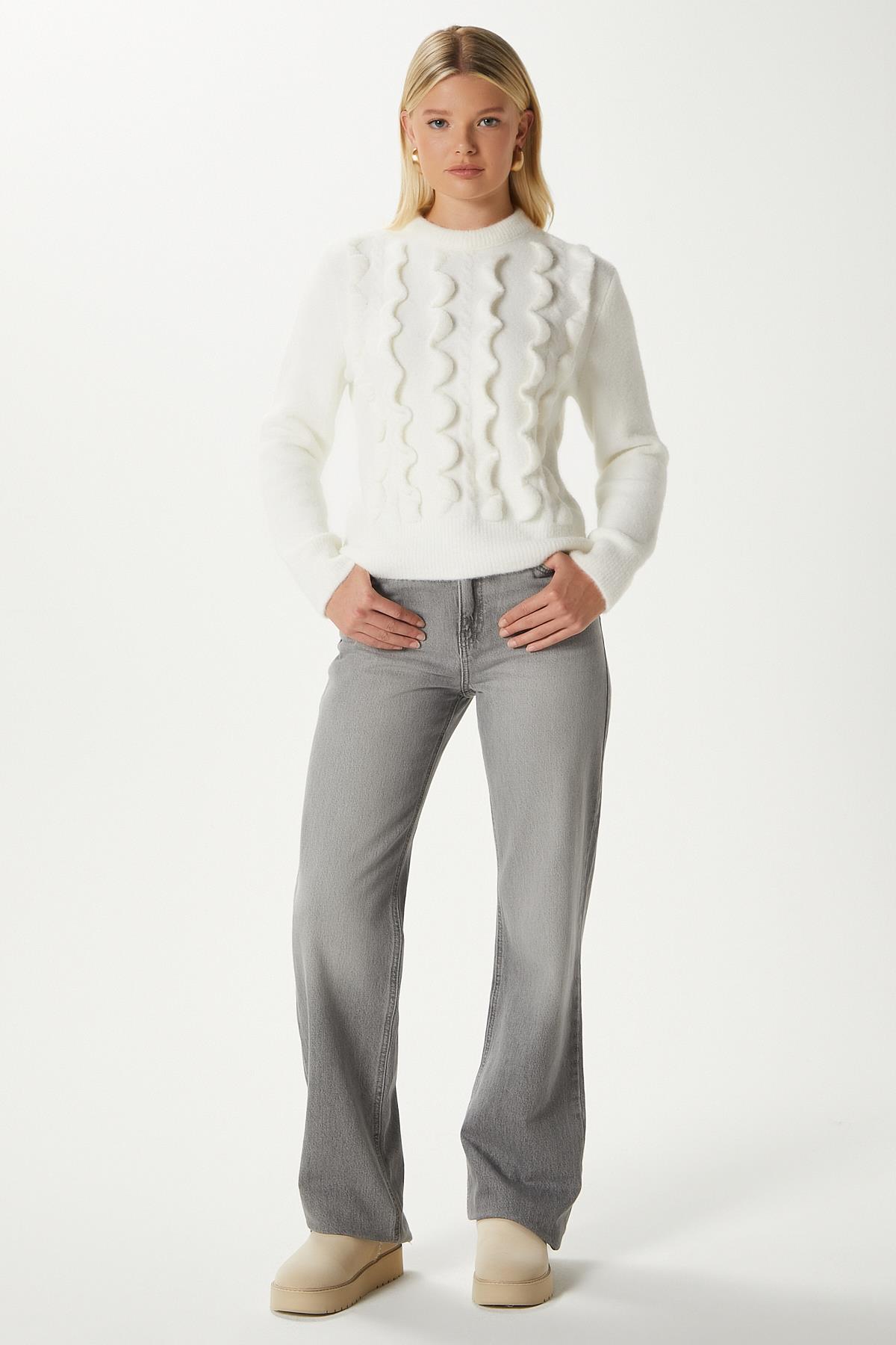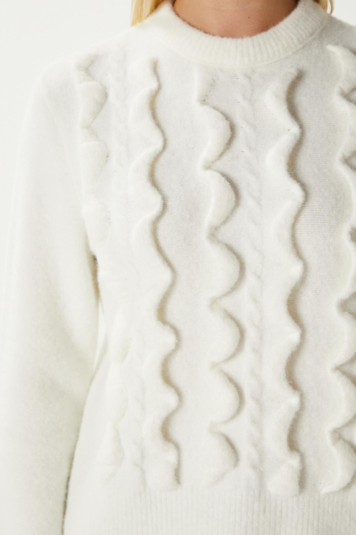 Wave Dalgalı Ekru Triko Kazak AQ763