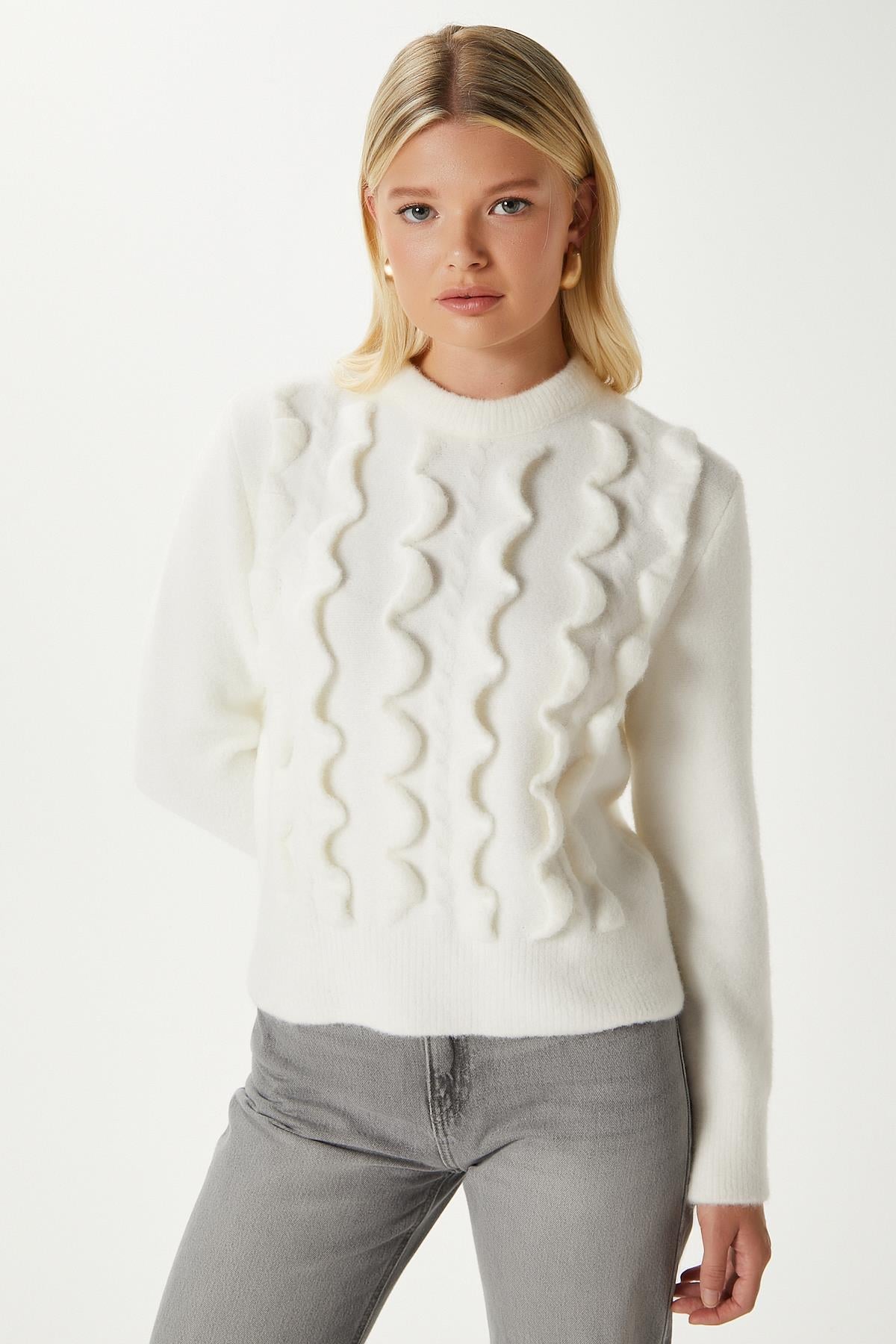 Wave Dalgalı Ekru Triko Kazak