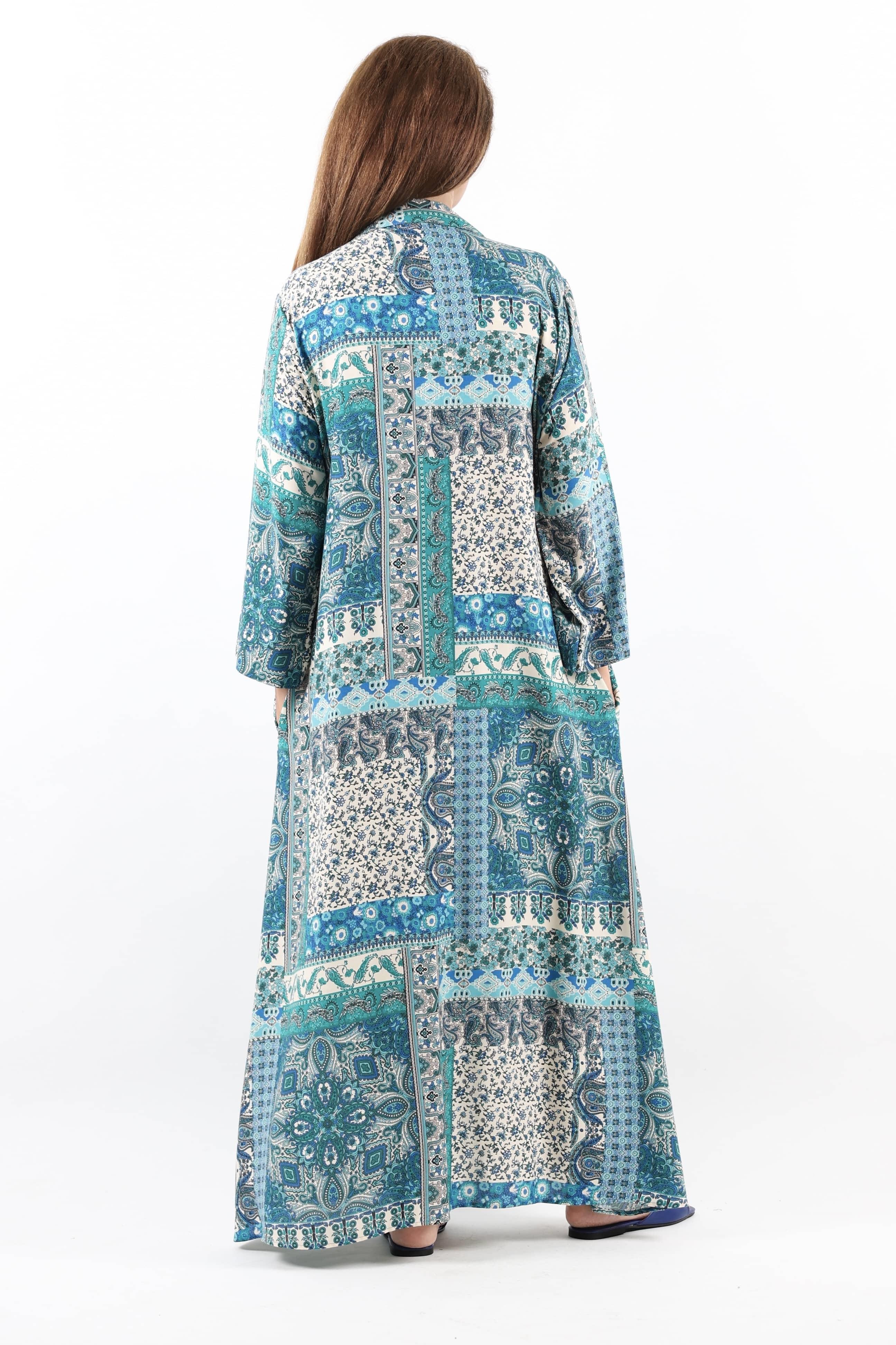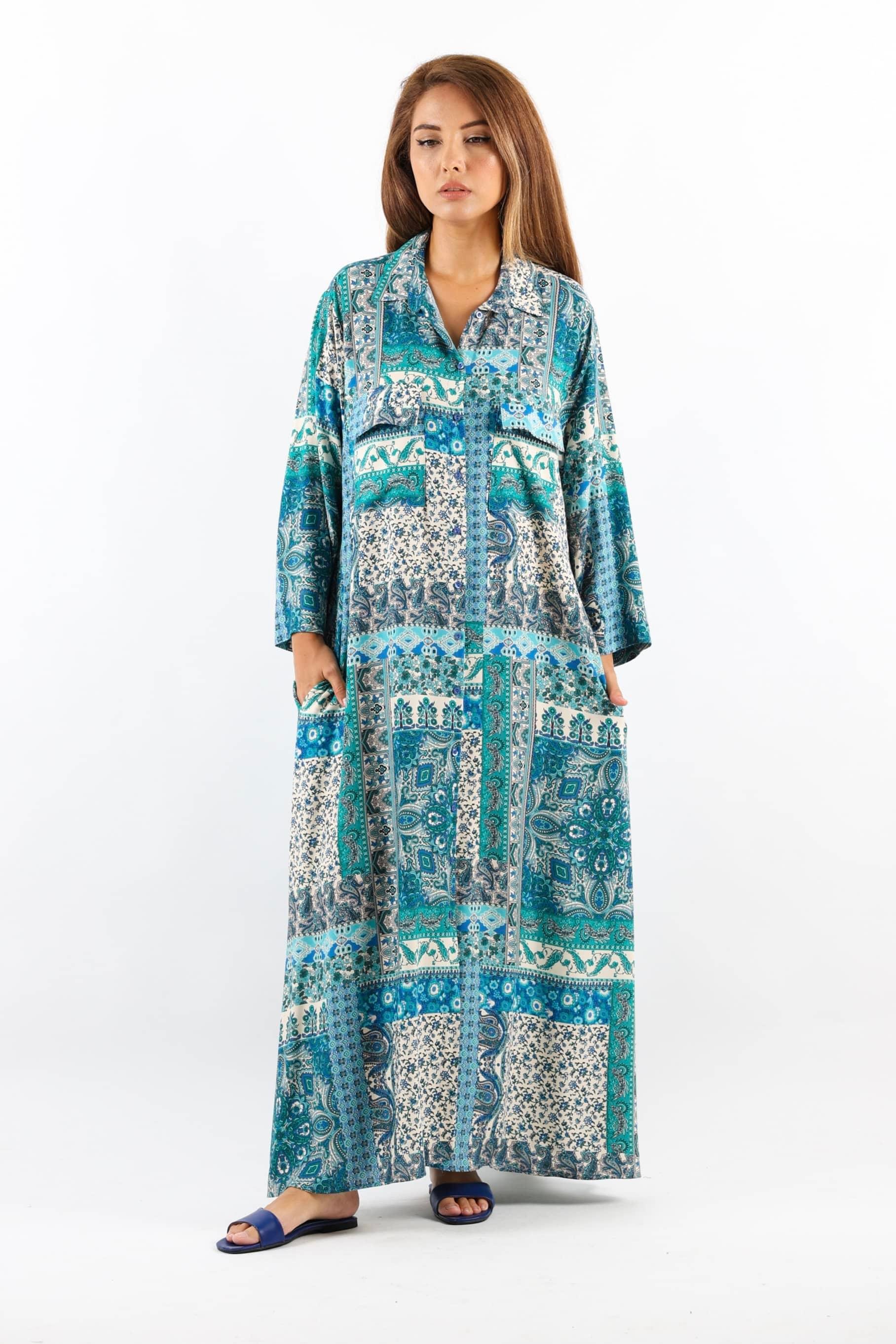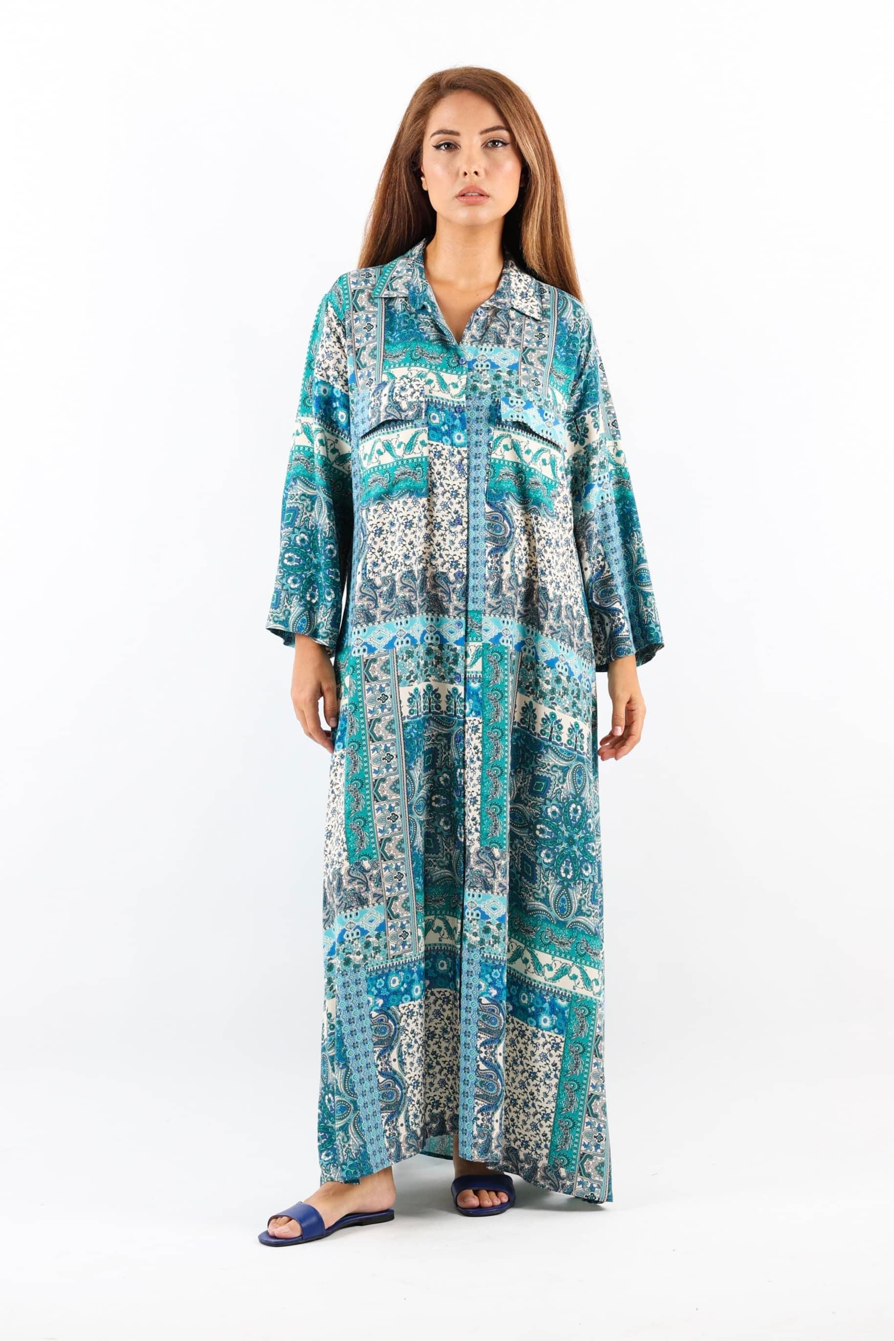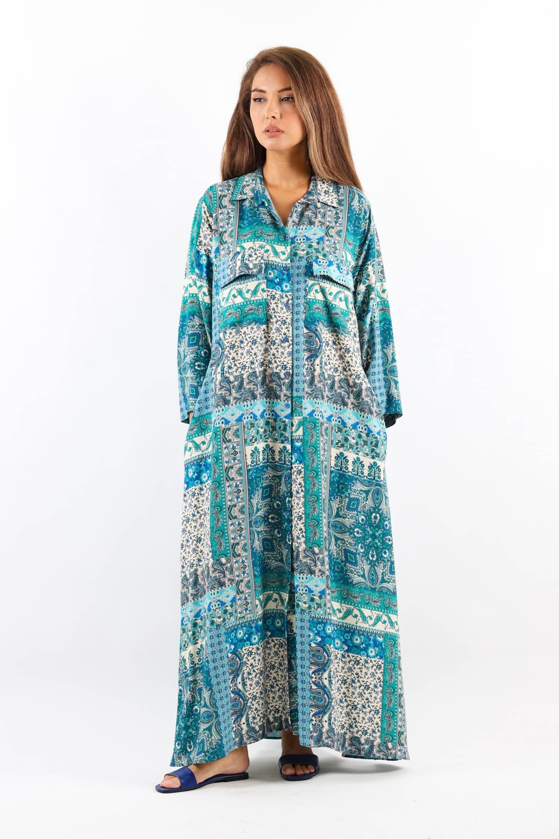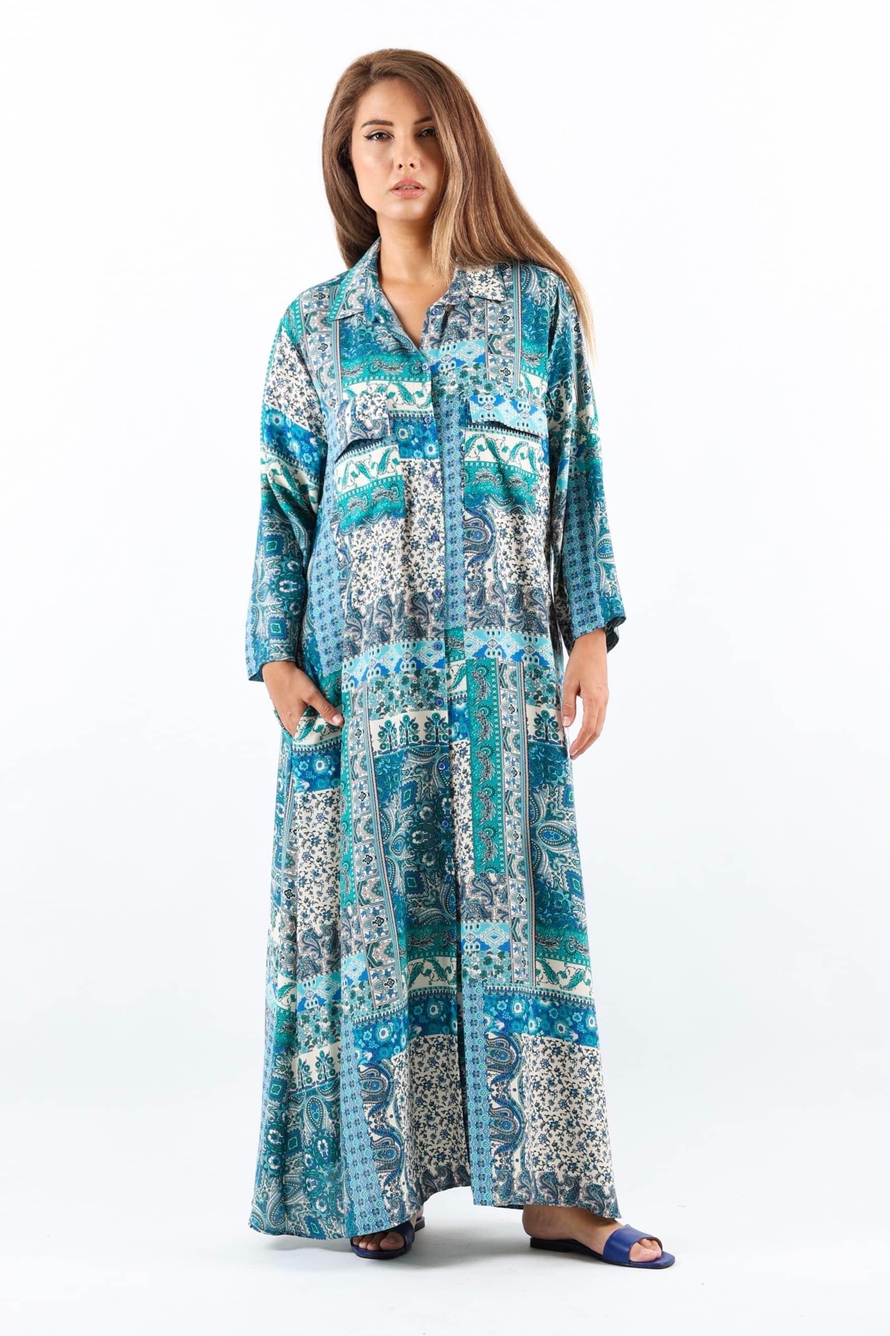 Etnik %100 Viskon Mavi Gömlek Yaka Önden Düğmeli Uzun Yazlık Elbise