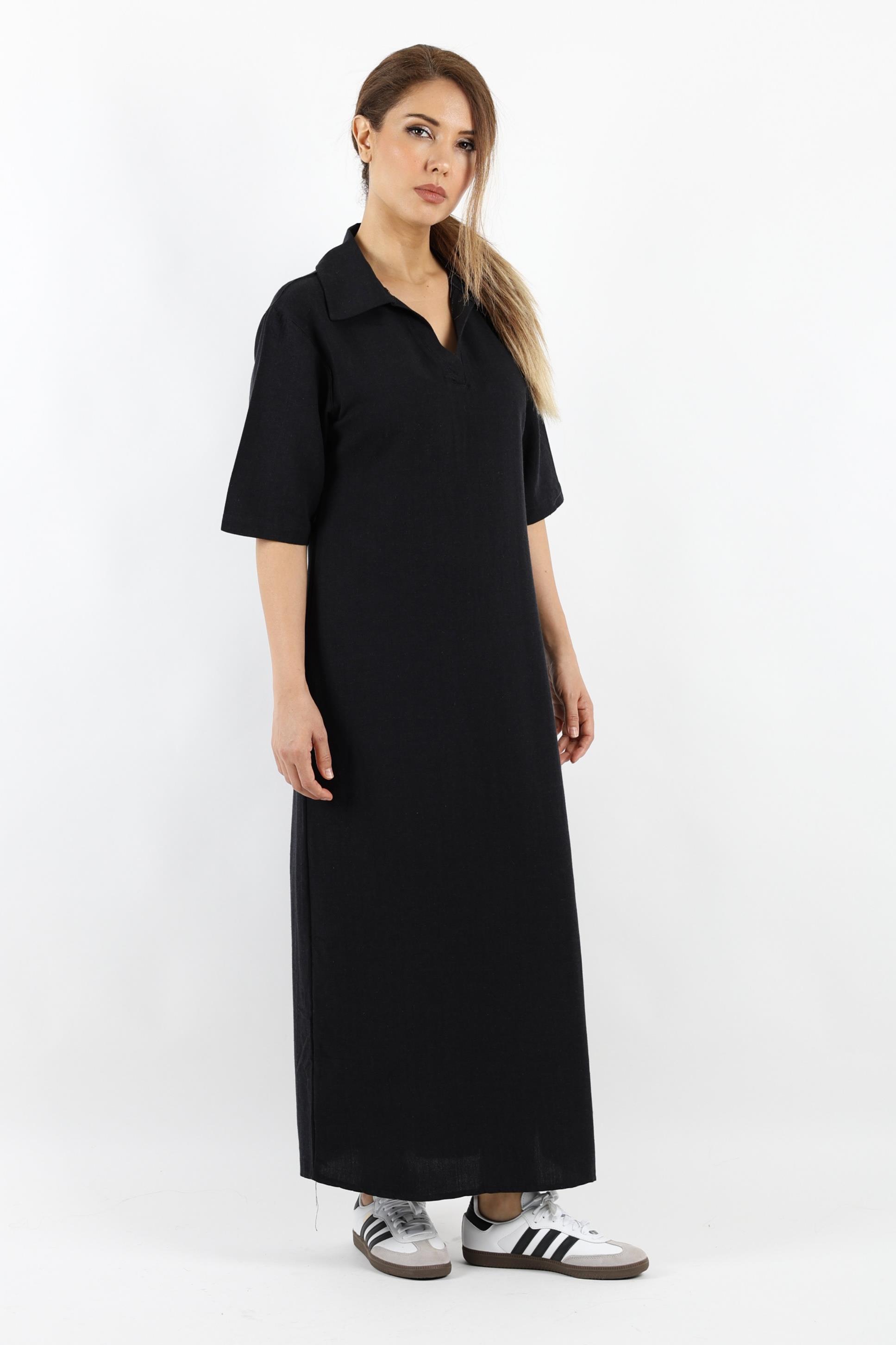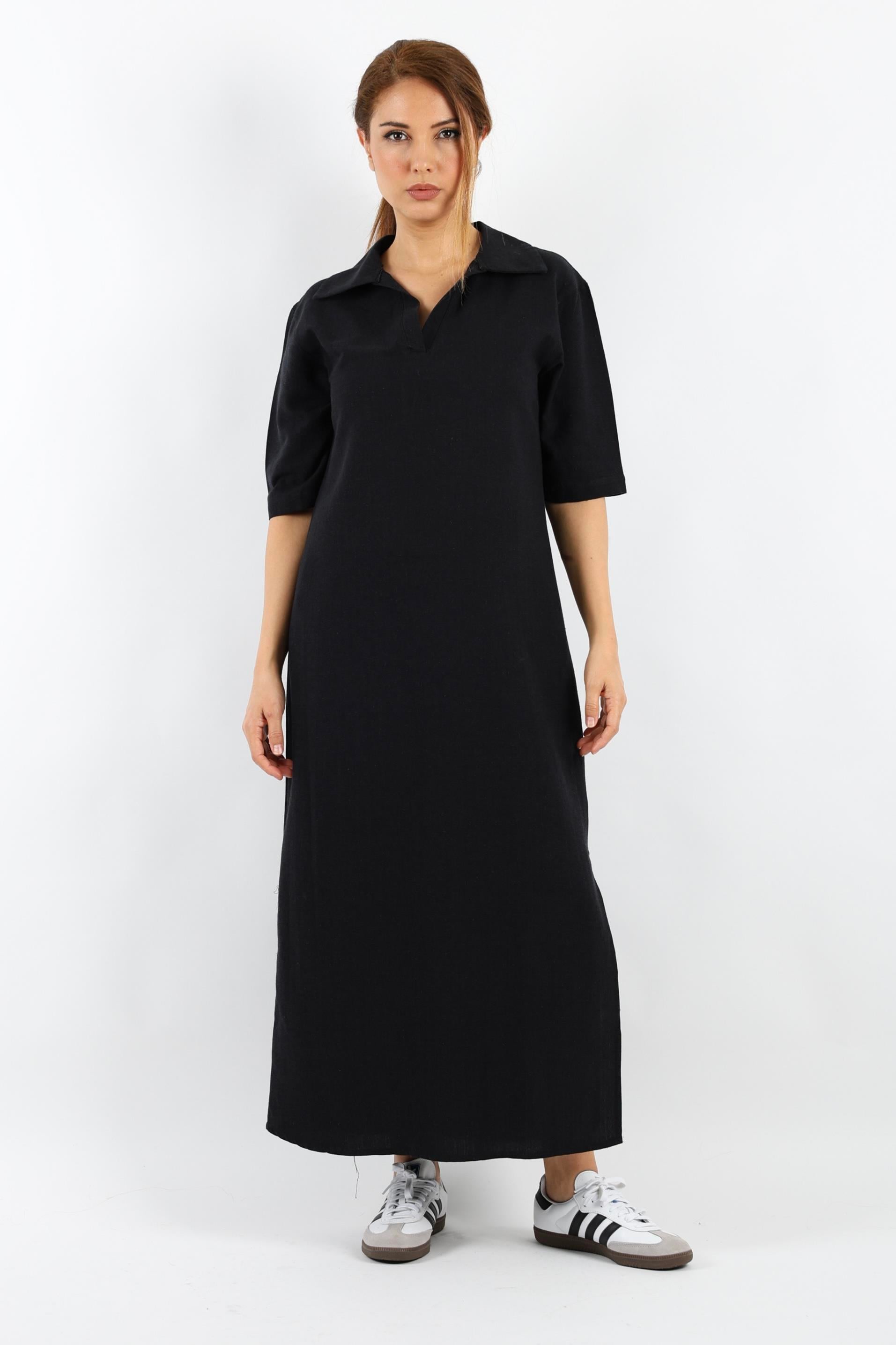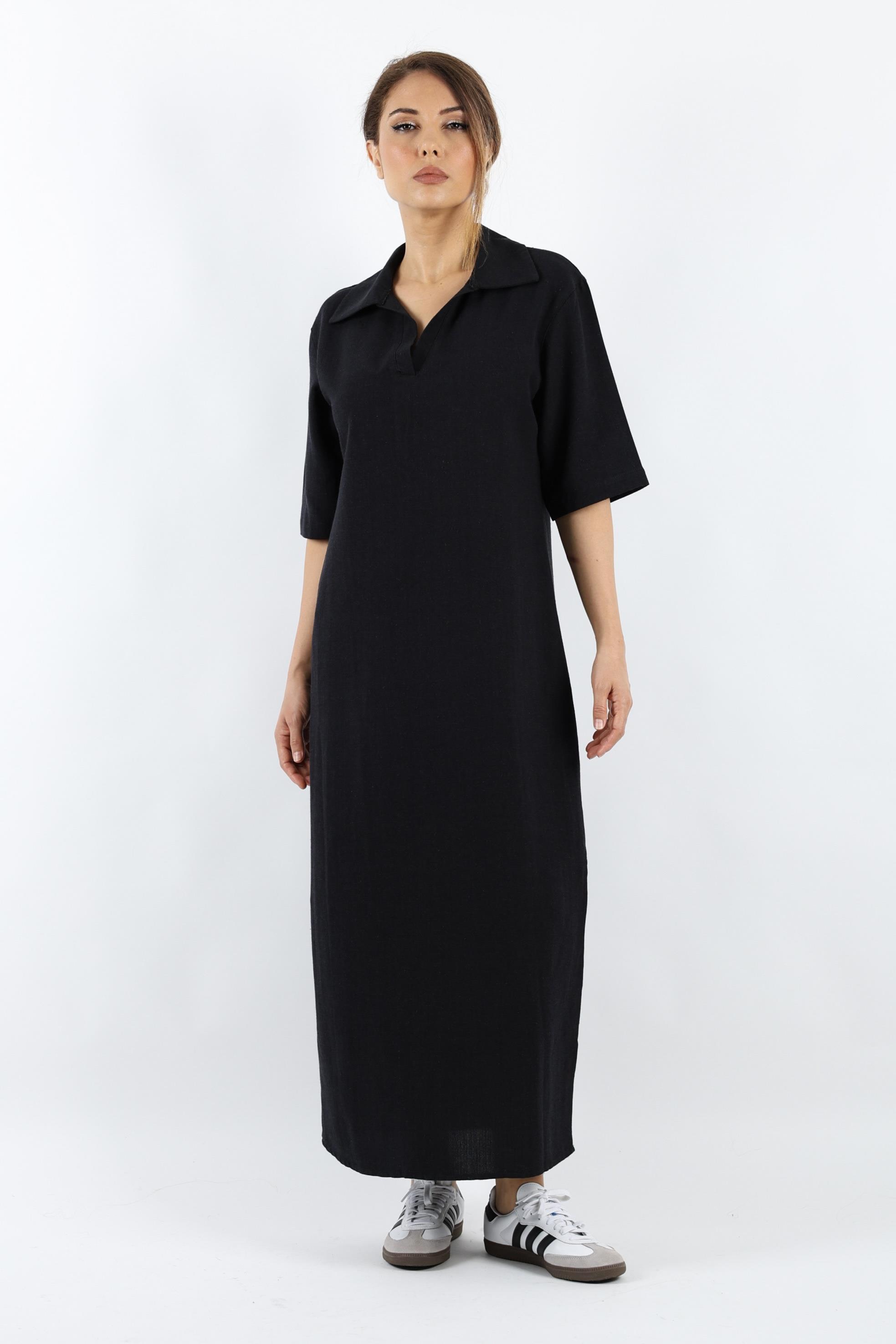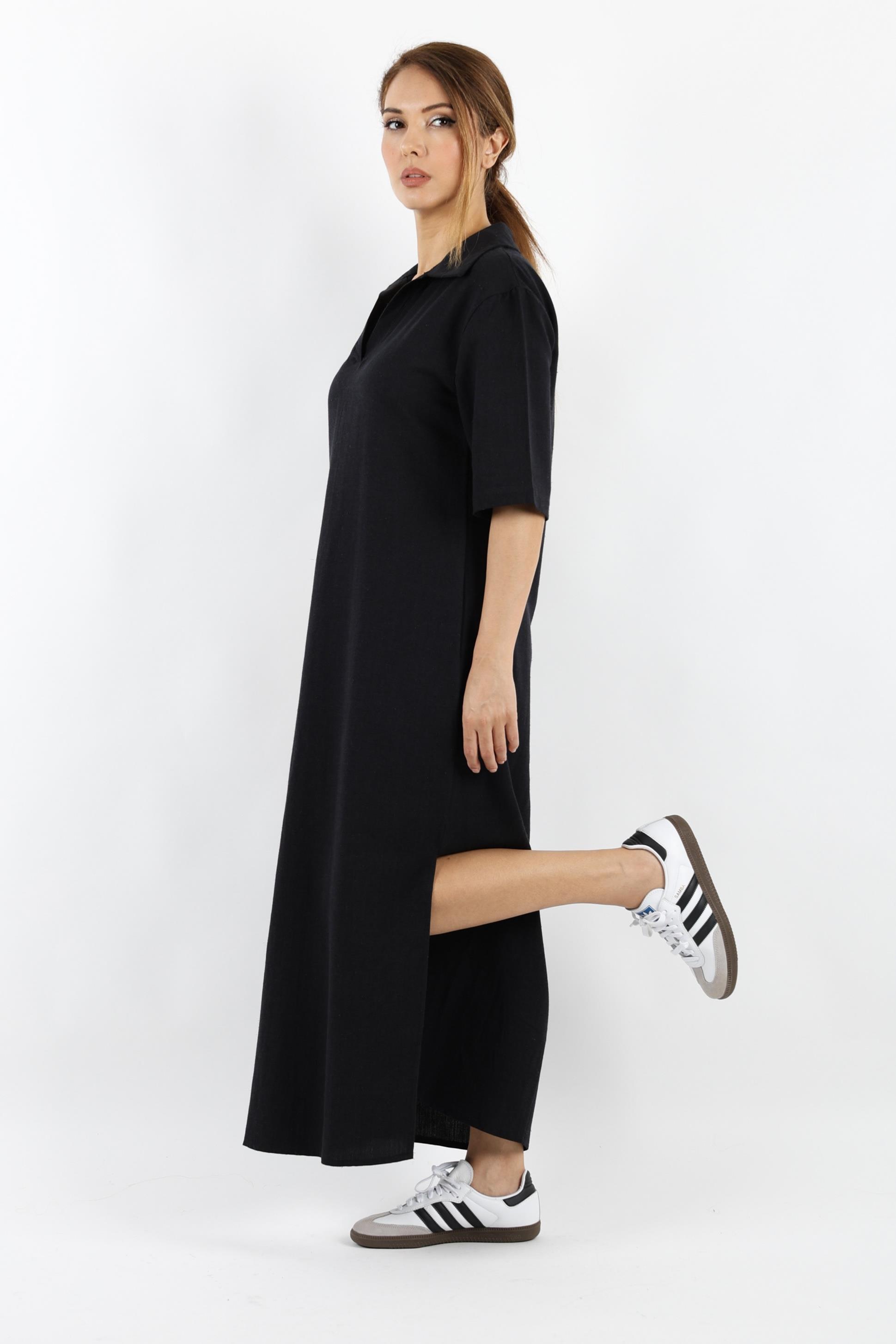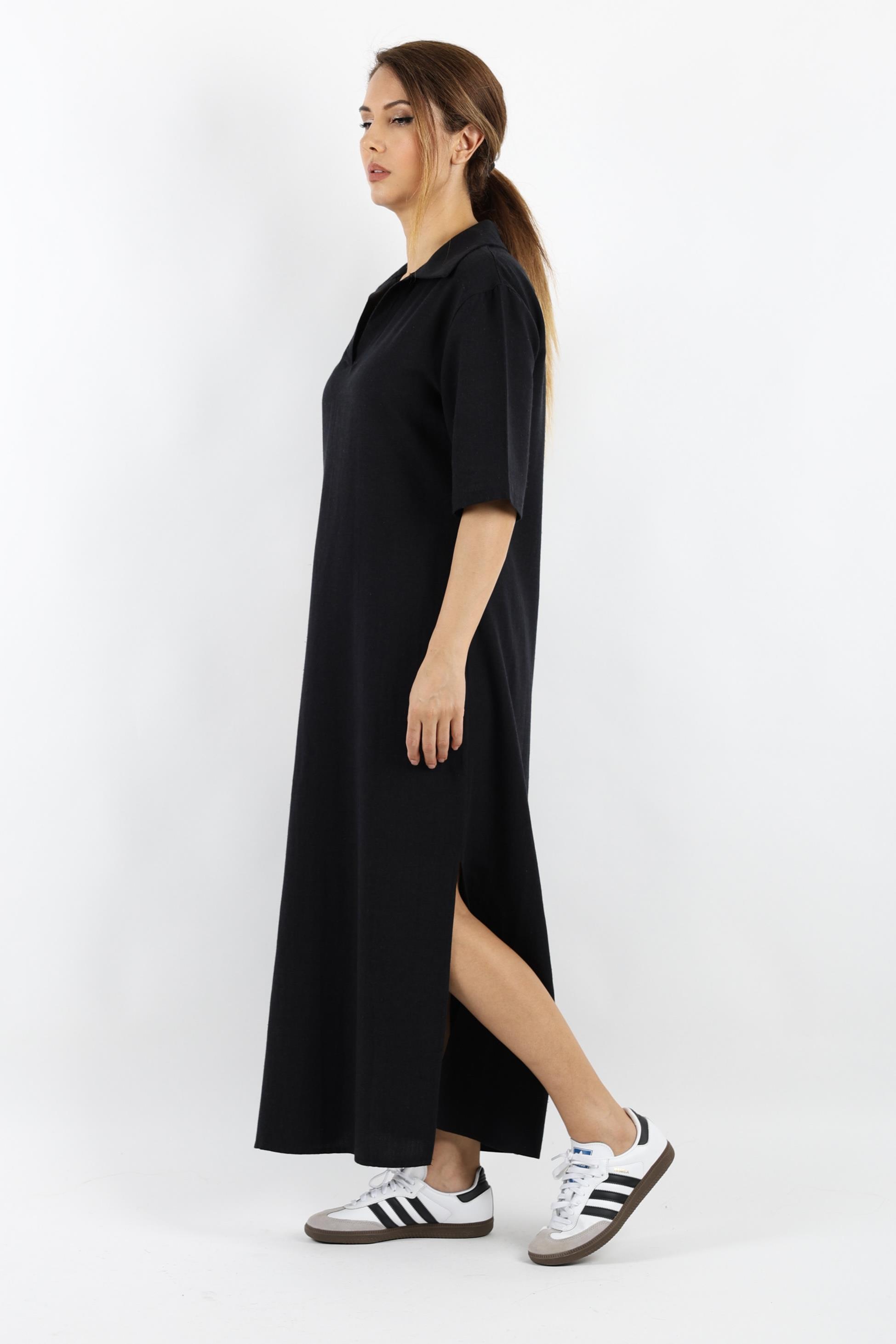 Kadın Basic Siyah Polo Yaka Yırtmaçlı Elbise