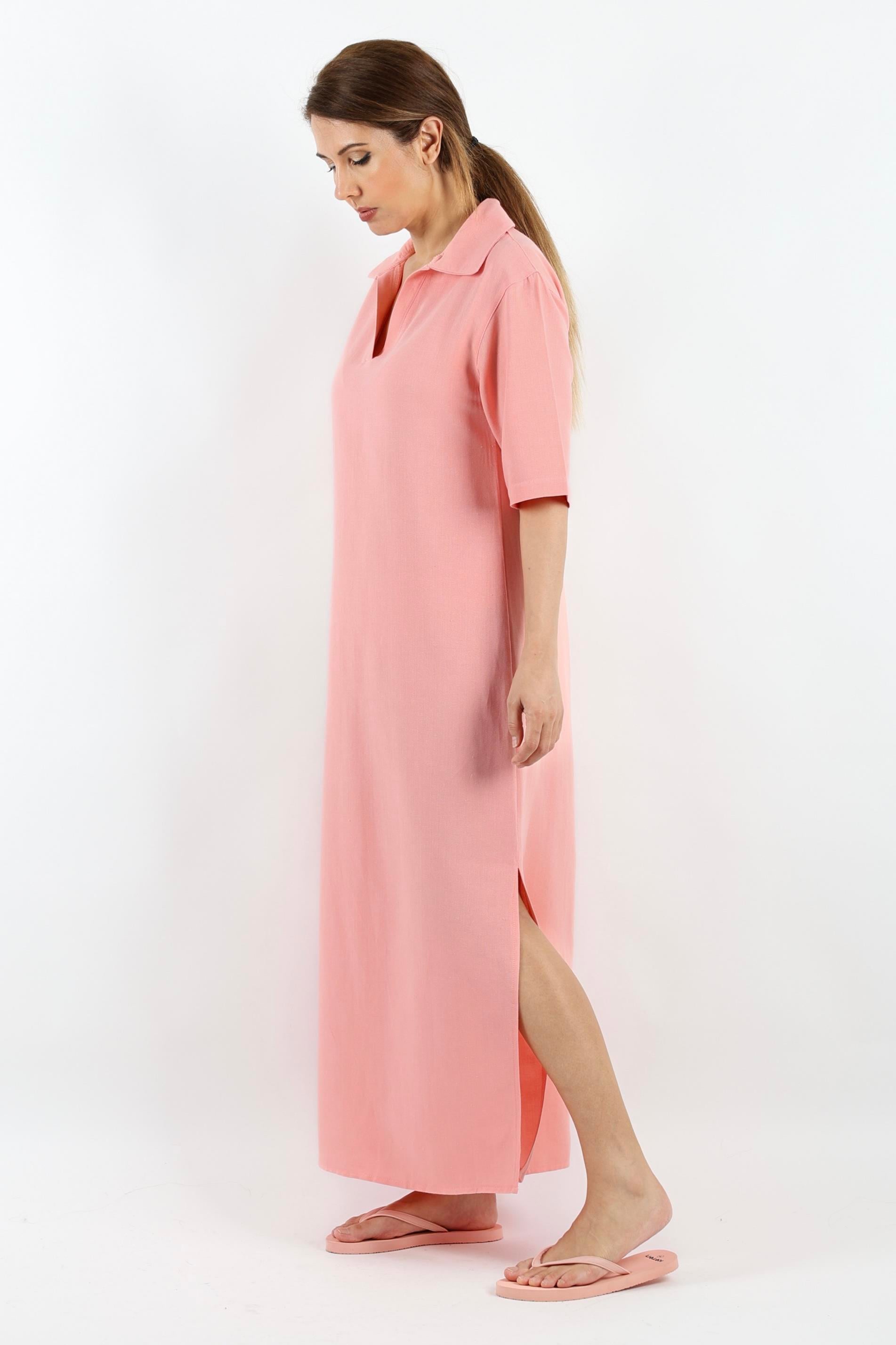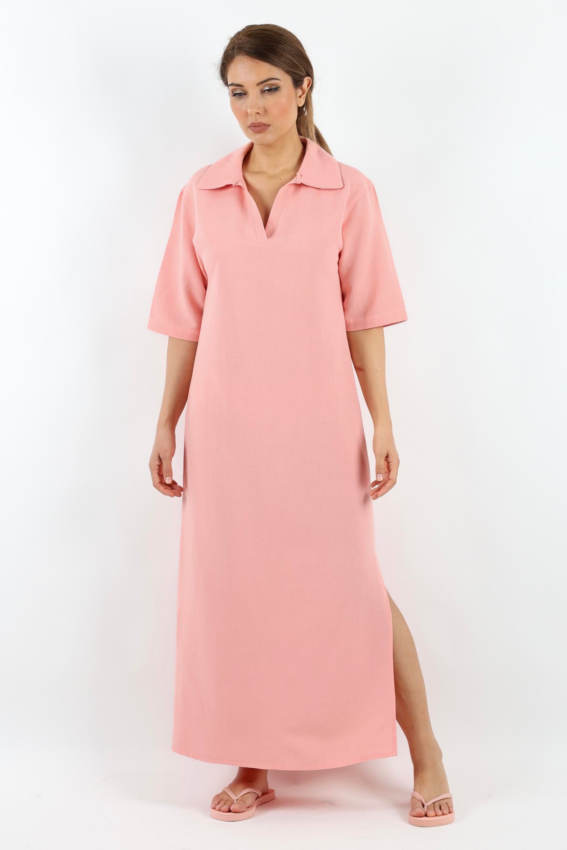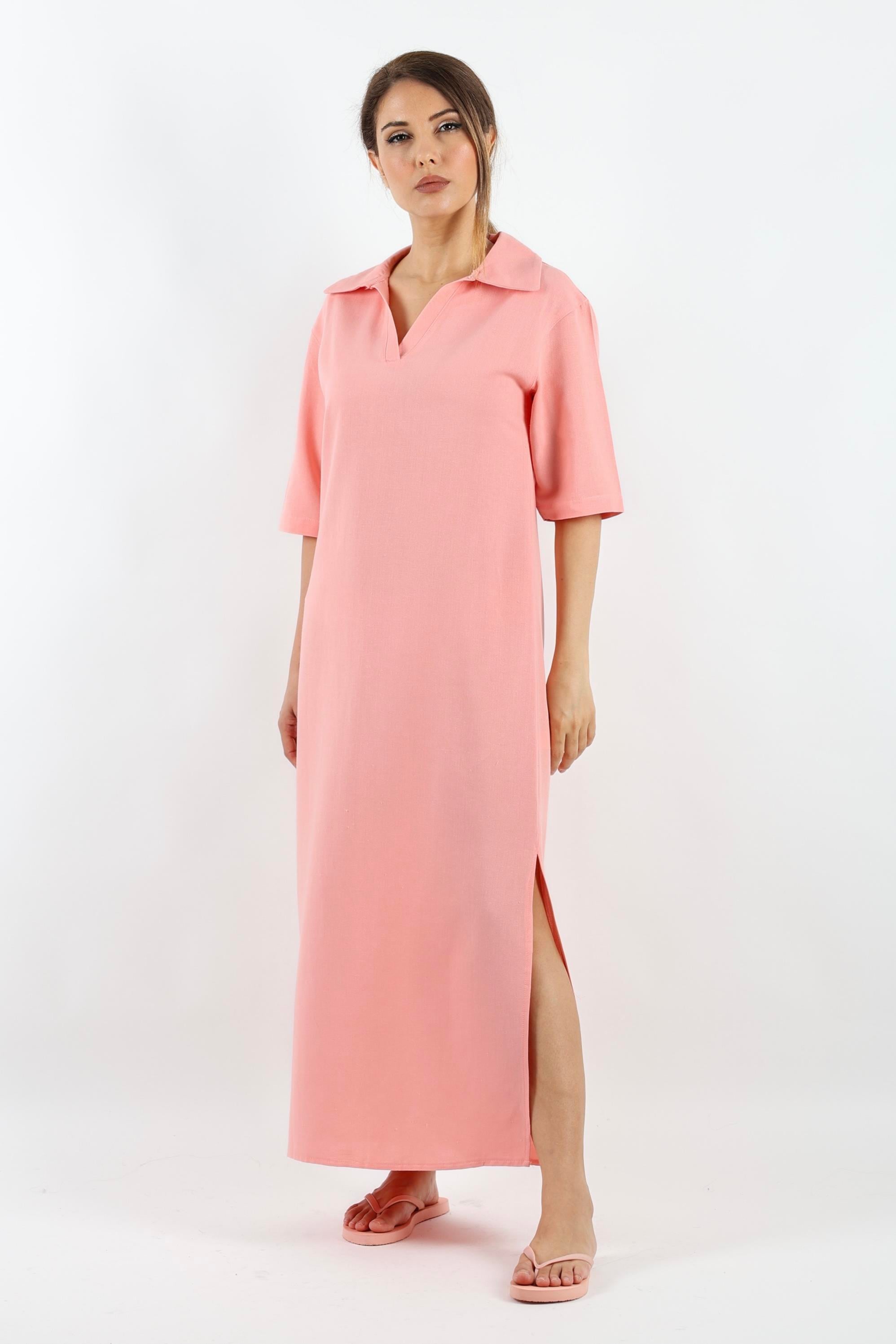 Kadın Basic Somon Polo Yaka Yırtmaçlı Elbise