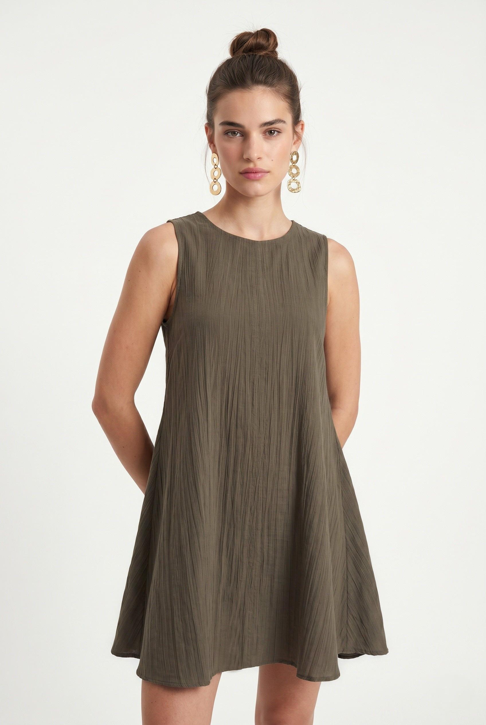 Kadın Cody Yumuşak Nubuk Cupra Dokuma Çan Kesim Kolsuz Rahat Haki Kısa Elbise