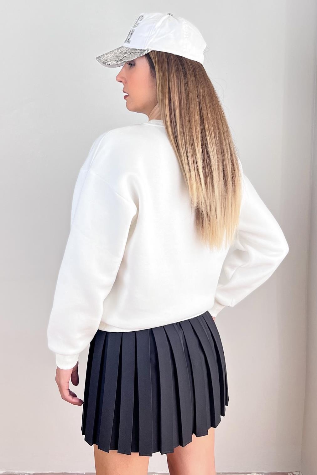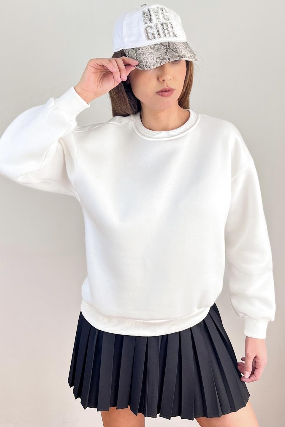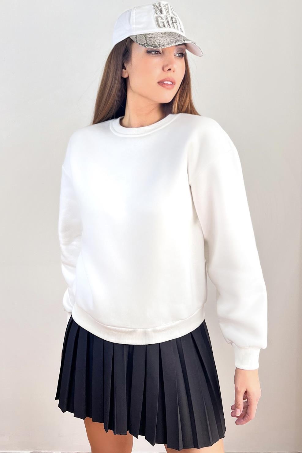 Kadın Cozy İçi Polarlı Ekru Basic Bisiklet Yaka Pamuklu Kalın Örme Sweatshirt