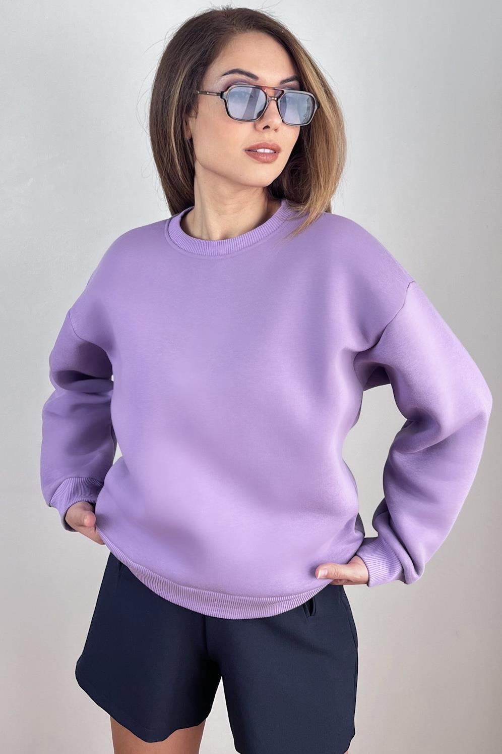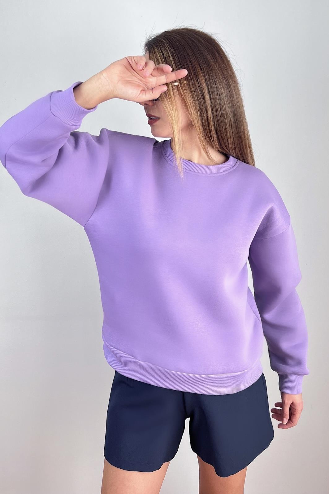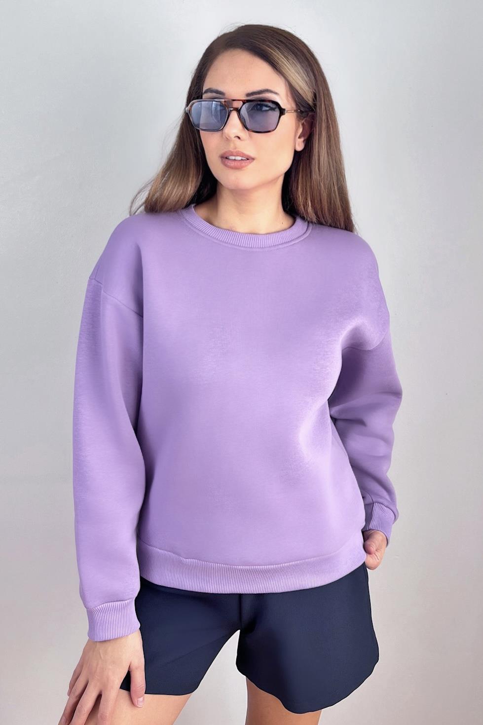 Kadın Cozy İçi Polarlı Mor Basic Bisiklet Yaka Pamuklu Kalın Örme Sweatshirt