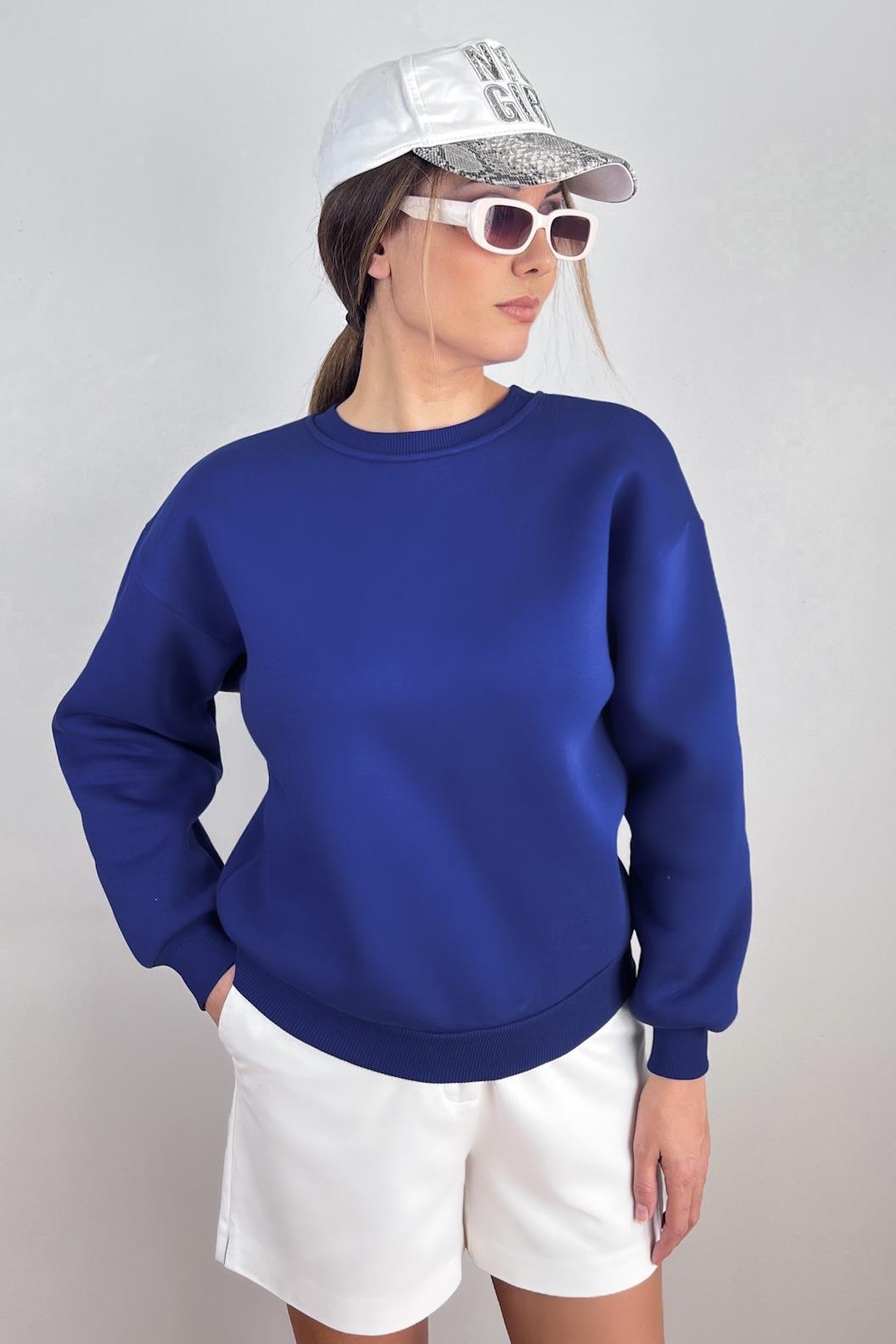 Kadın Cozy İçi Polarlı Saks Mavi Basic Bisiklet Yaka Pamuklu Kalın Örme Sweatshirt