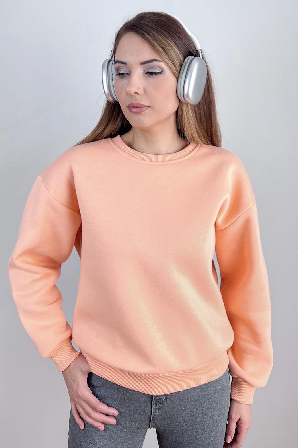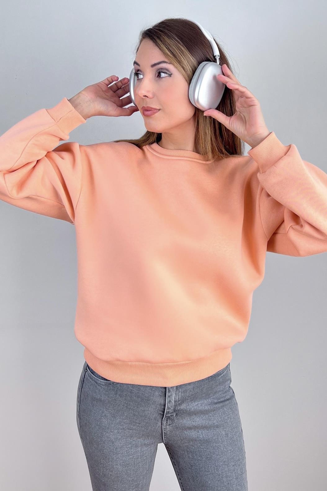 Kadın Cozy İçi Polarlı Somon Basic Bisiklet Yaka Pamuklu Kalın Örme Sweatshirt