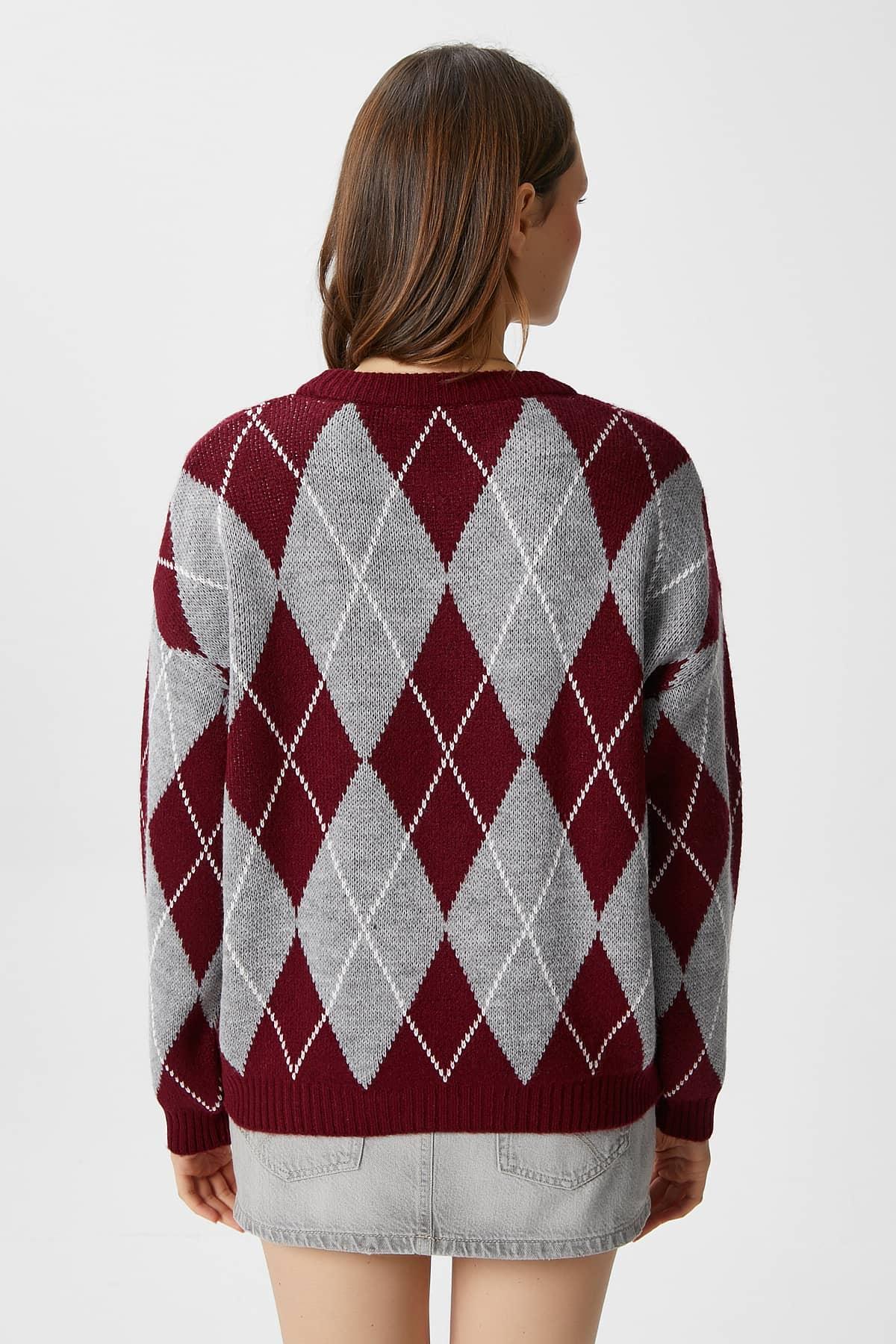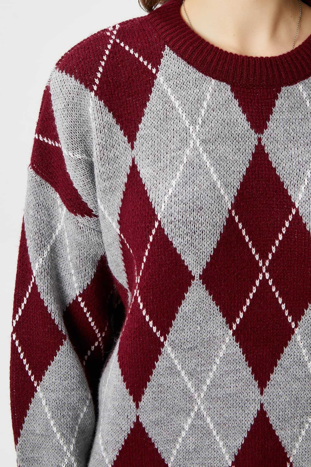 Edwin Bordo Gri Baklava Desen Triko Kazak