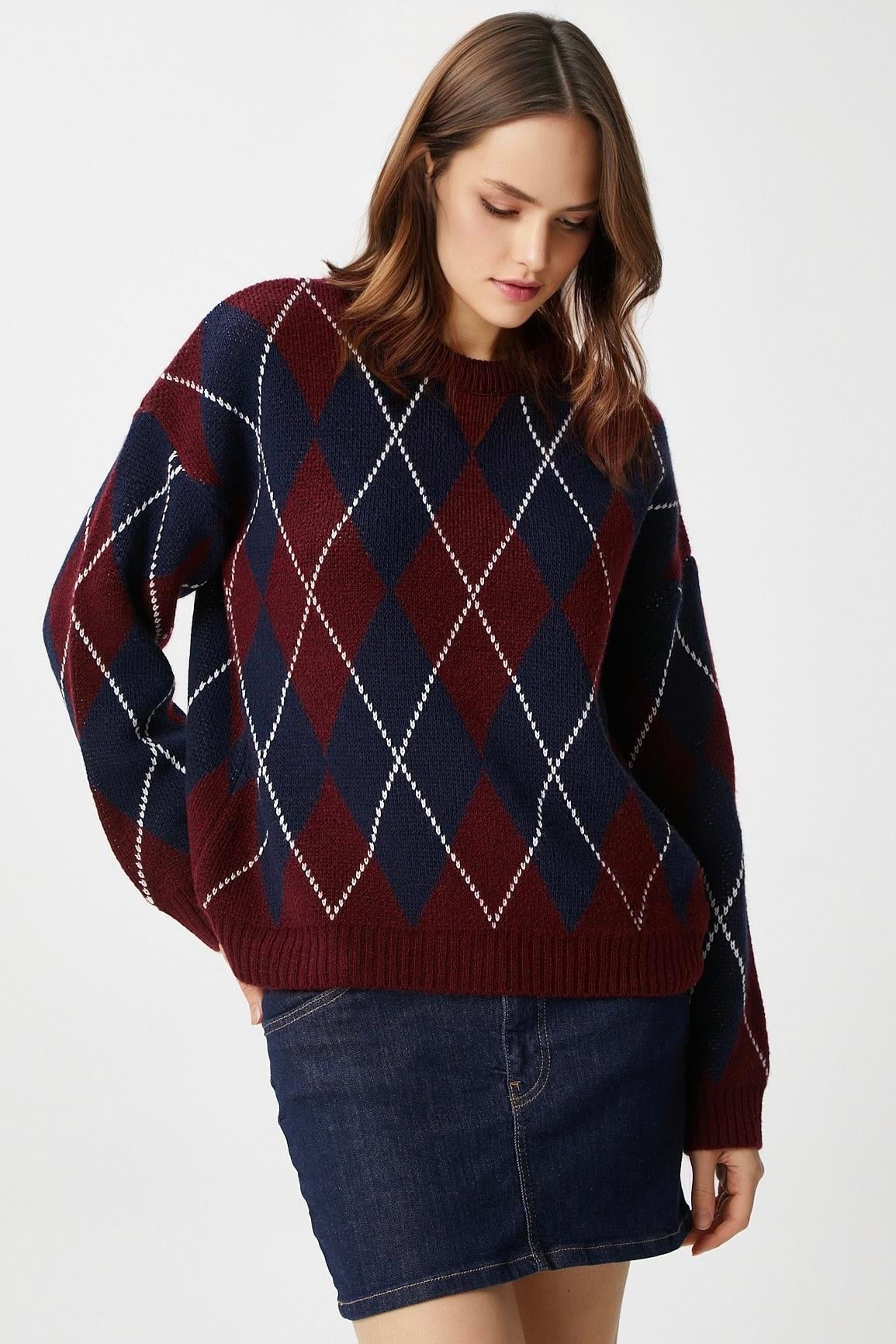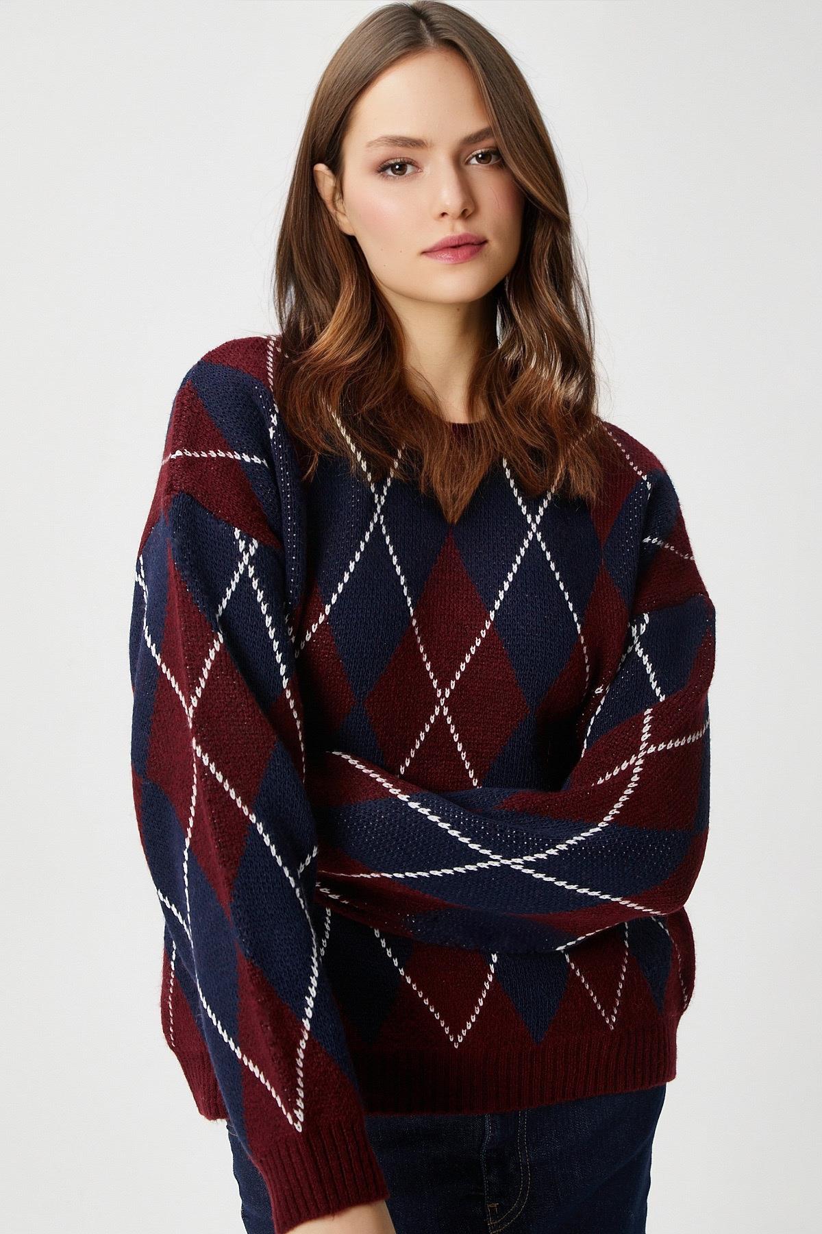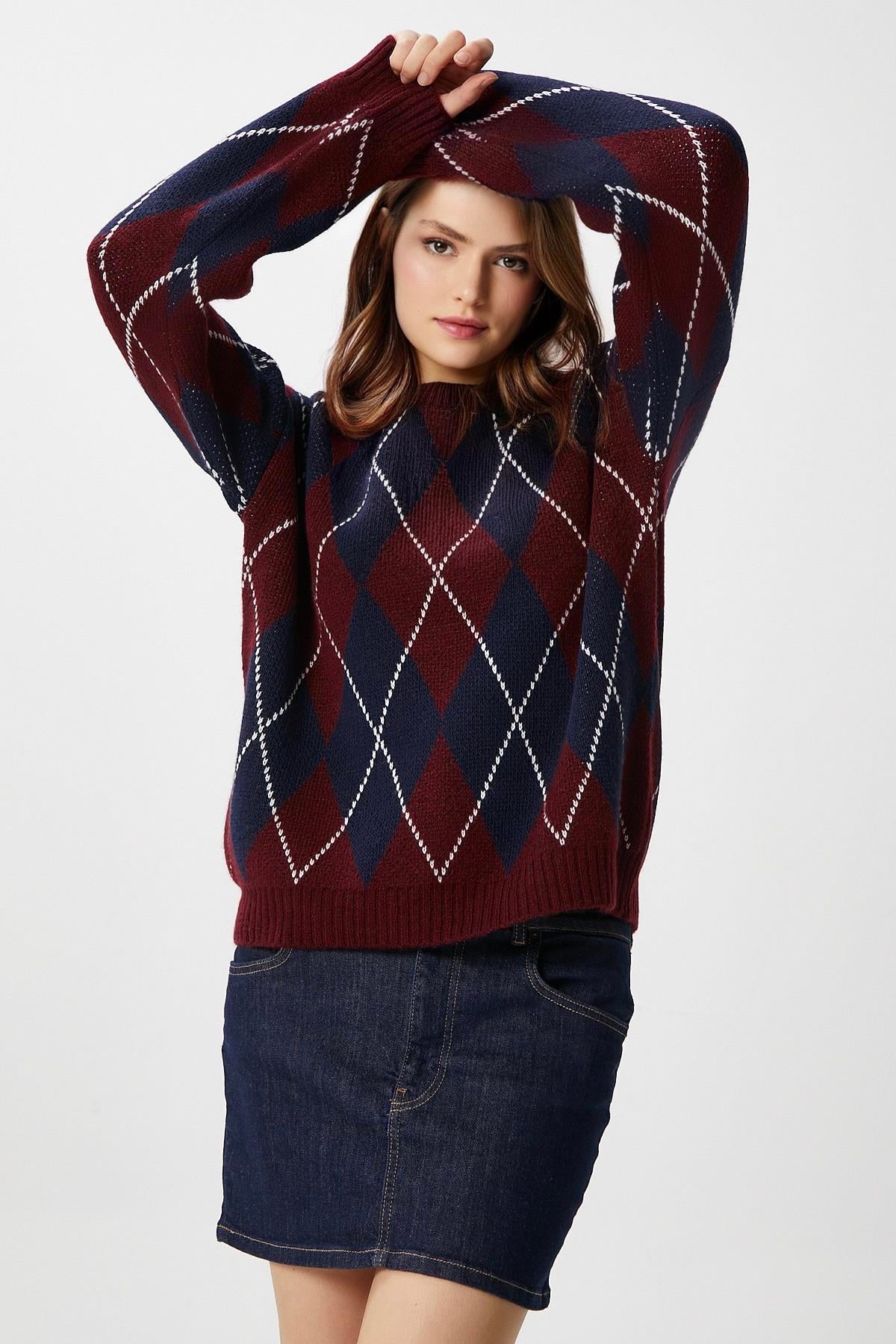 Kadın Edwin Lacivert Bordo Baklava Desen Triko Kazak