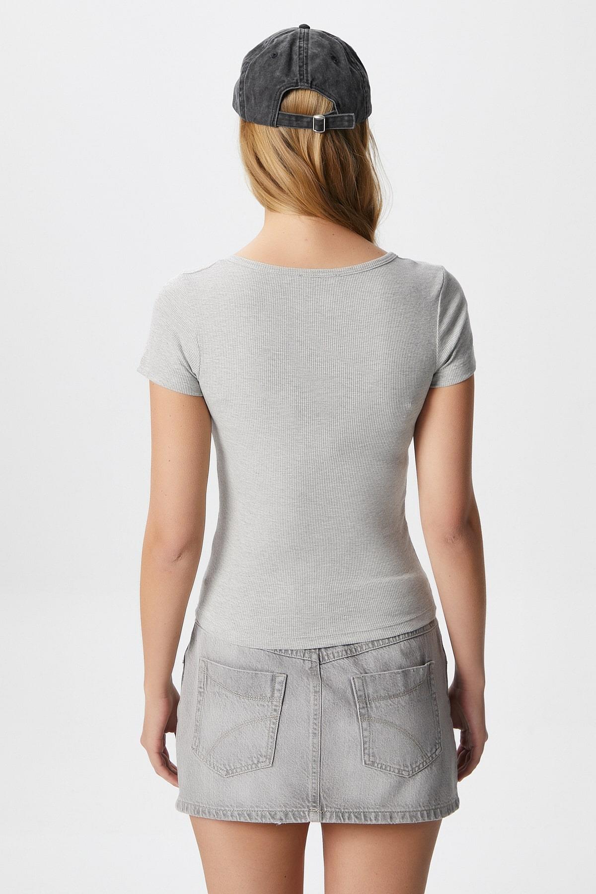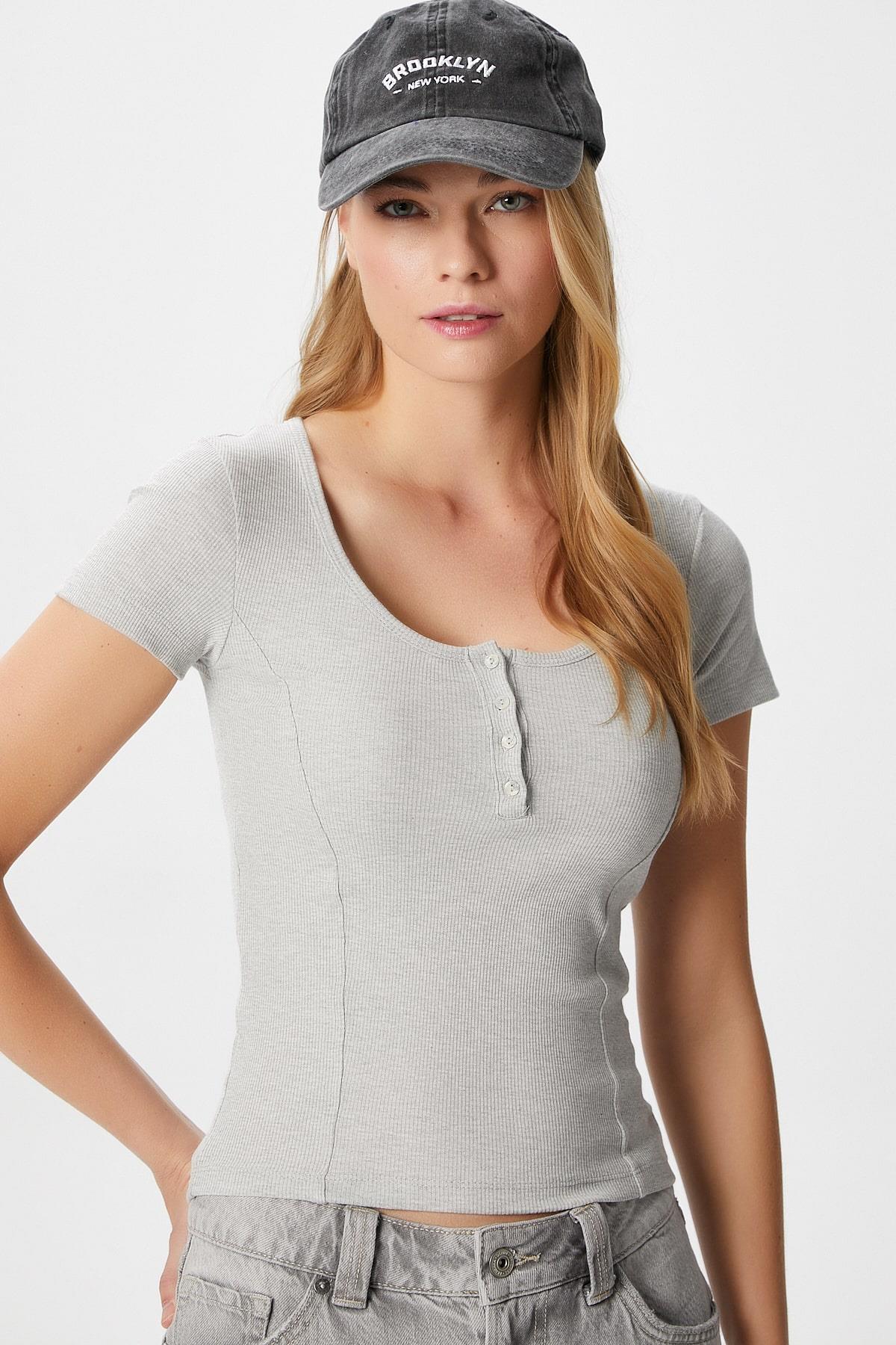 Kadın Elena Korse Görünümlü Düğmeli Fitilli Kısa Kol Gri Bluz