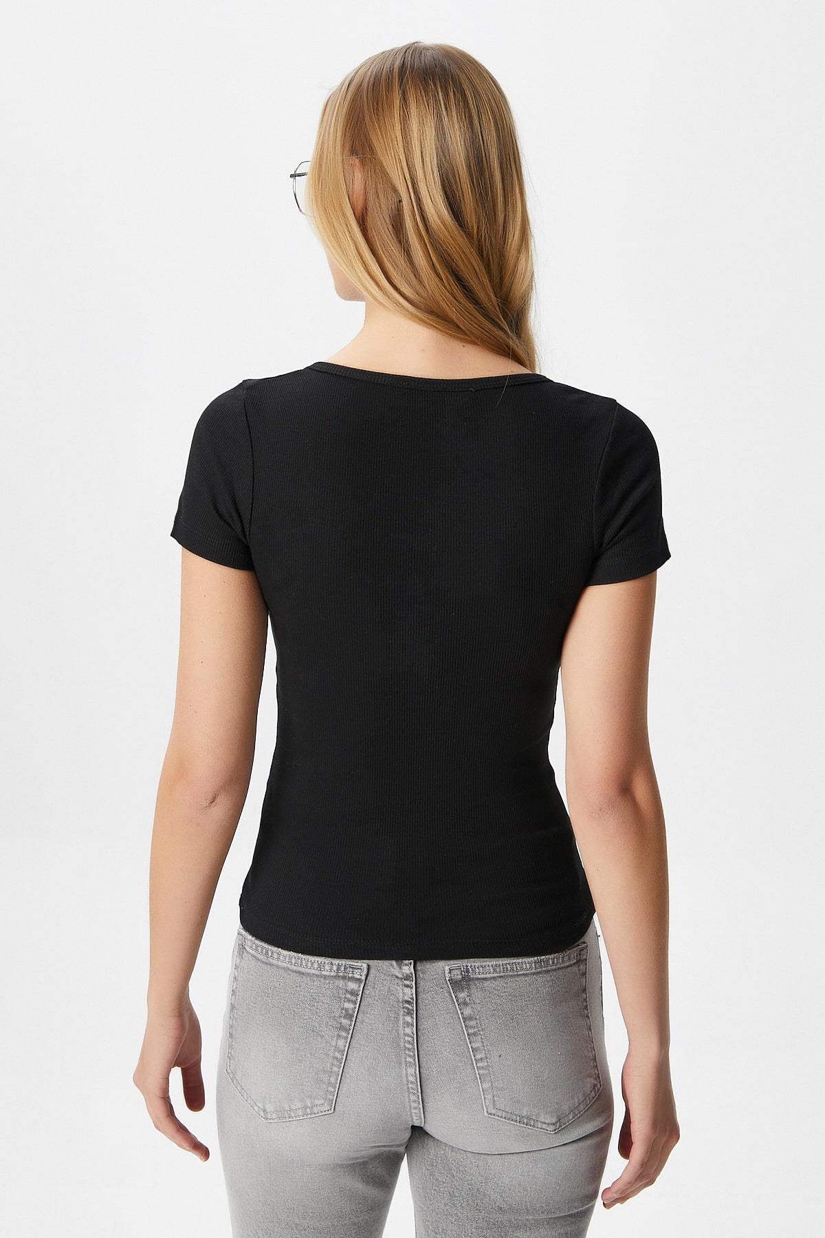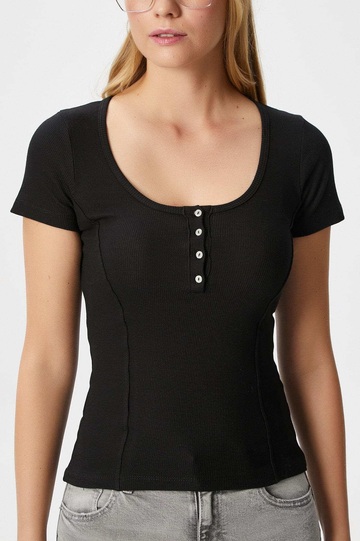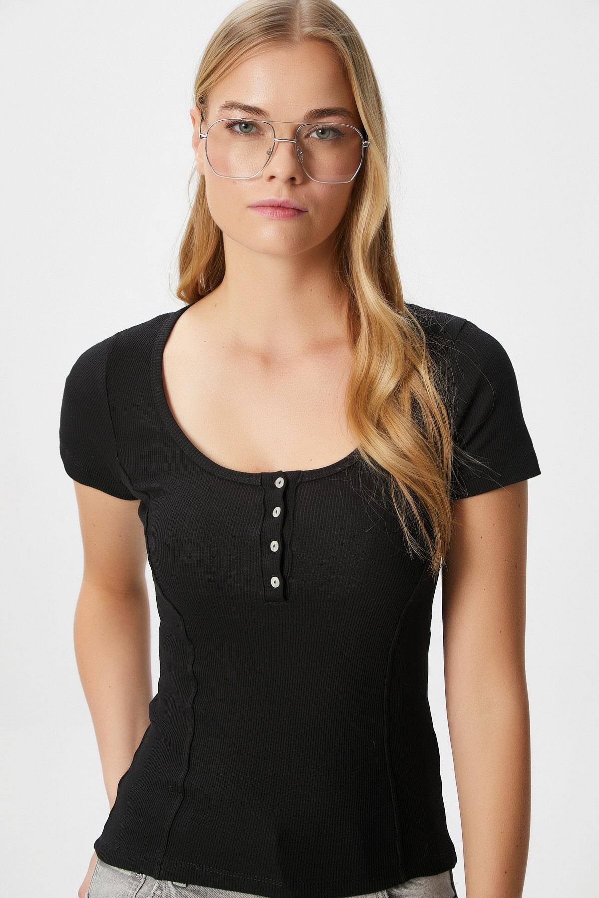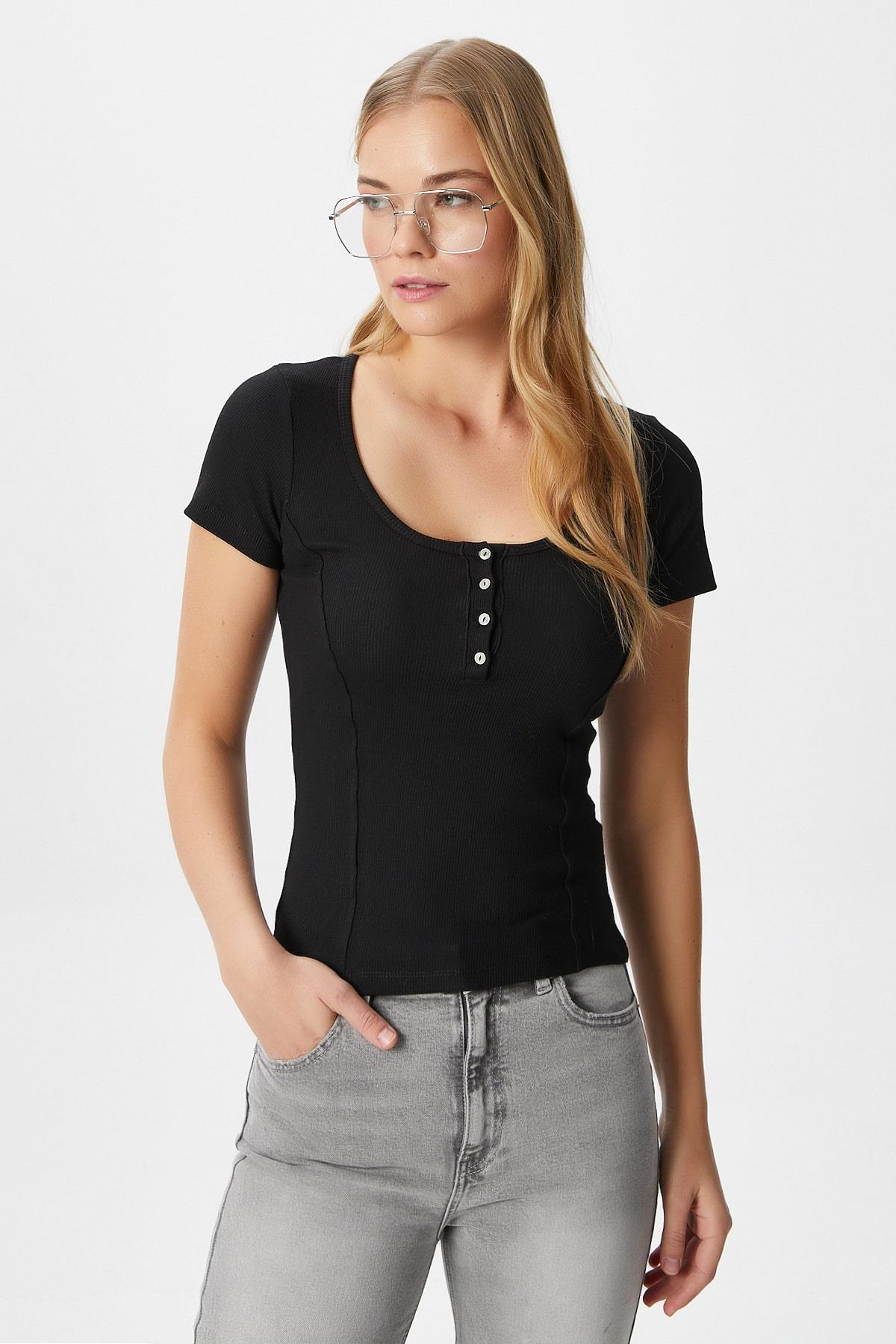 Kadın Elena Korse Görünümlü Düğmeli Fitilli Kısa Kol Siyah Bluz