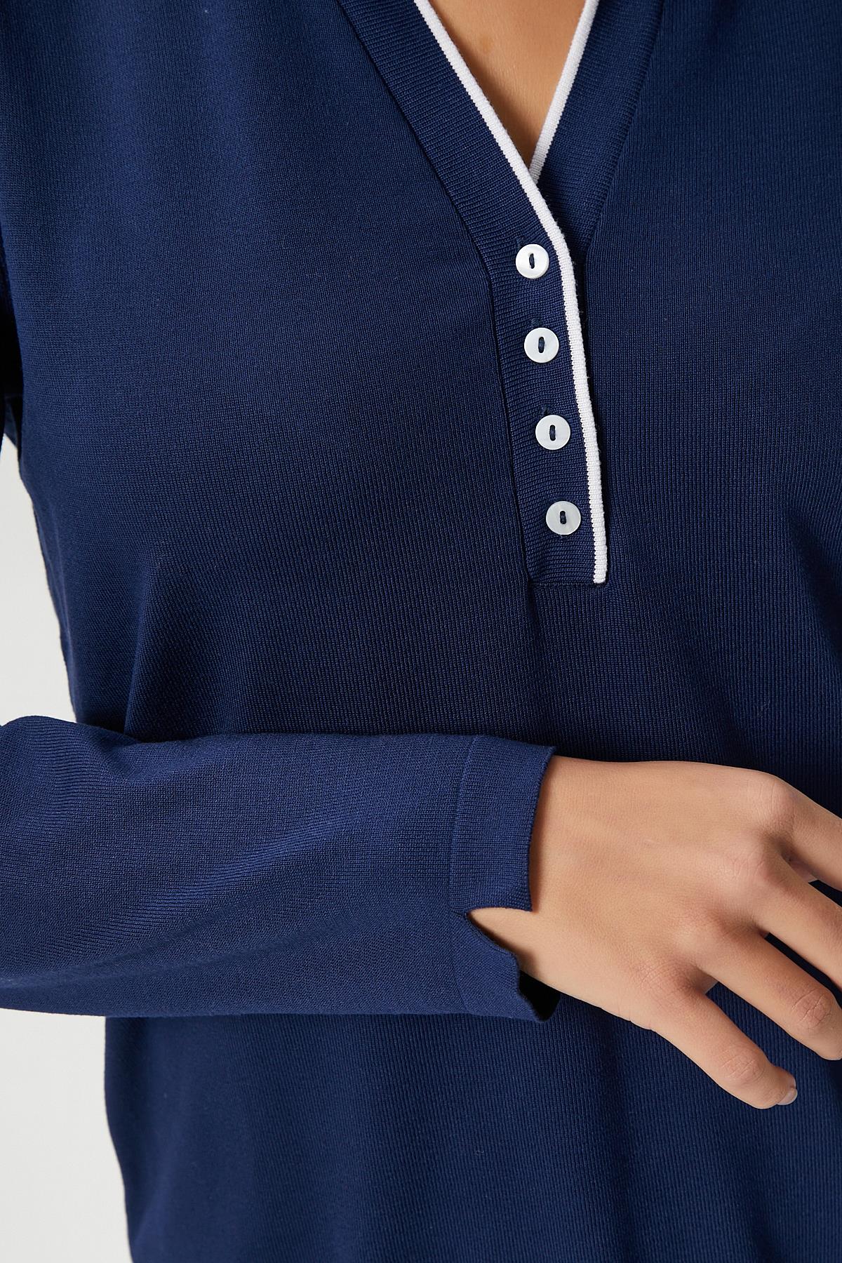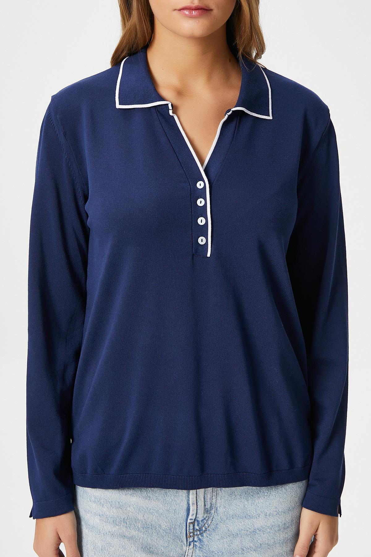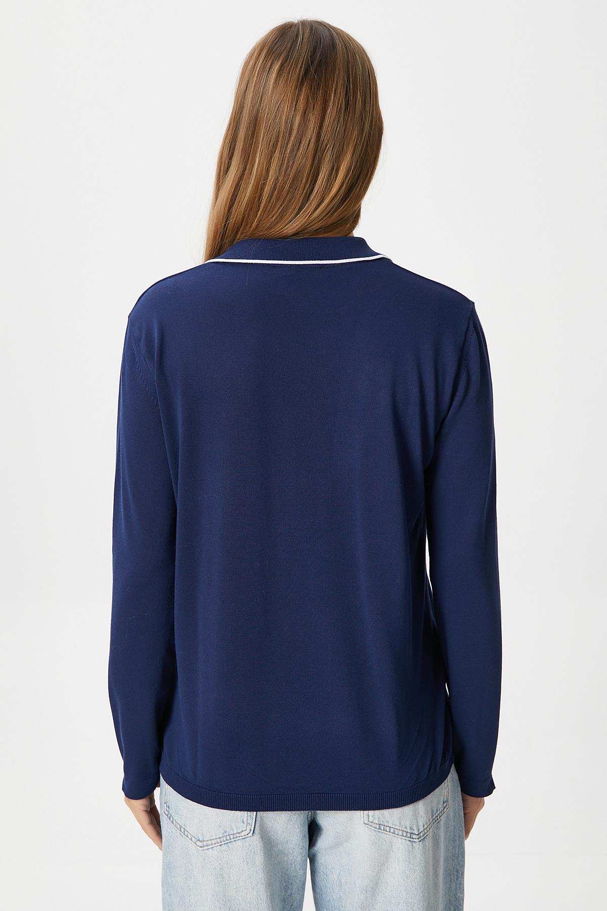 Kadın Elite Viskon Polo Yaka Şeritli Lacivert Beyaz Triko Kazak