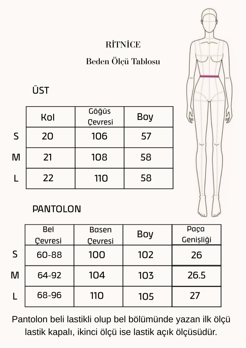Ürün Ölçüleri Pantolon İçin; ( Pantolon beli lastikli olup bel bölümünde yazan ilk ölçü lastik kapalı, ikinci ölçü ise lastik açık ölçüsüdür)