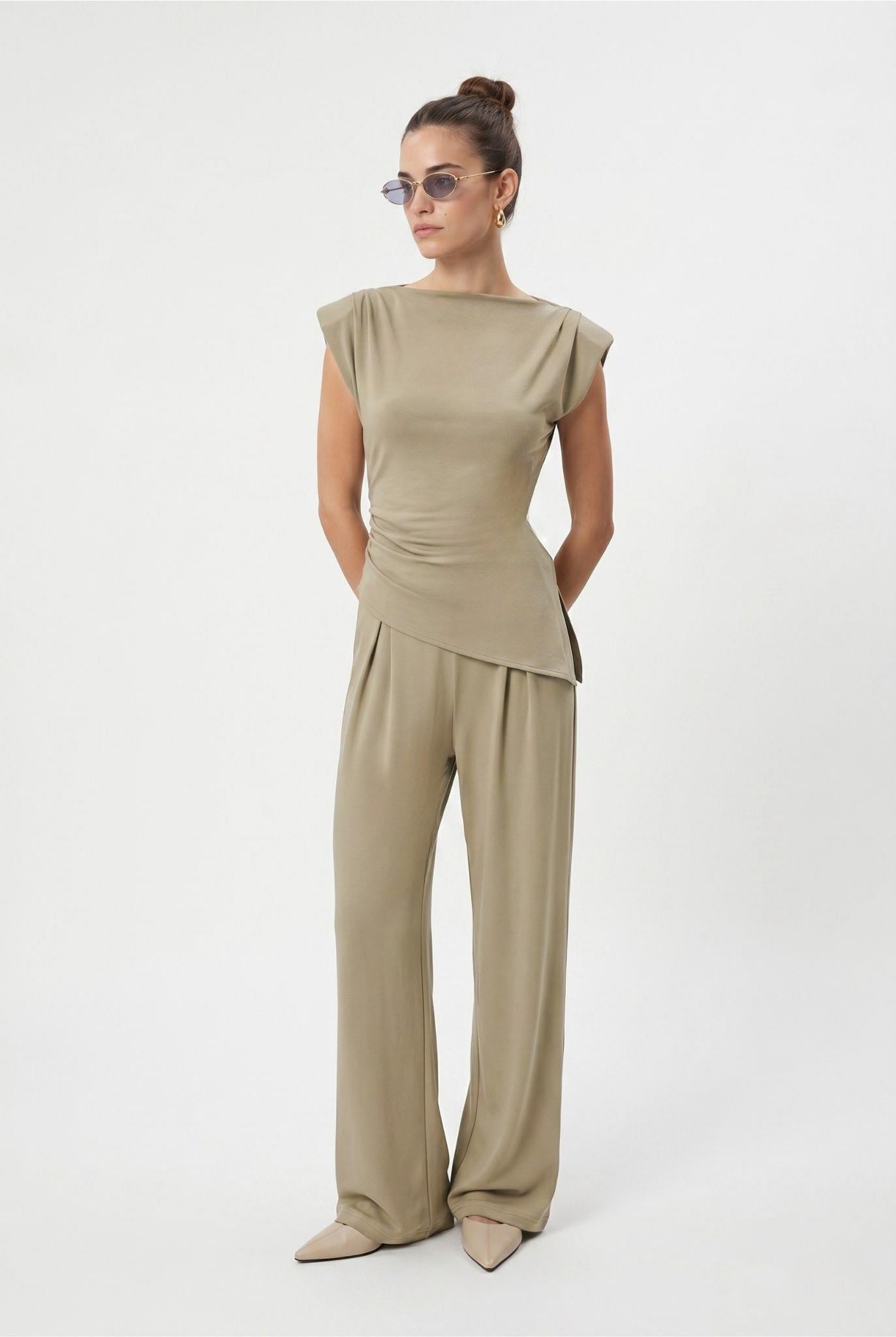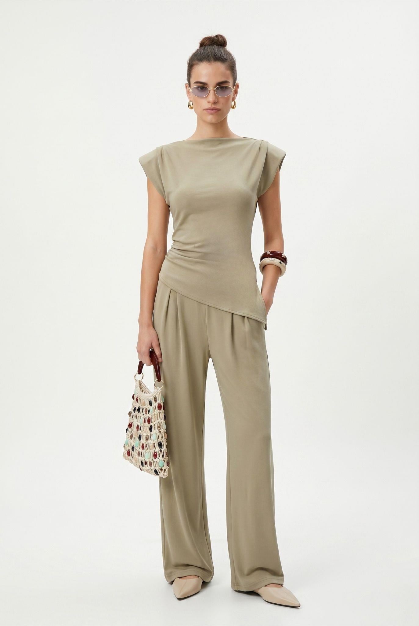 Kadın Elvis Modal Touch Vatkalı Asimetrik Bluz Bel Lastikli Haki Alt Üst Takım