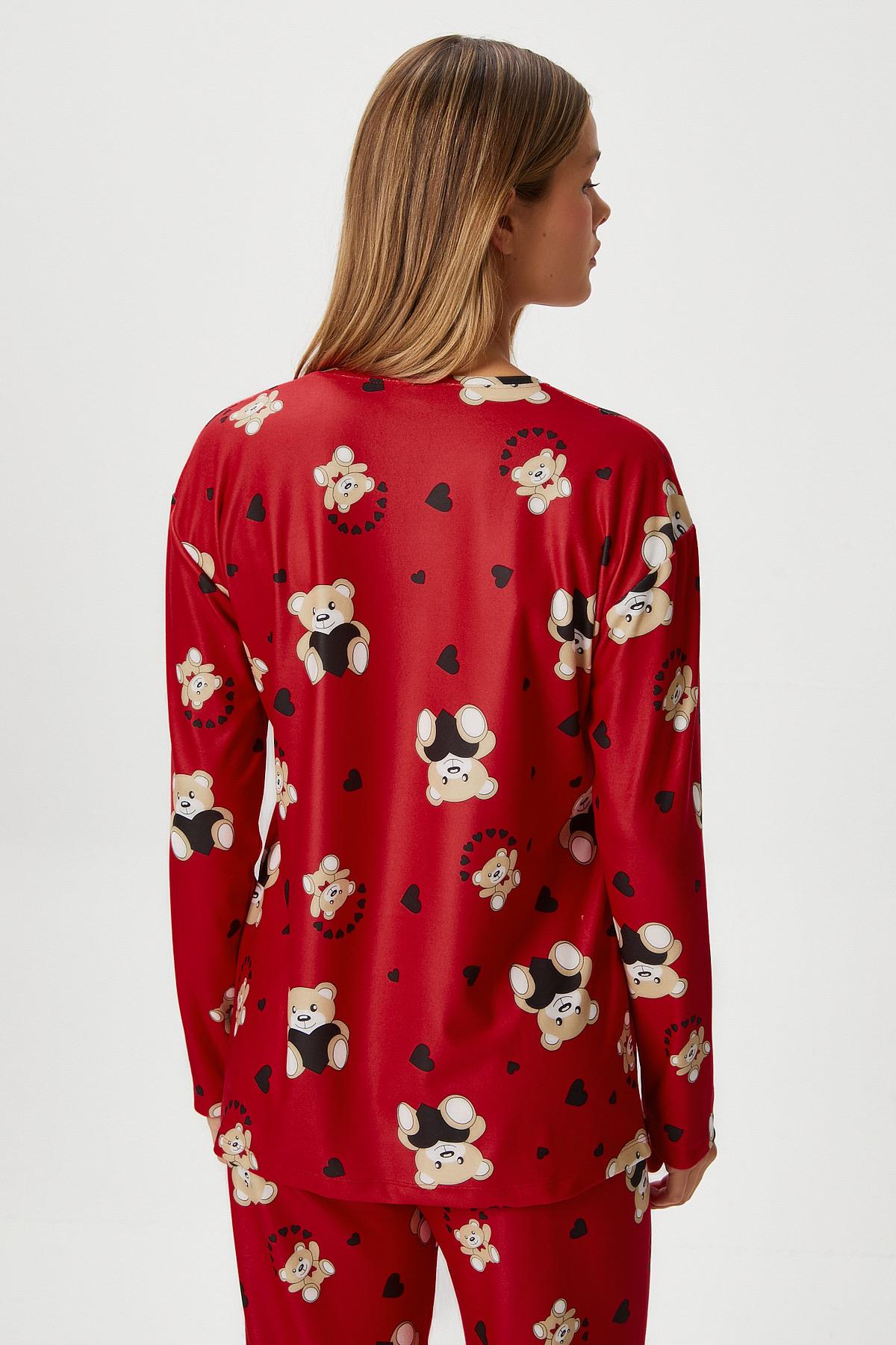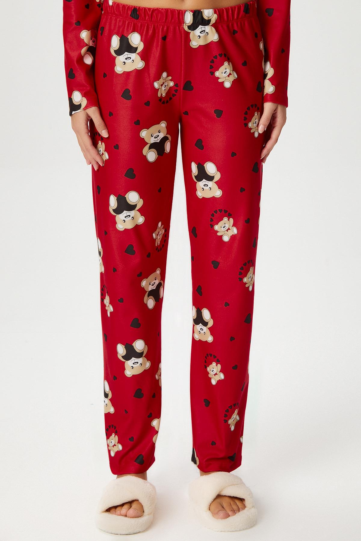 Kadın Ely Premium Bisiklet Yaka Kırmızı Ayıcık Süet Doku Yılbaşı Pijama Takımı