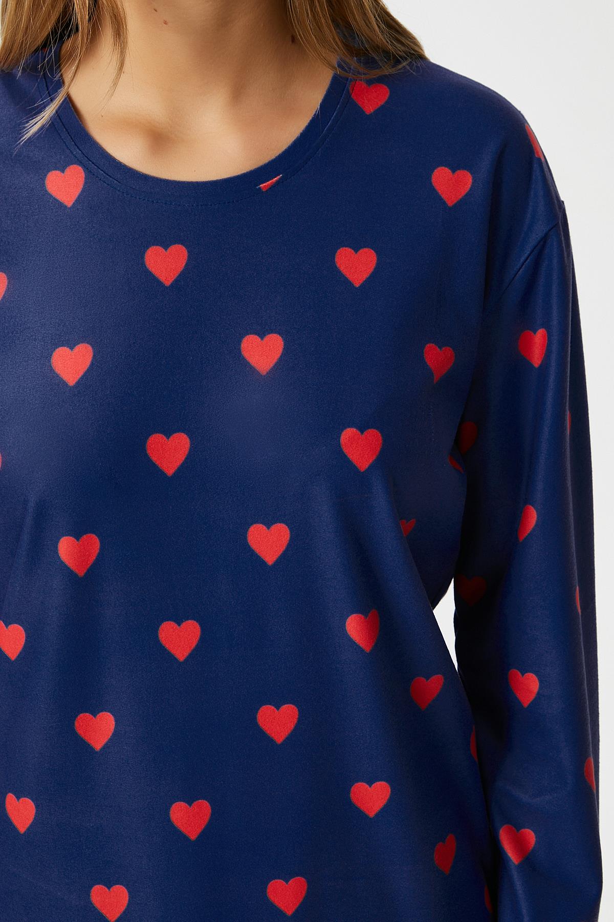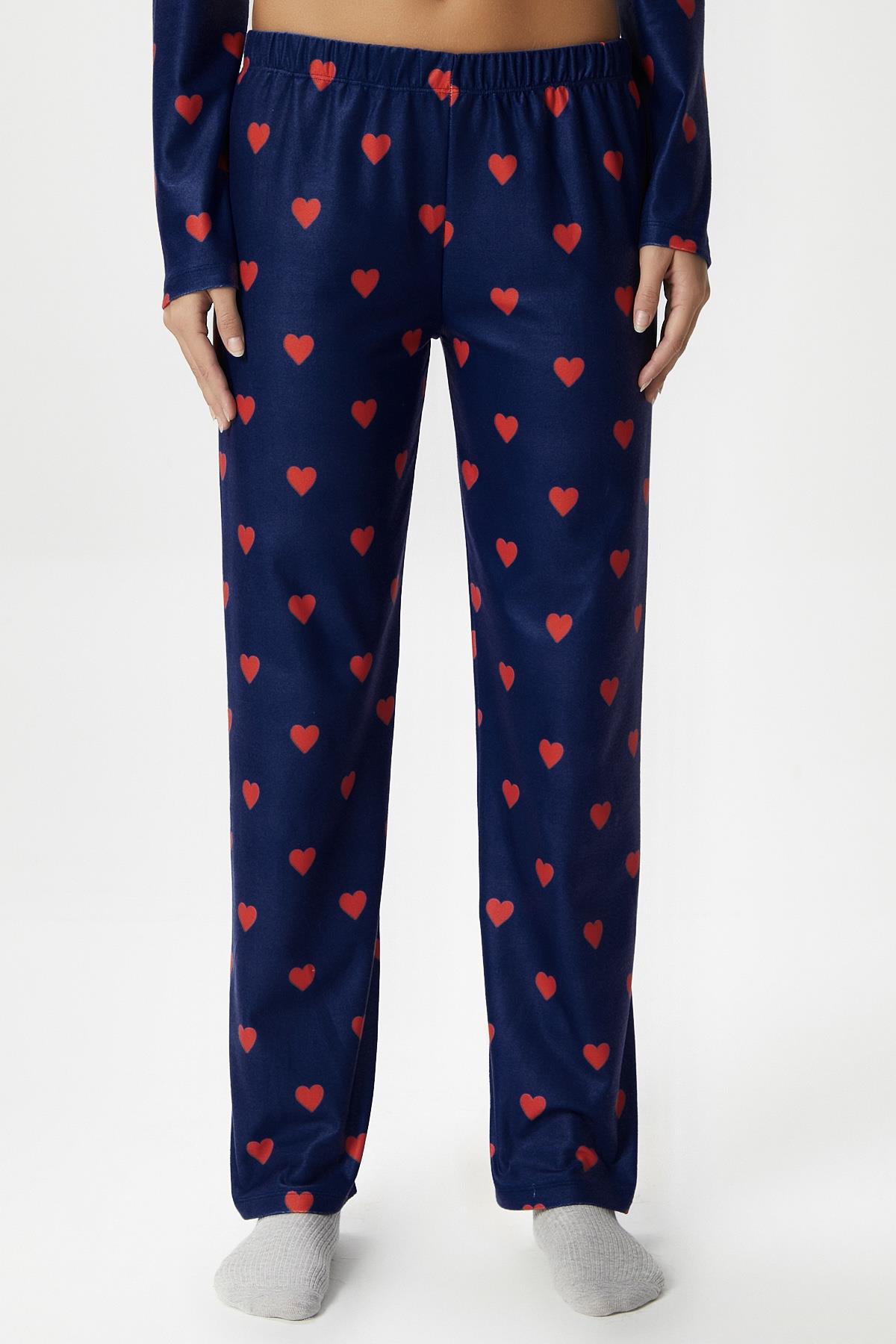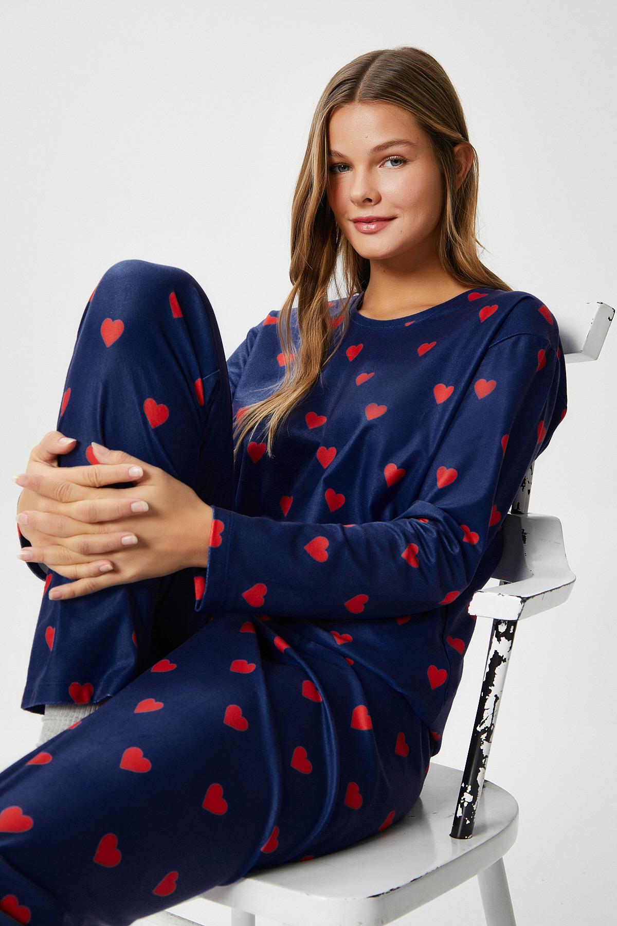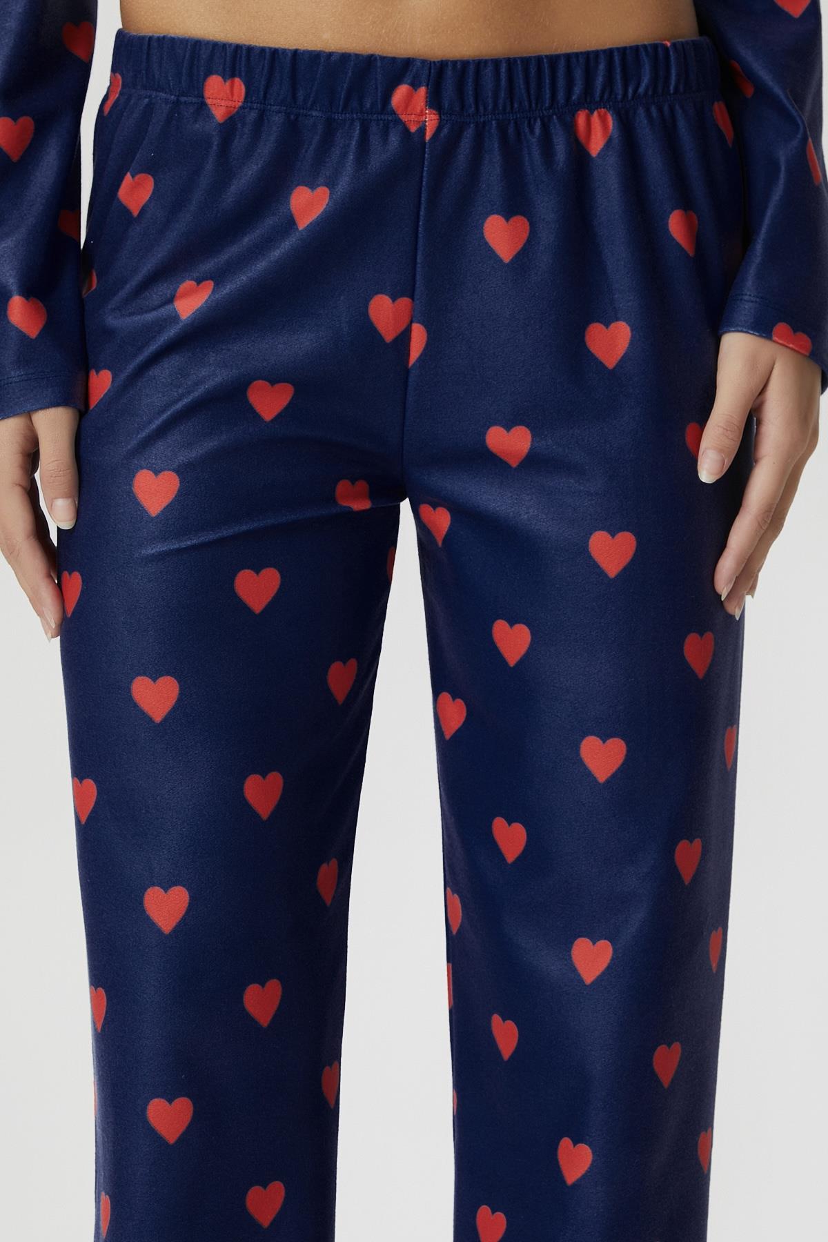 Kadın Ely Premium Bisiklet Yaka Lacivert Kalp Süet Doku Yılbaşı Pijama Takımı