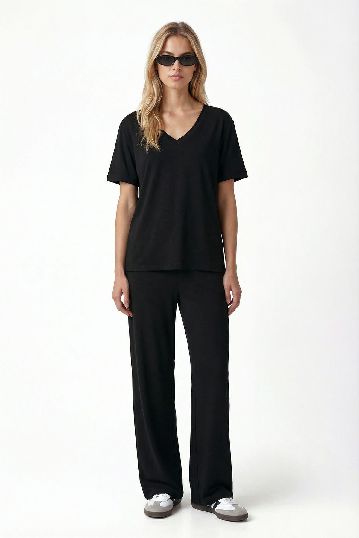 - V yaka detayı ile feminen bir dokunuş katarken, kısa kollu üst ve geniş paça pantolon rahatlığı bir arada sunar.