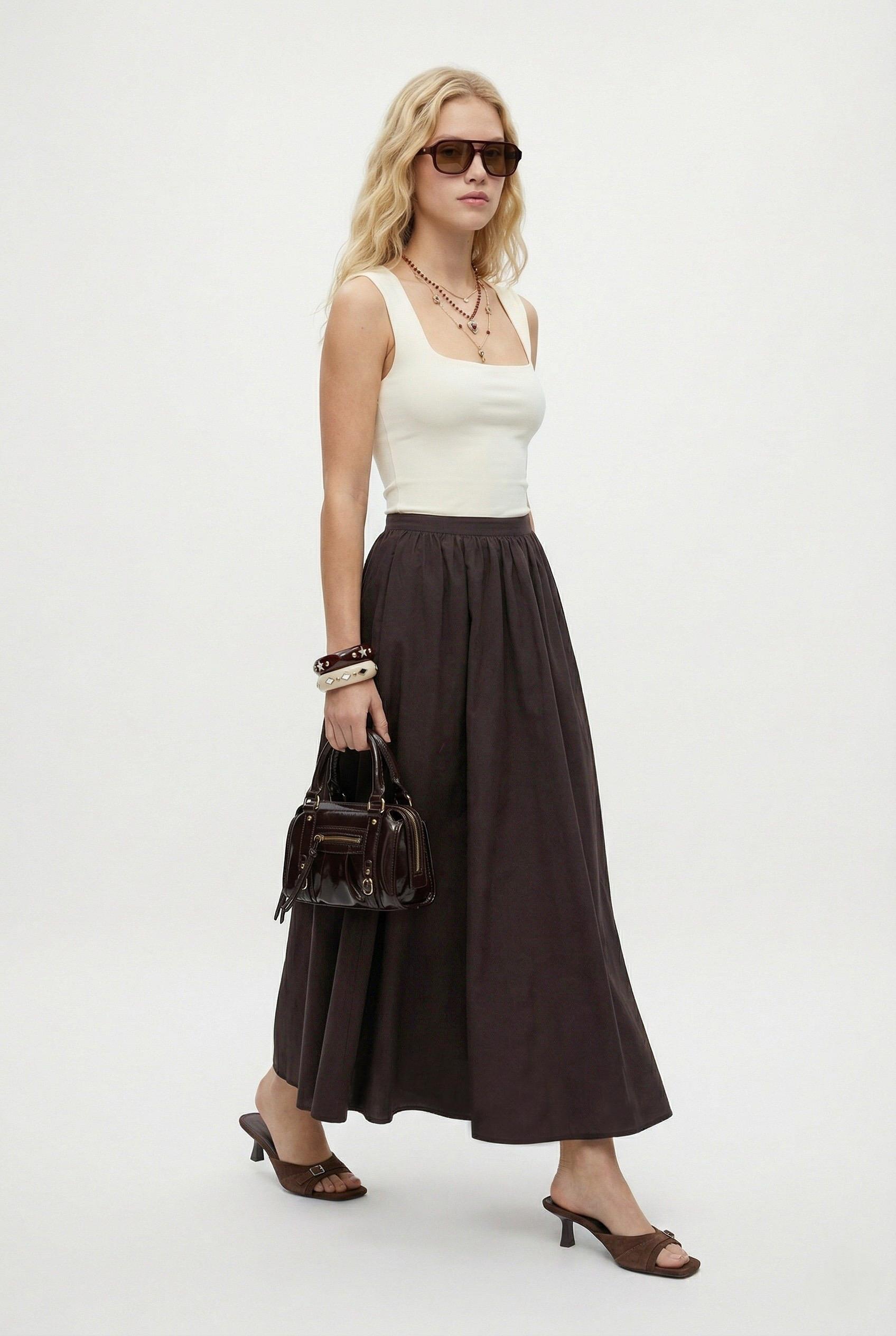 Kadın Emilia Astarlı Fermuarlı Beli Büzgülü Kahverengi Dokuma Uzun Etek