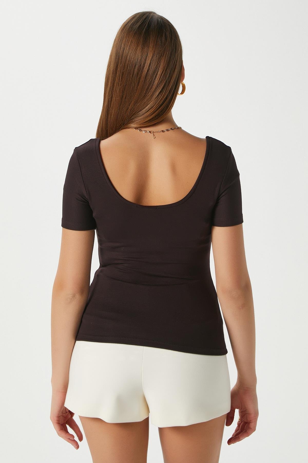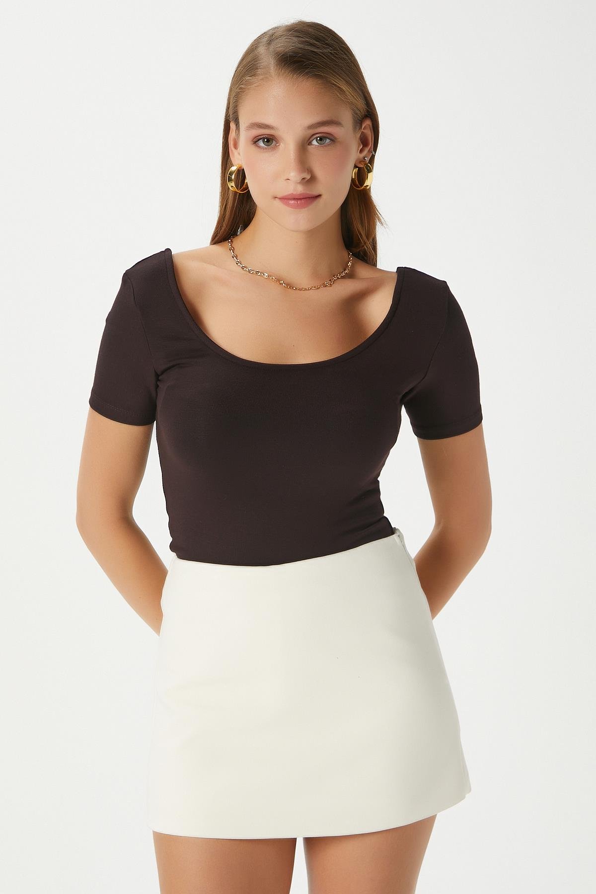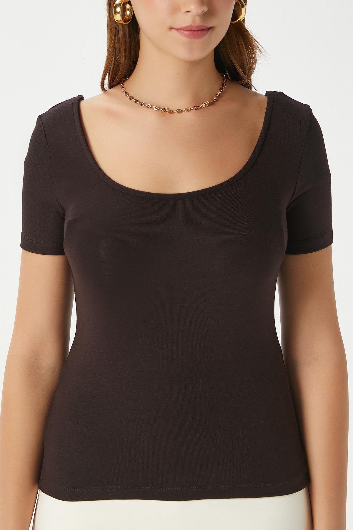 Kadın Favor Lux Touch Yumuşak Doku U yaka Kahve Bluz