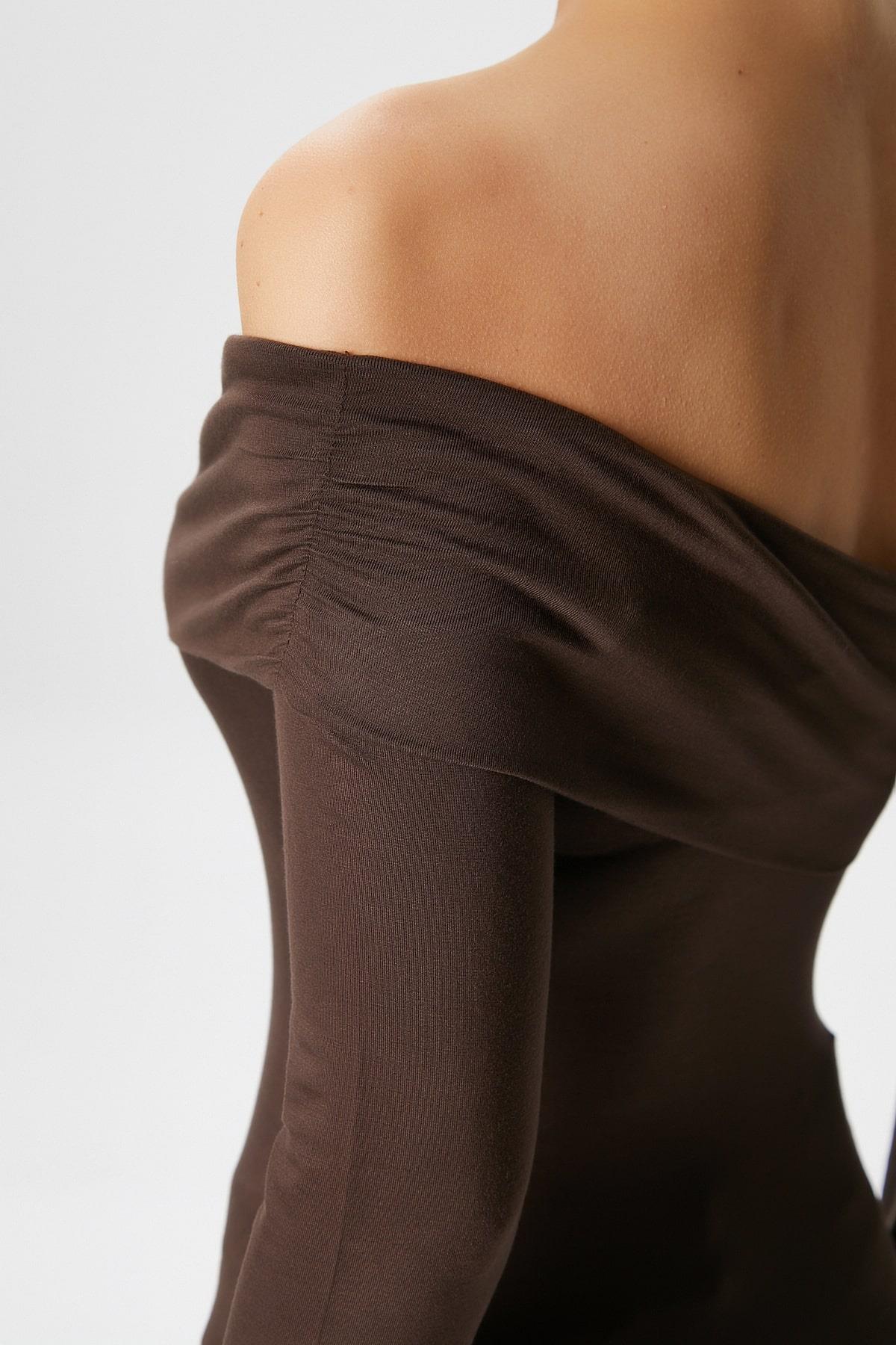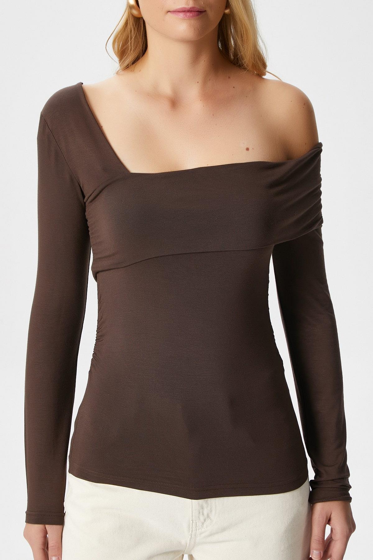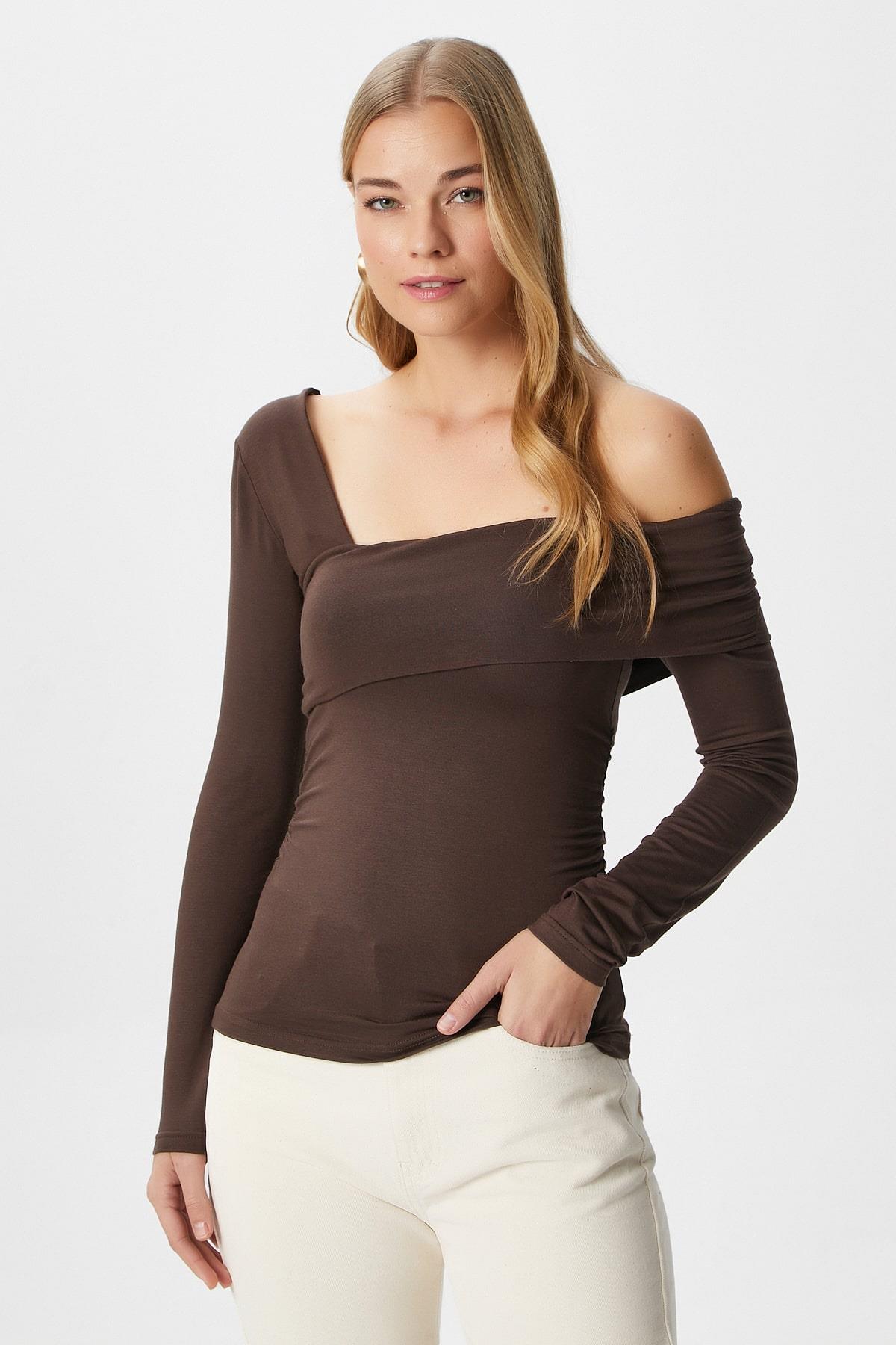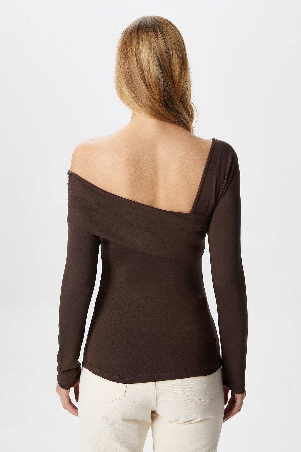 Kadın Fuse Omuz Katlamalı Kahverengi Bluz
