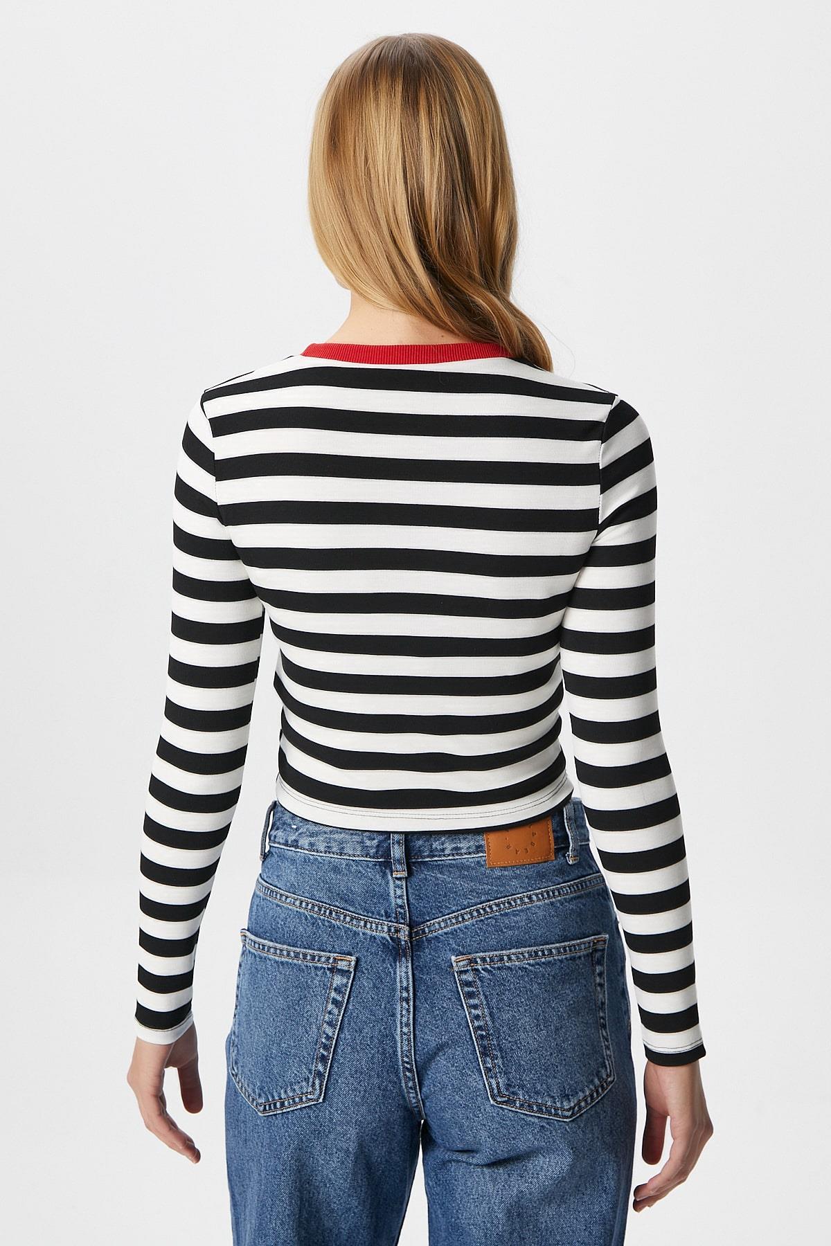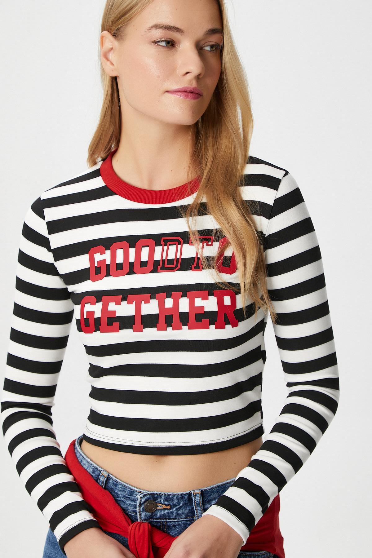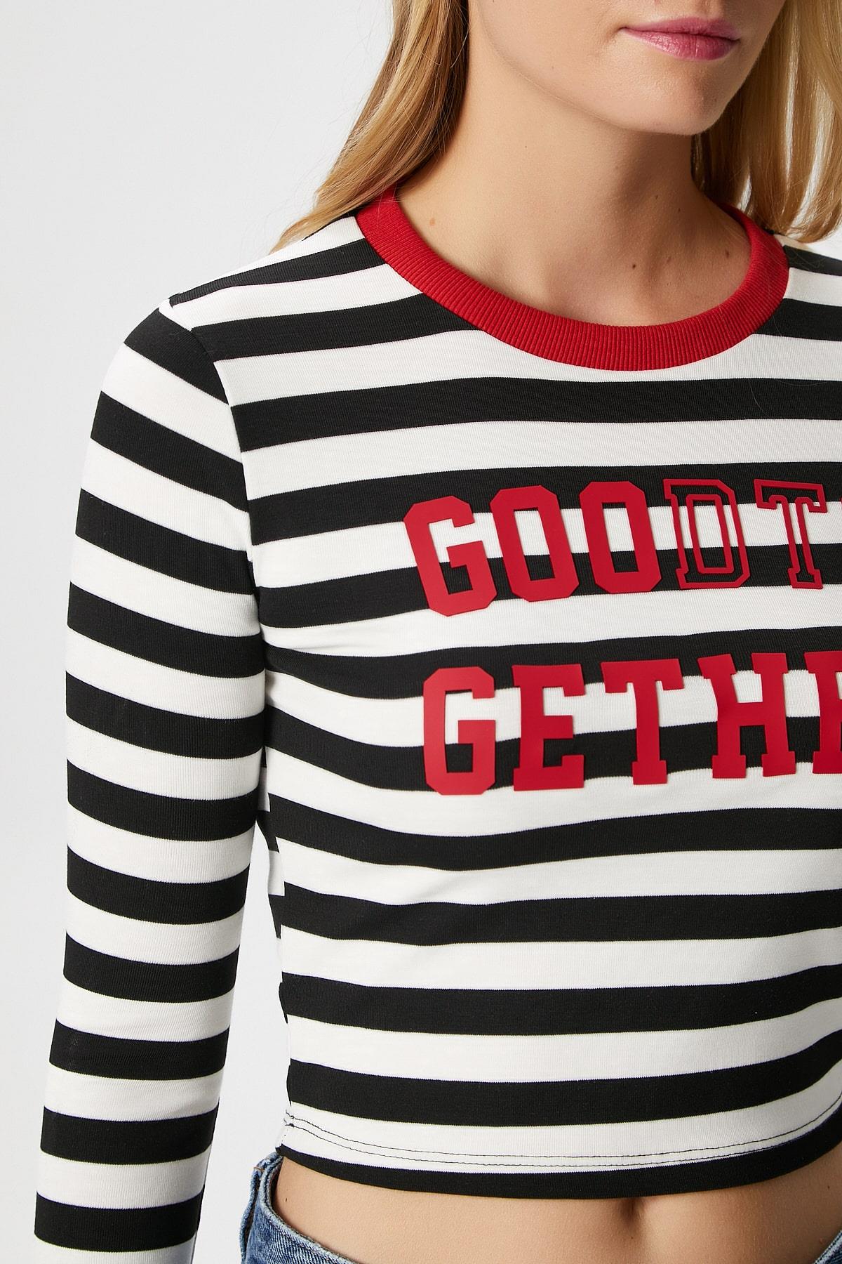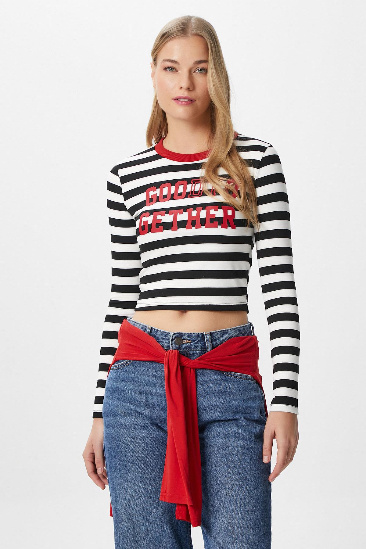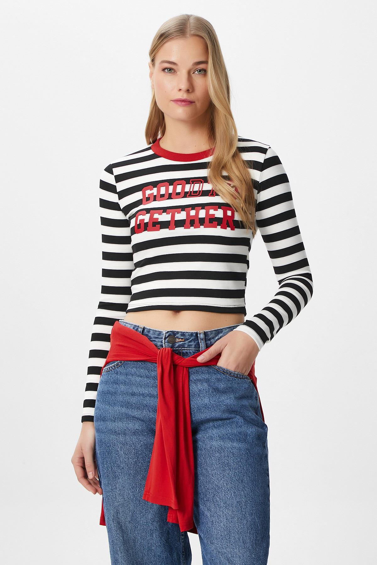 Kadın Good Kırmızı Baskılı Pamuk Siyah Beyaz Çizgili Bluz