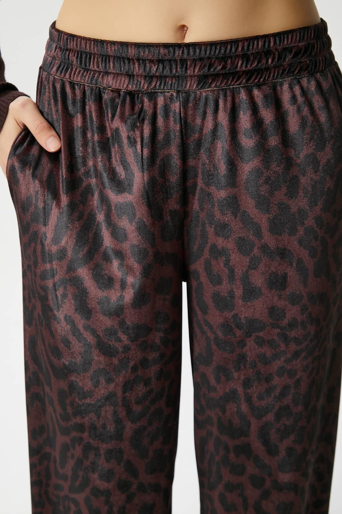 Kadın Hide Kadife Bel Lastikli Cepli Kahverengi Leopar Pantolon