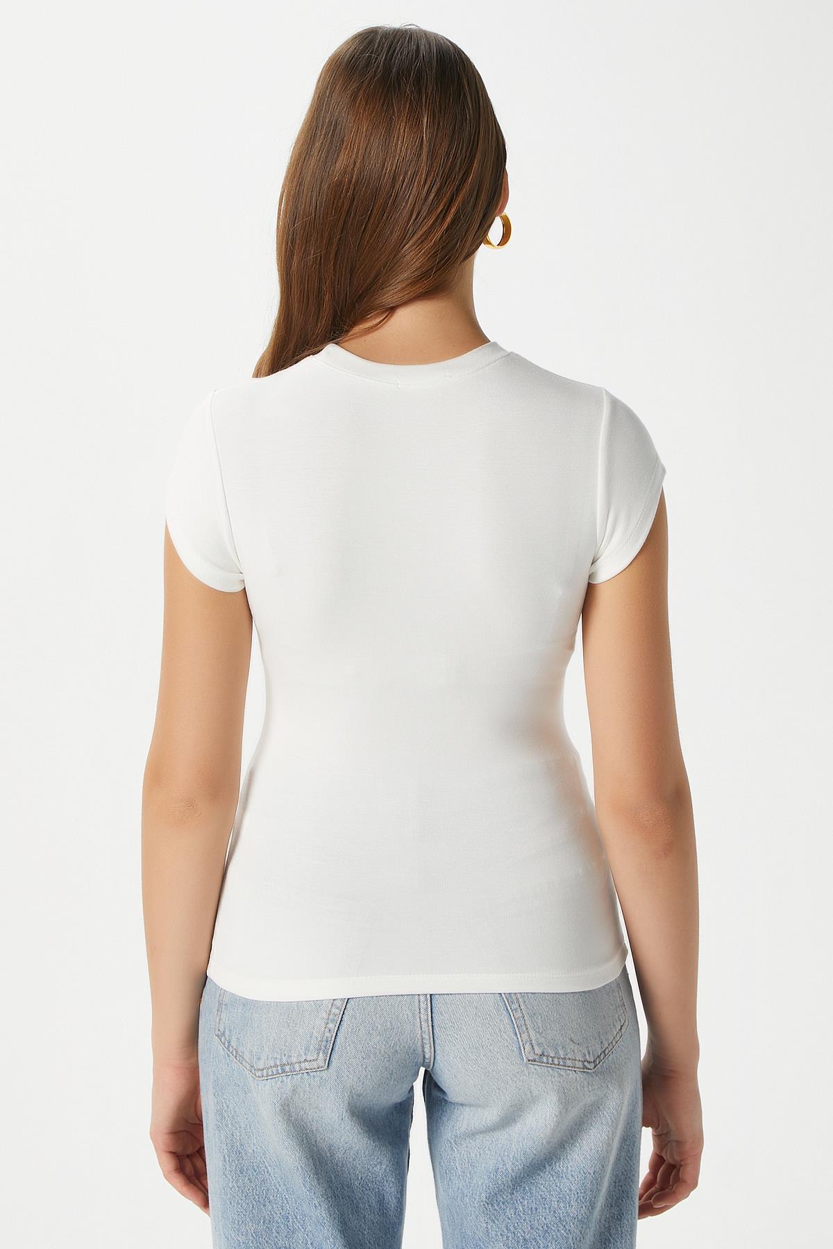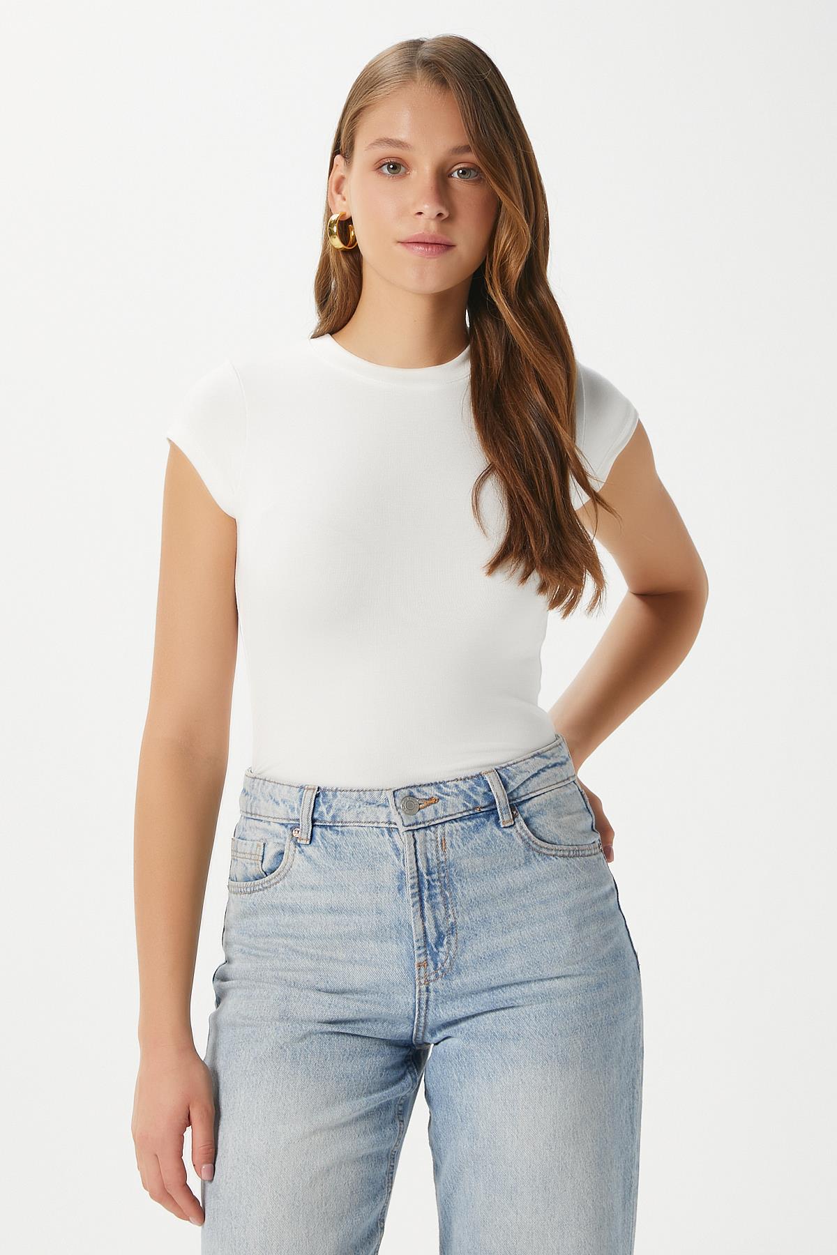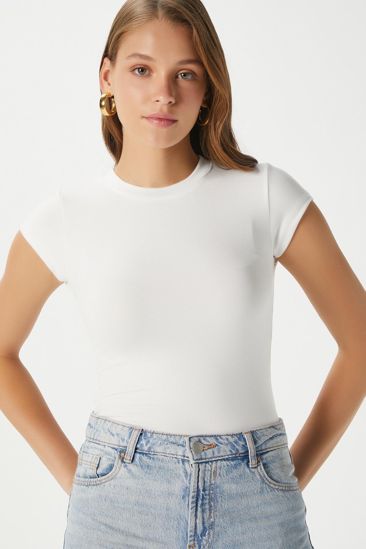 Kadın İnner Lux Touch Yumuşak Doku Bisiklet Yaka Kısa Kol Beyaz Bluz