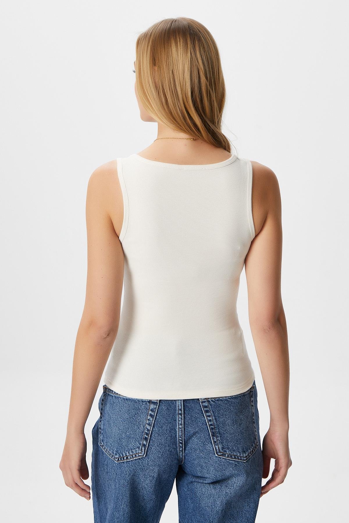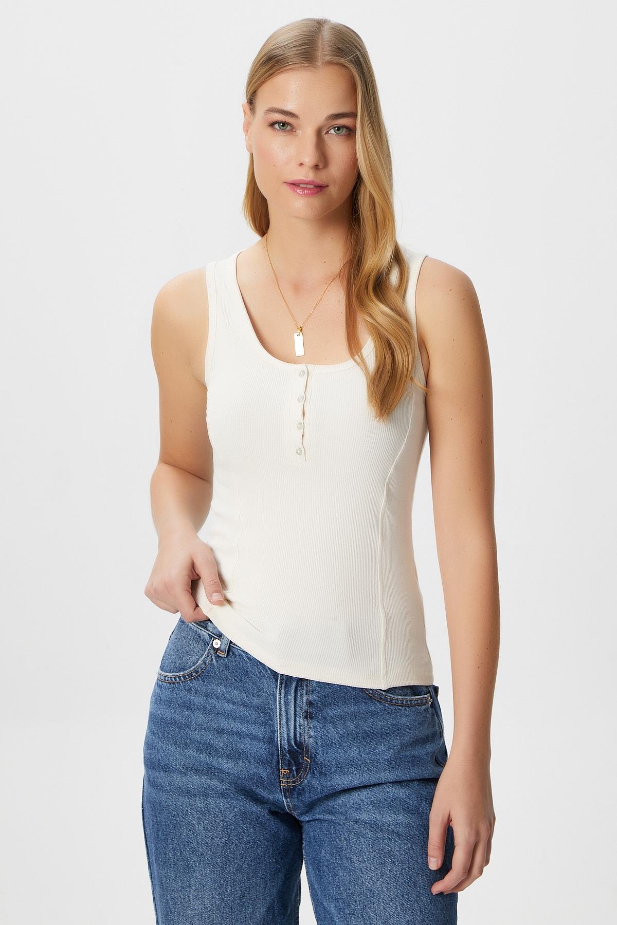 Kadın Jayla Korse Görünümlü Düğmeli Fitilli Kolsuz Açık Bej Bluz