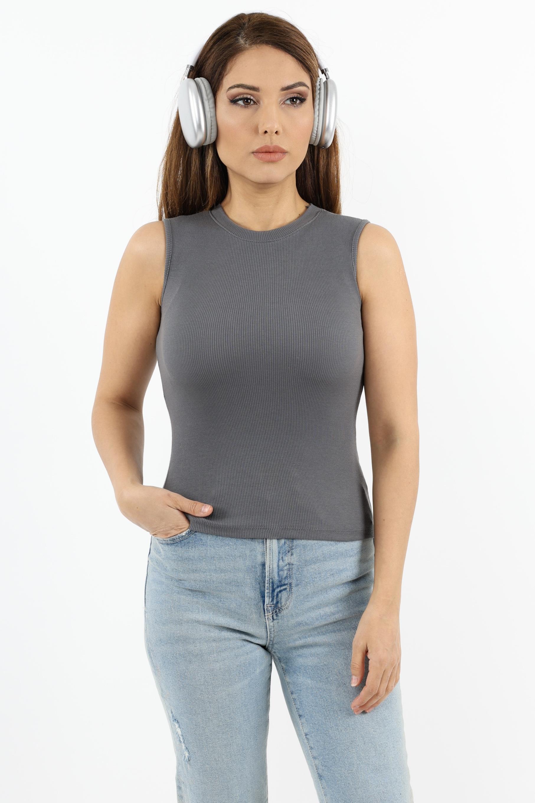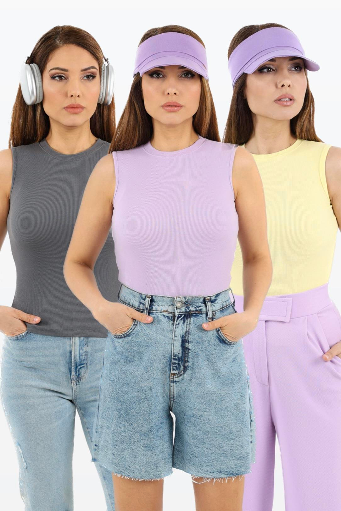 Kadın Kapalı Yaka 3’lü Pamuk Lila, Antrasit, Sarı Düz Kol Fitilli Atlet