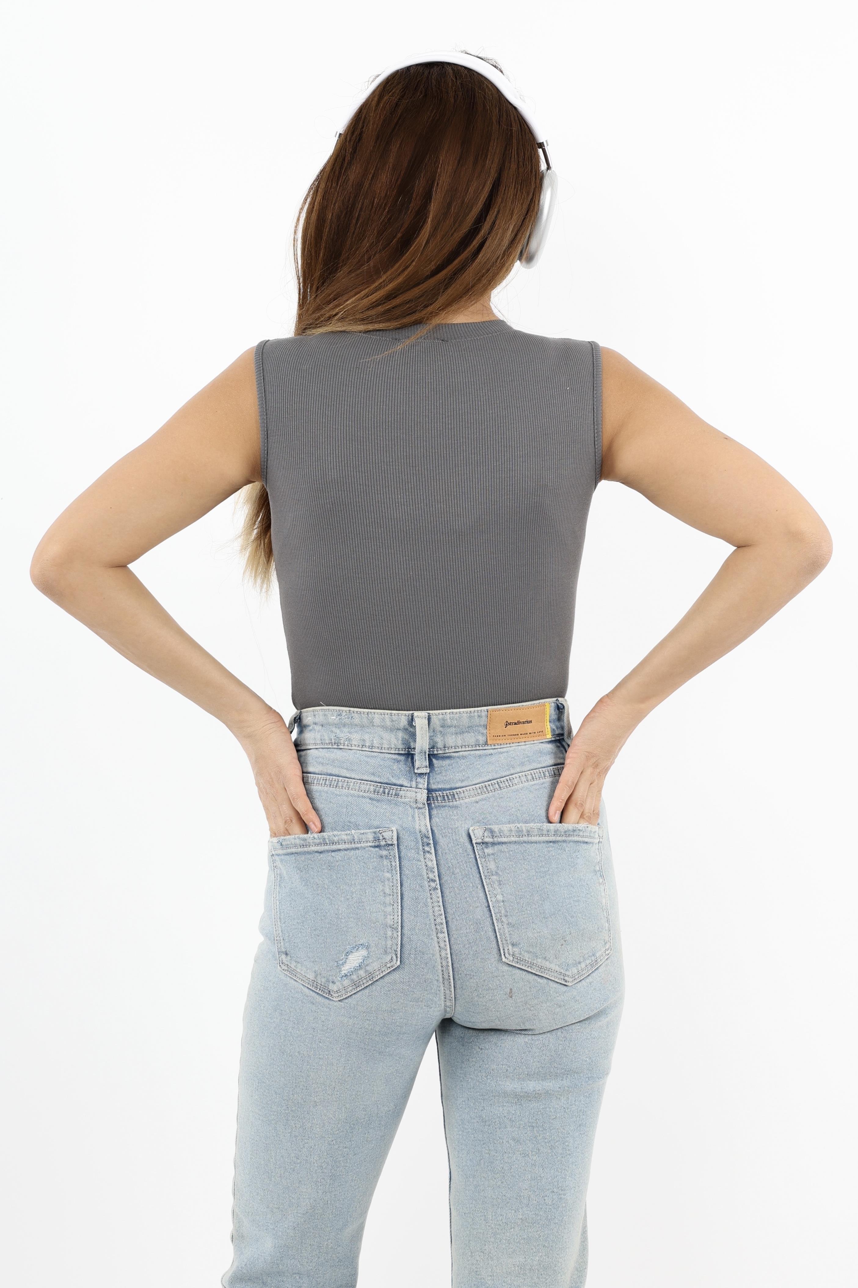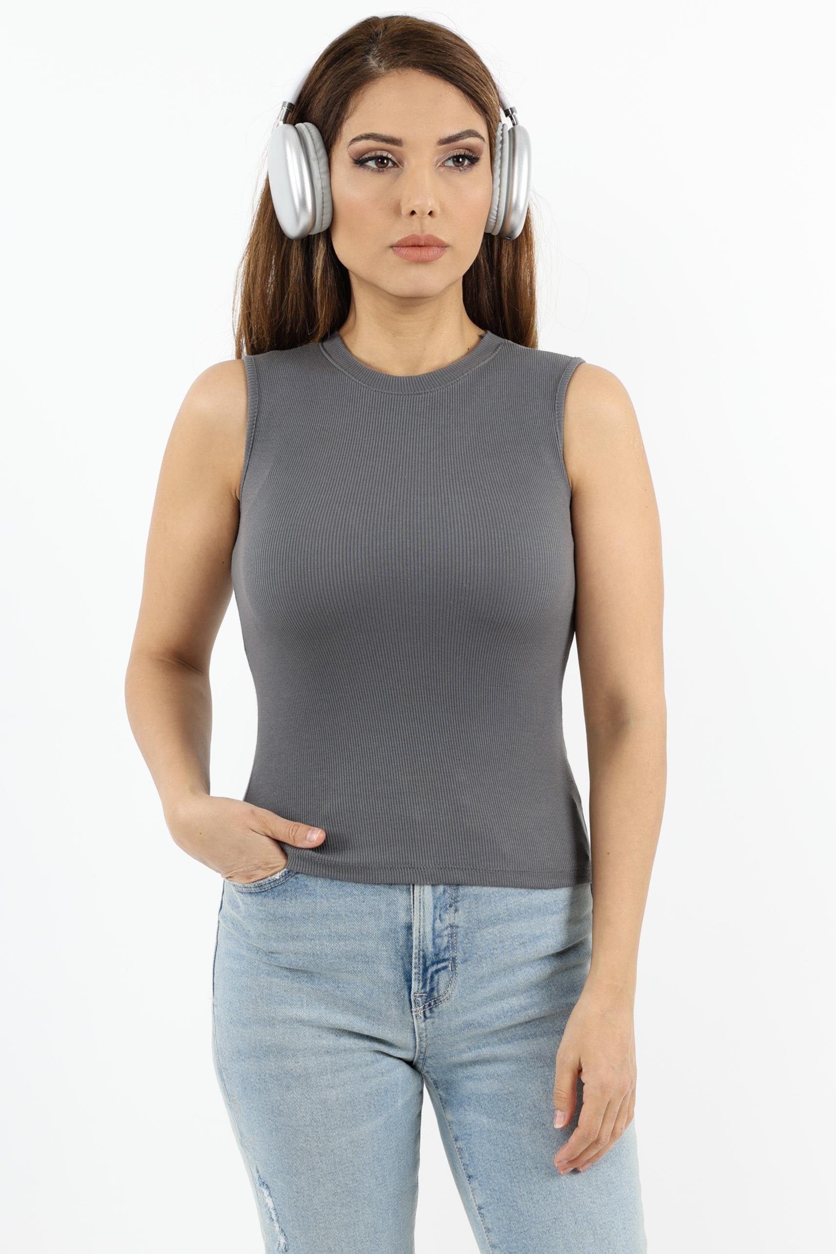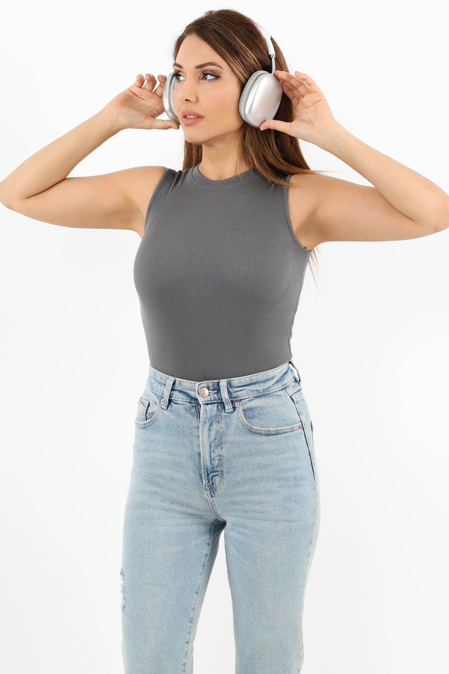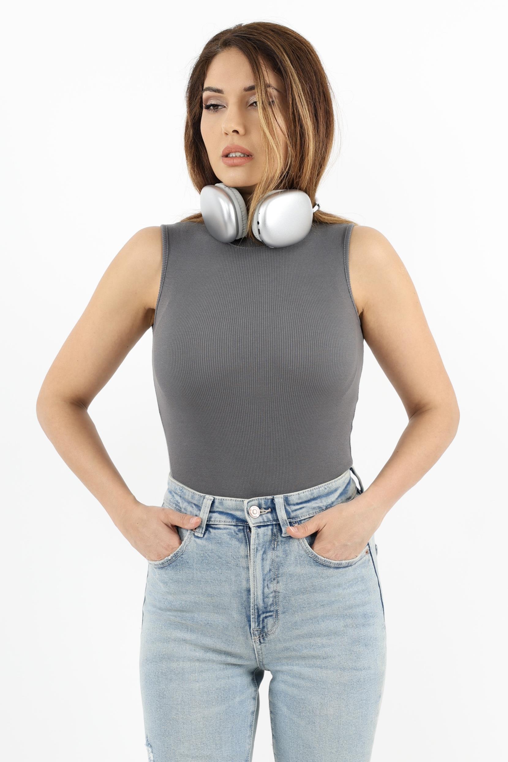 Kadın Kapalı Yaka Pamuk Antrasit Düz Kol Fitilli Atlet