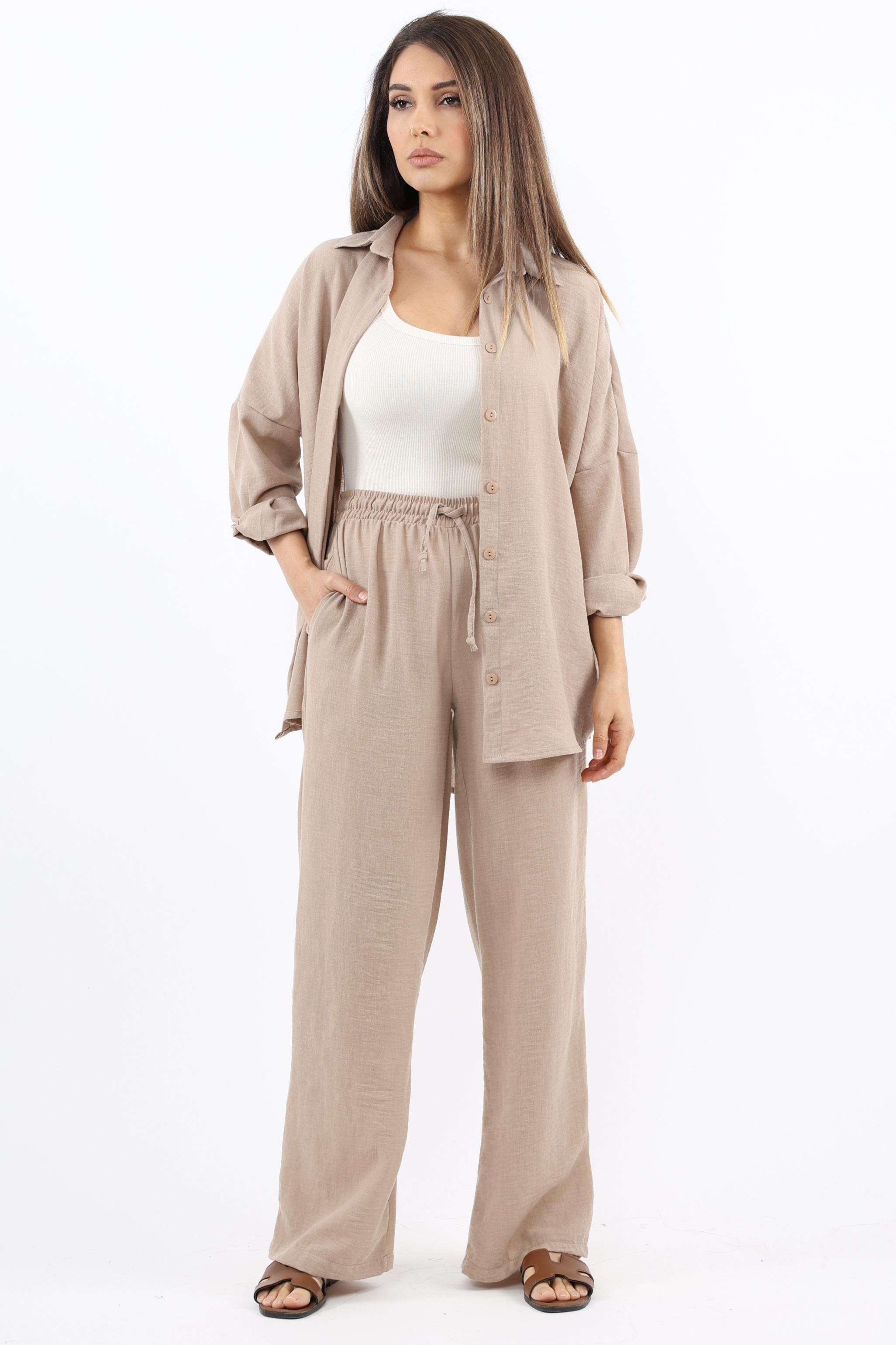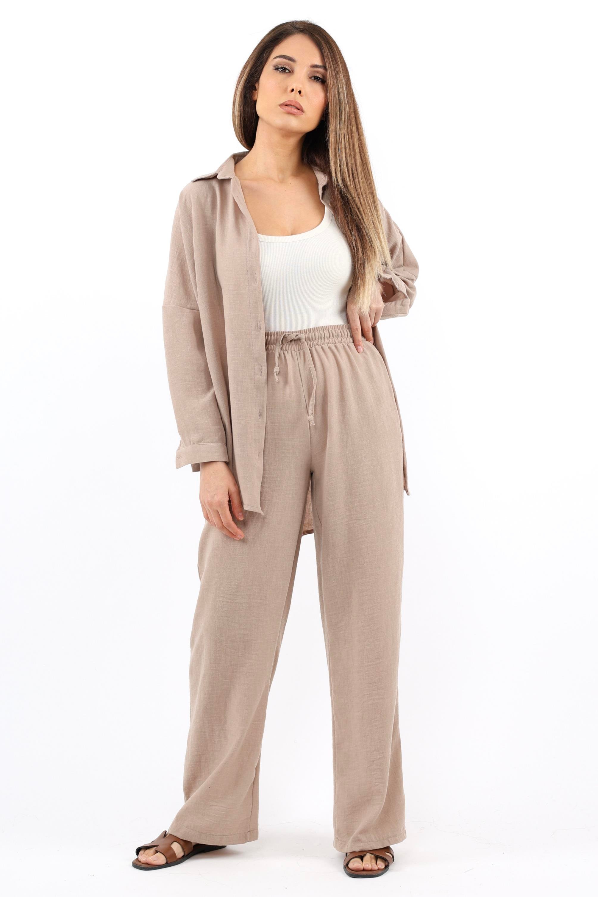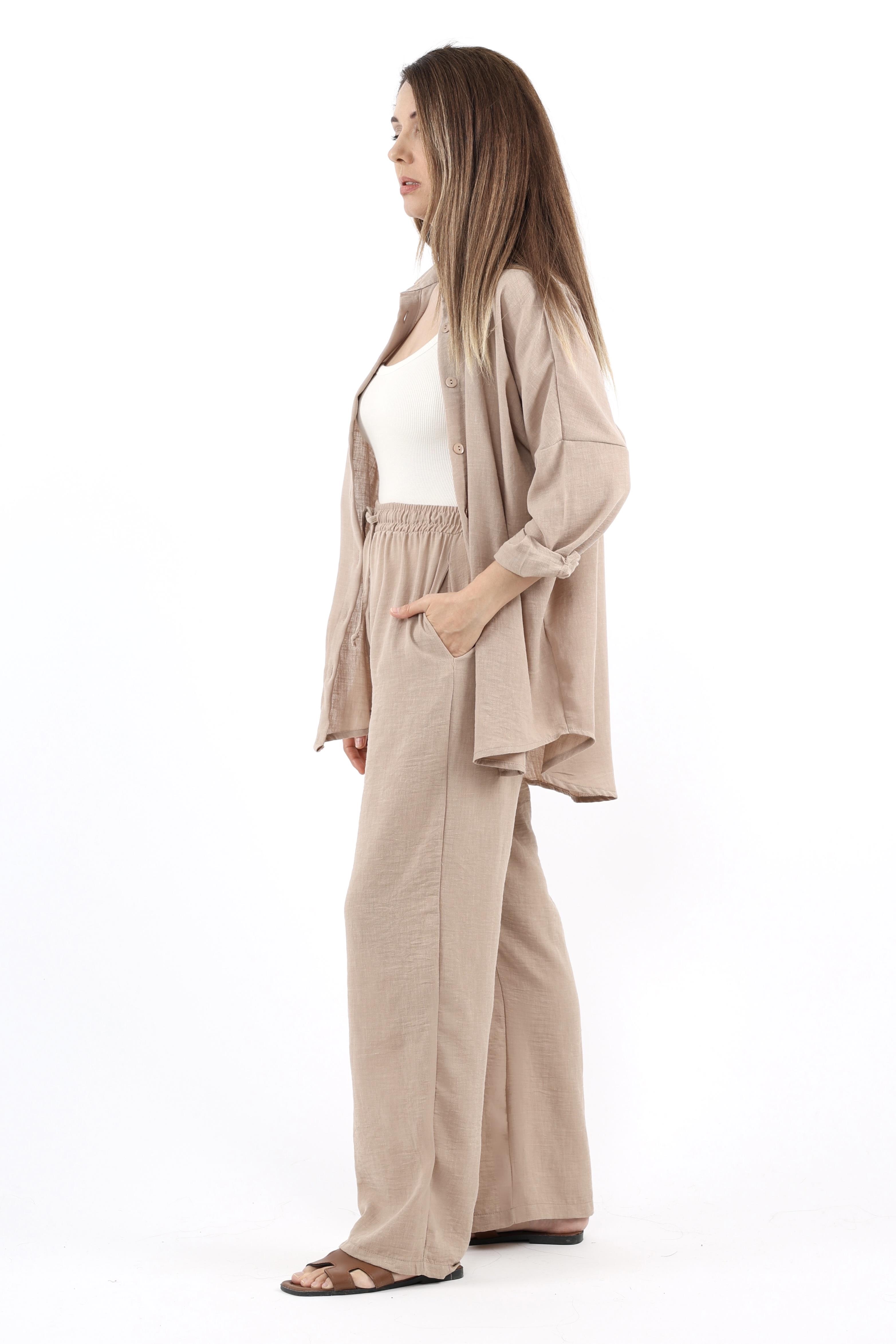 %50 keten, %25 viscose, %25 polyesterModel boy 170 cm Kilo 56kgÇekimde kullanılan ürün S bedenGömlek ürün boyu 81 cm . Pantolon Ürün boyu 106cm