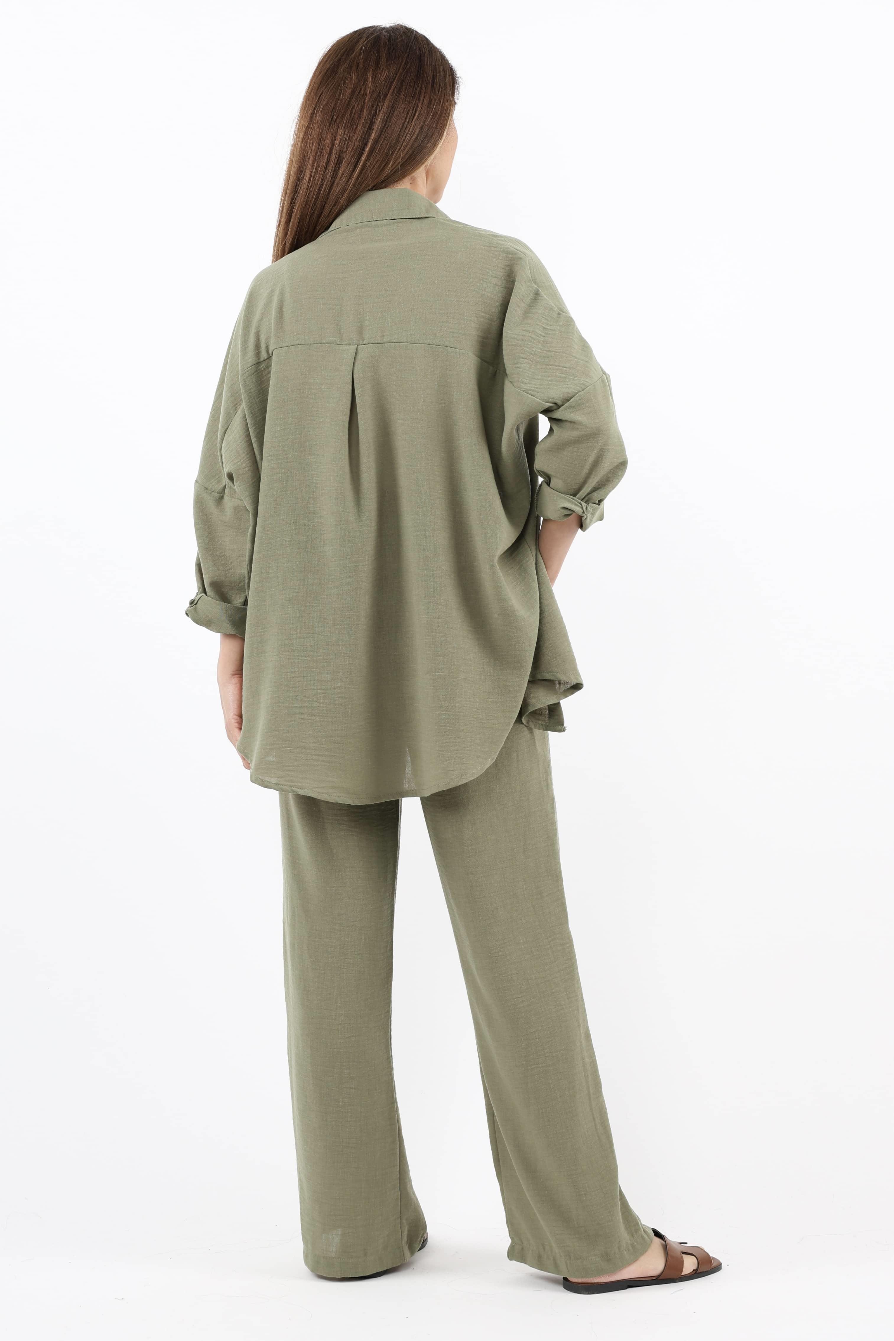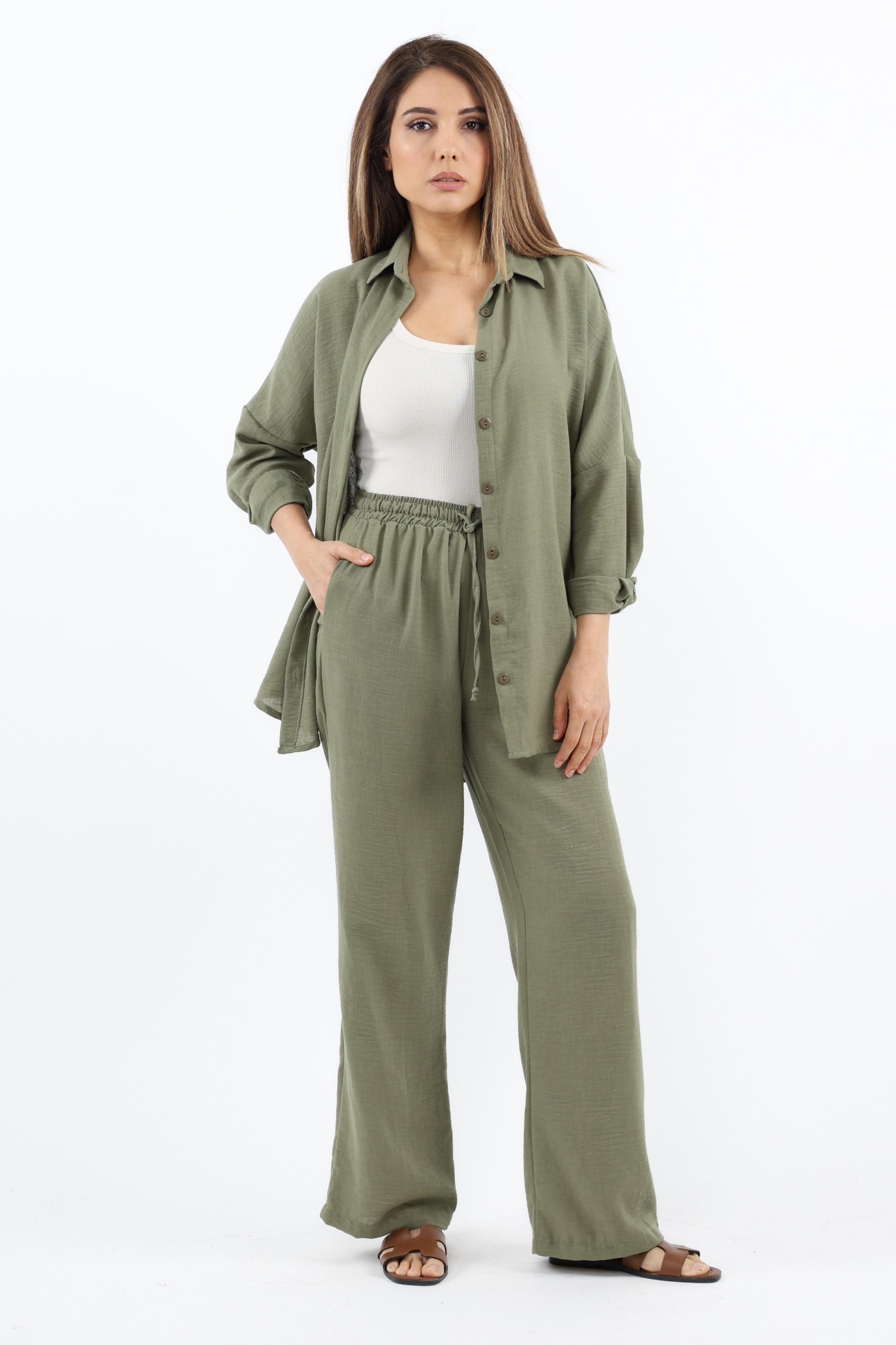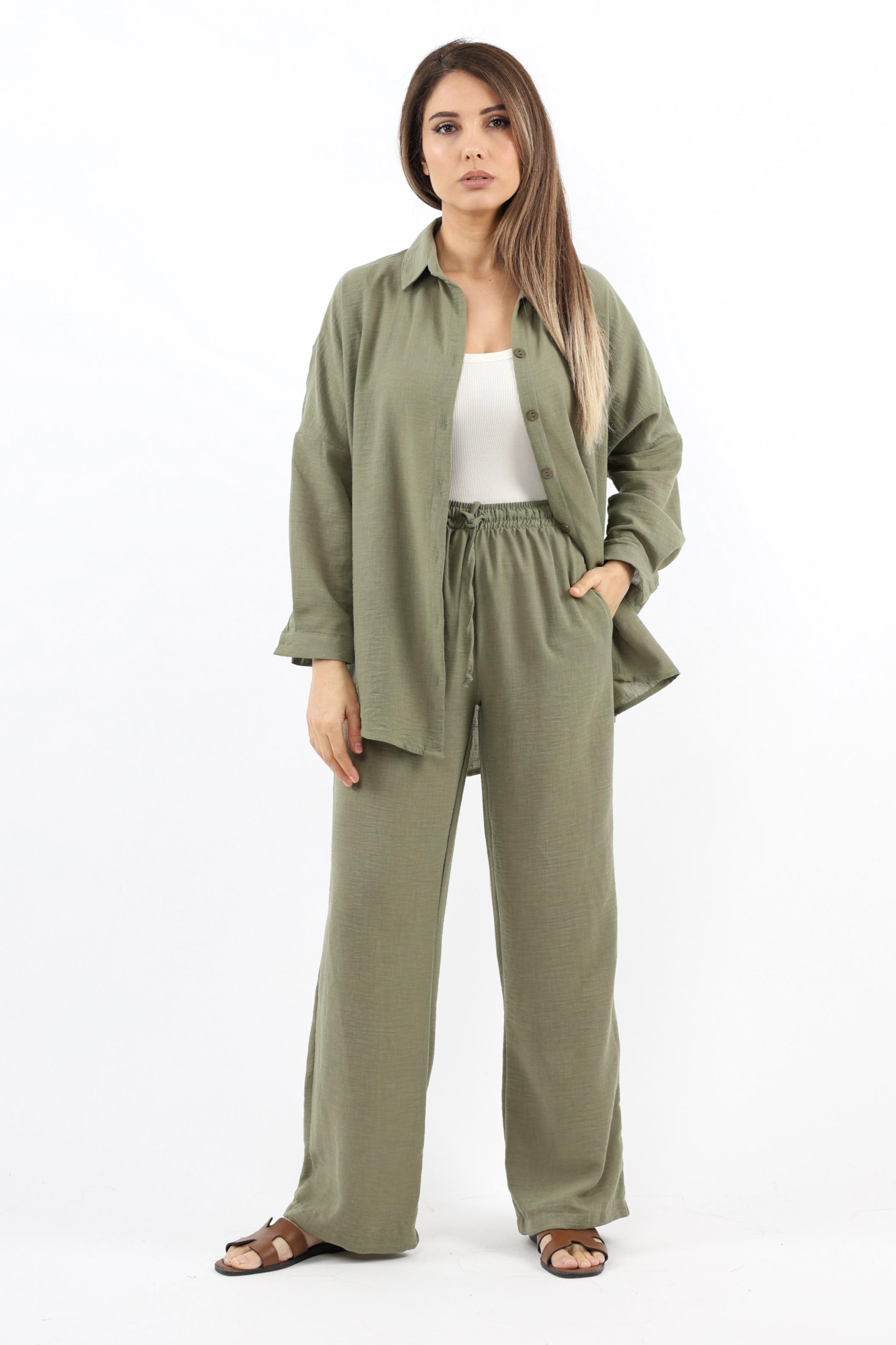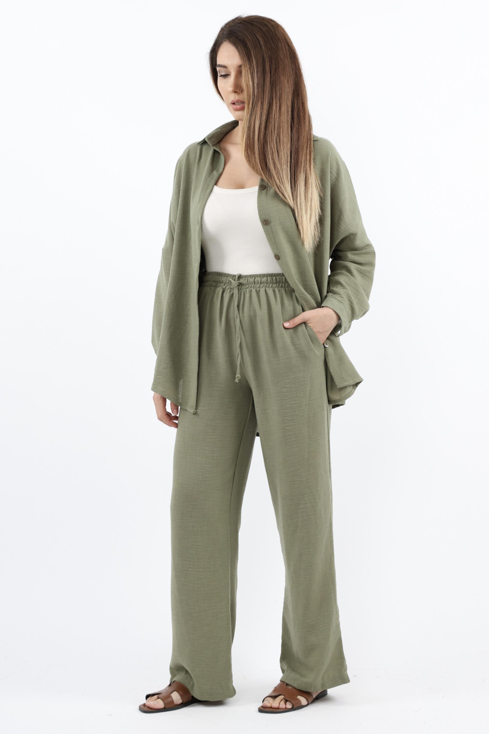 %50 keten, %25 viscose, %25 polyesterModel boy 170 cm Kilo 56kgÇekimde kullanılan ürün S bedenGömlek ürün boyu 81 cm . Pantolon Ürün boyu 106cm