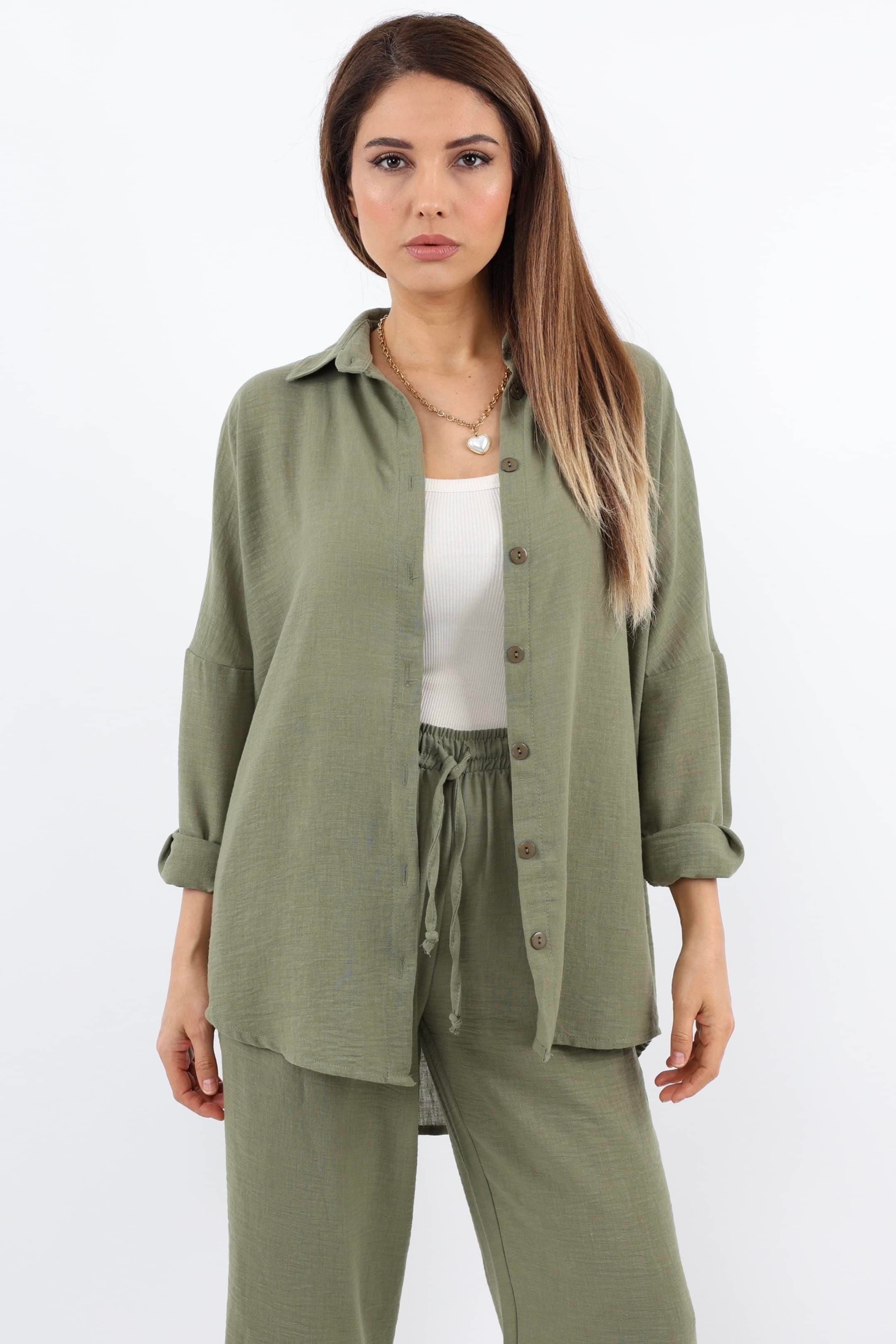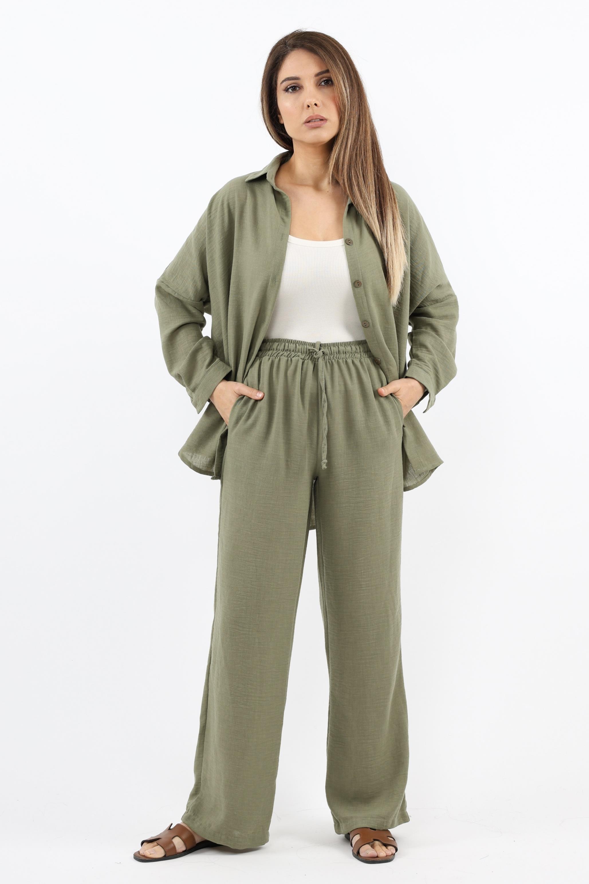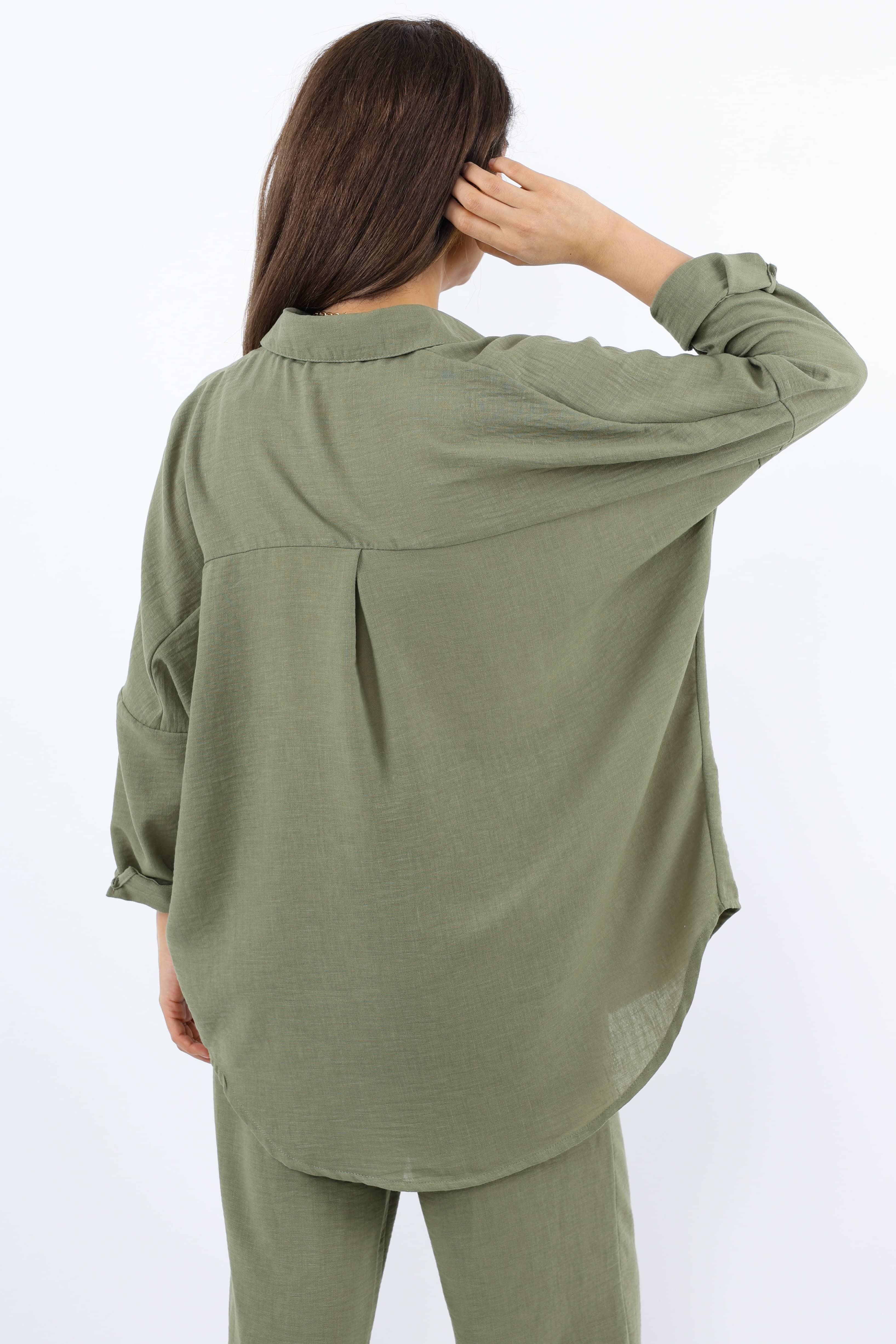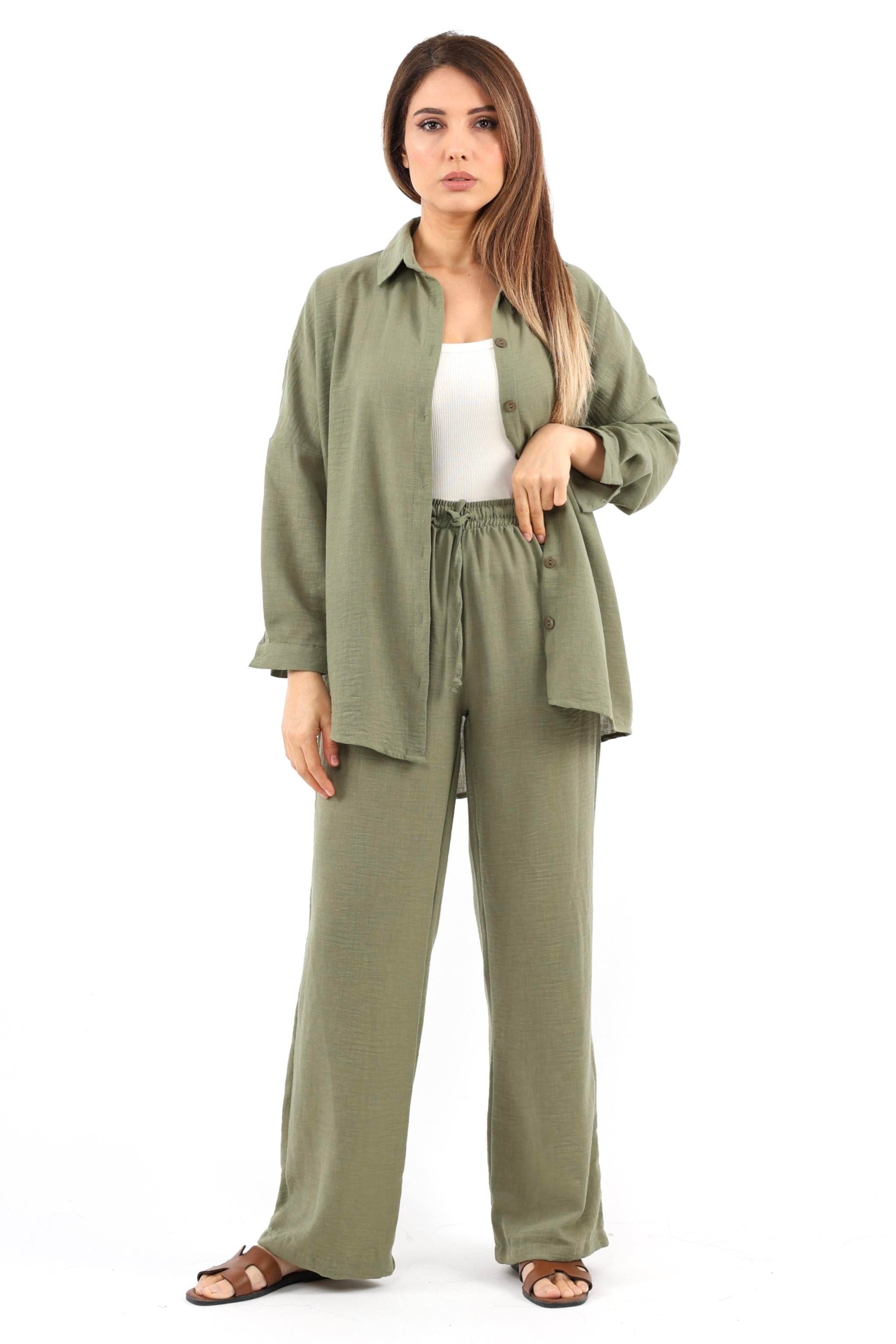 %50 keten, %25 viscose, %25 polyesterModel boy 170 cm Kilo 56kgÇekimde kullanılan ürün S bedenGömlek ürün boyu 81 cm . Pantolon Ürün boyu 106cm