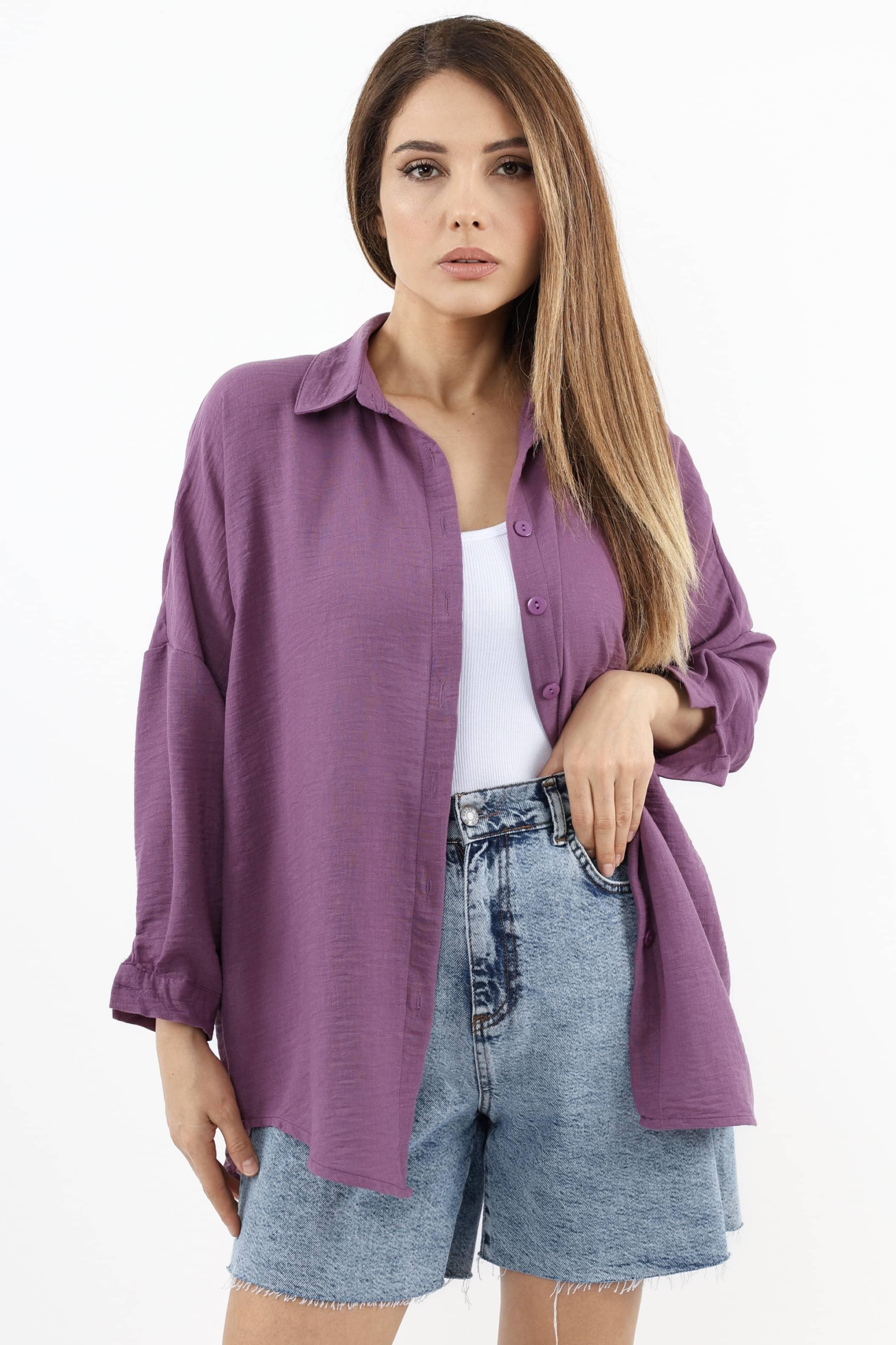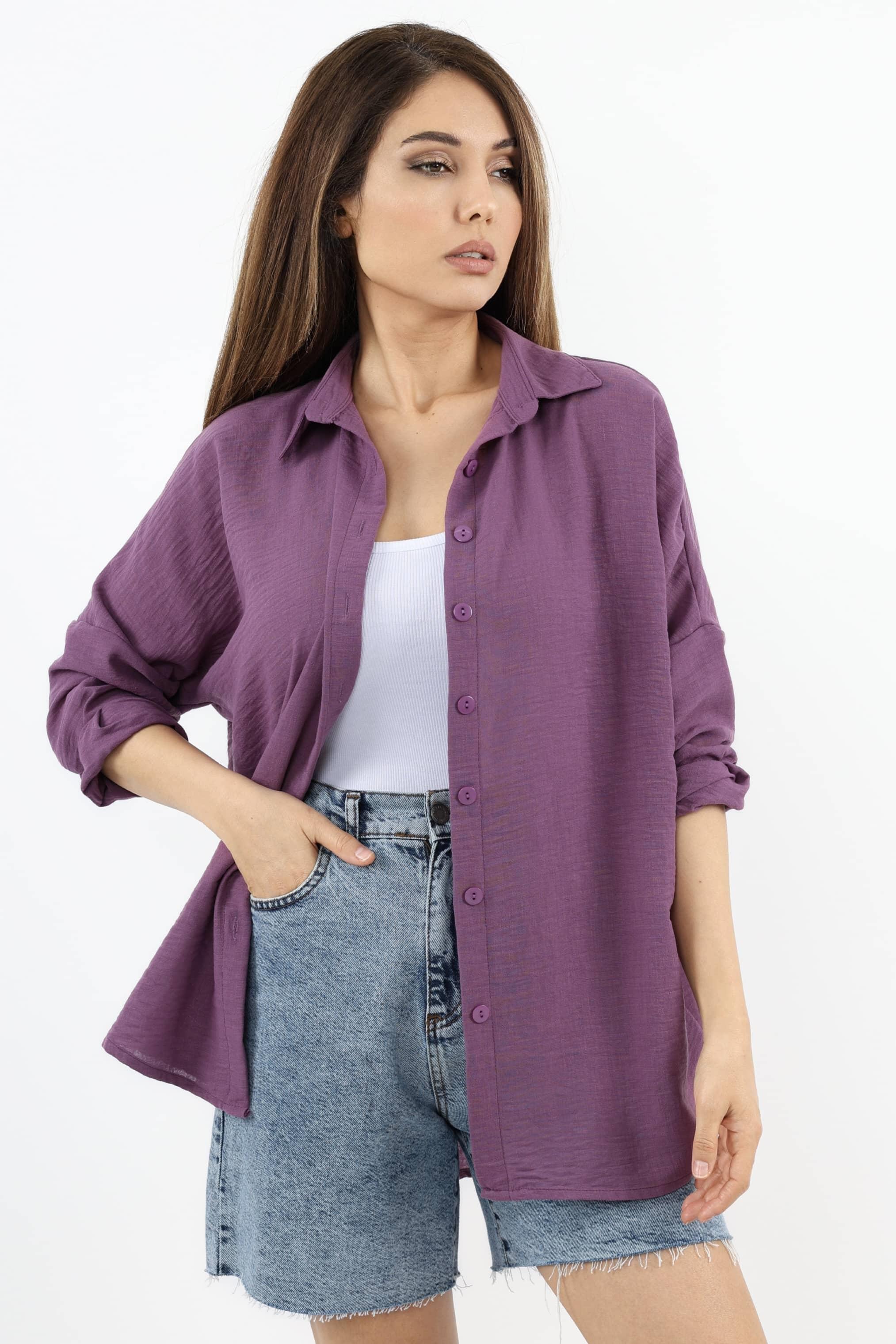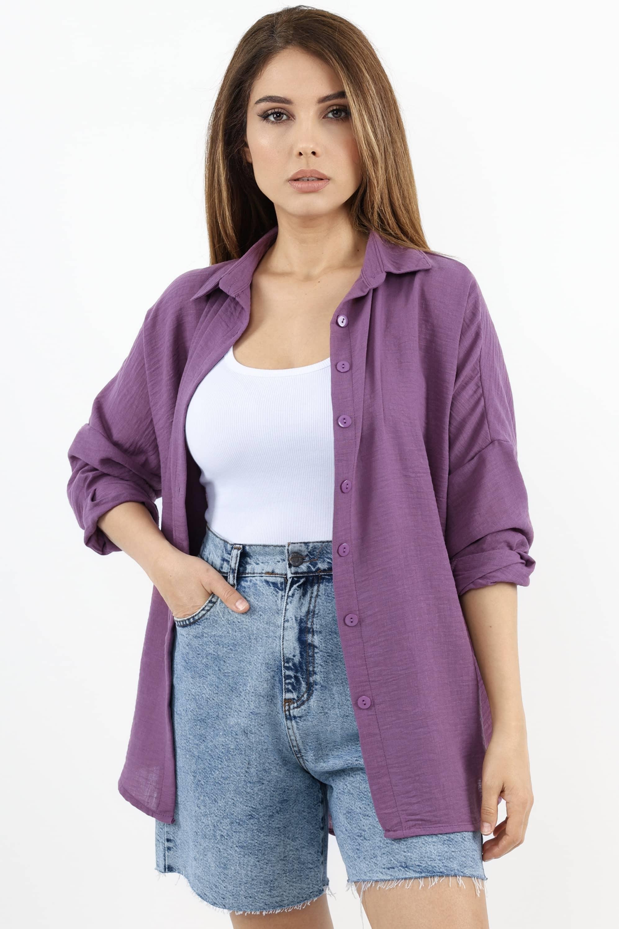 Kadın Keten Comfy Uzun Mor Gömlek