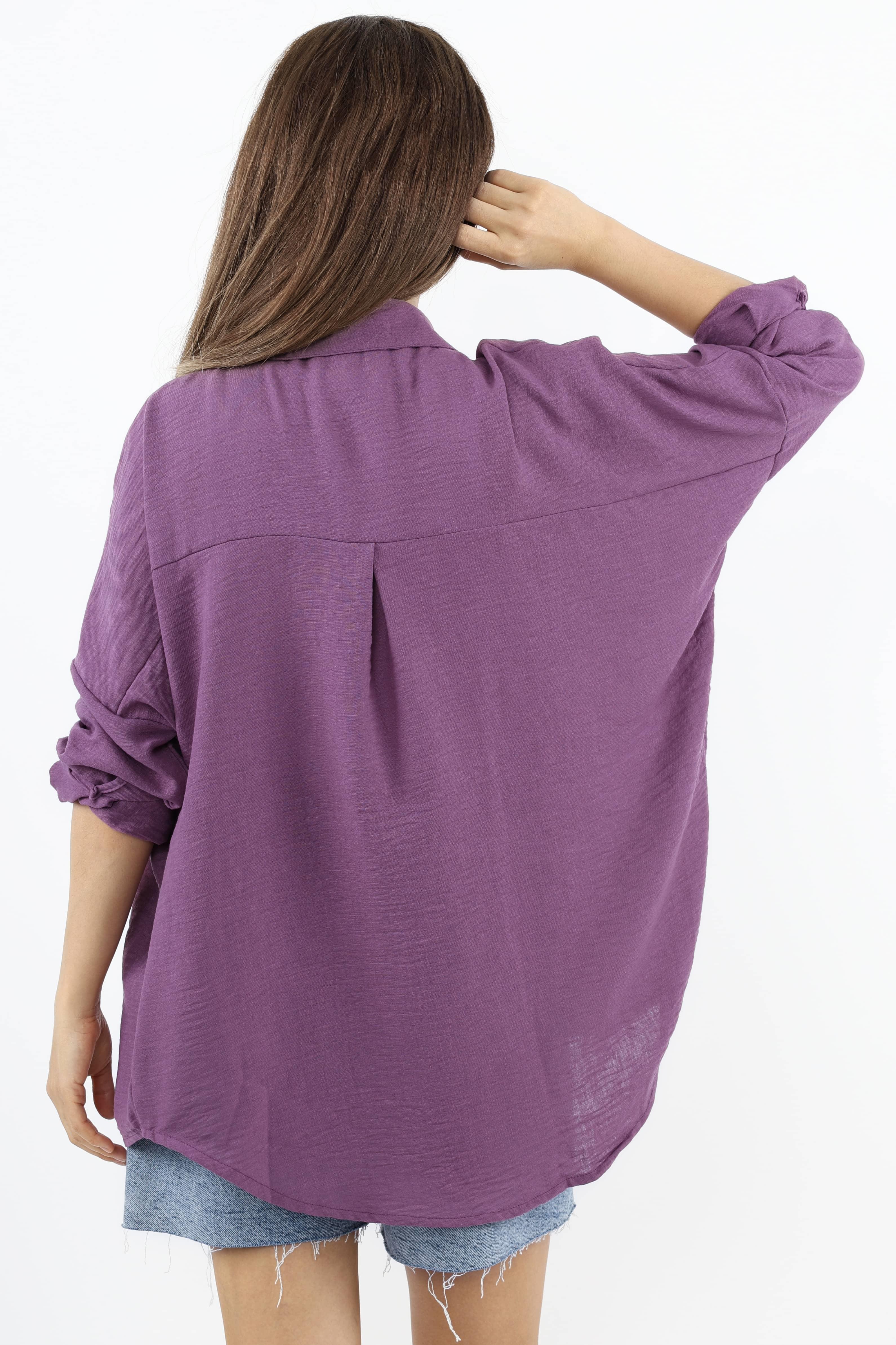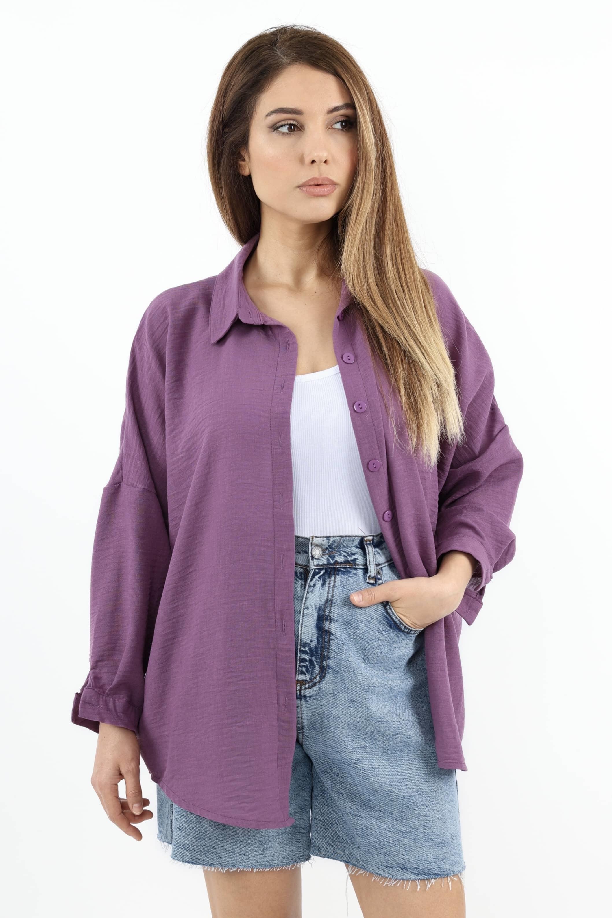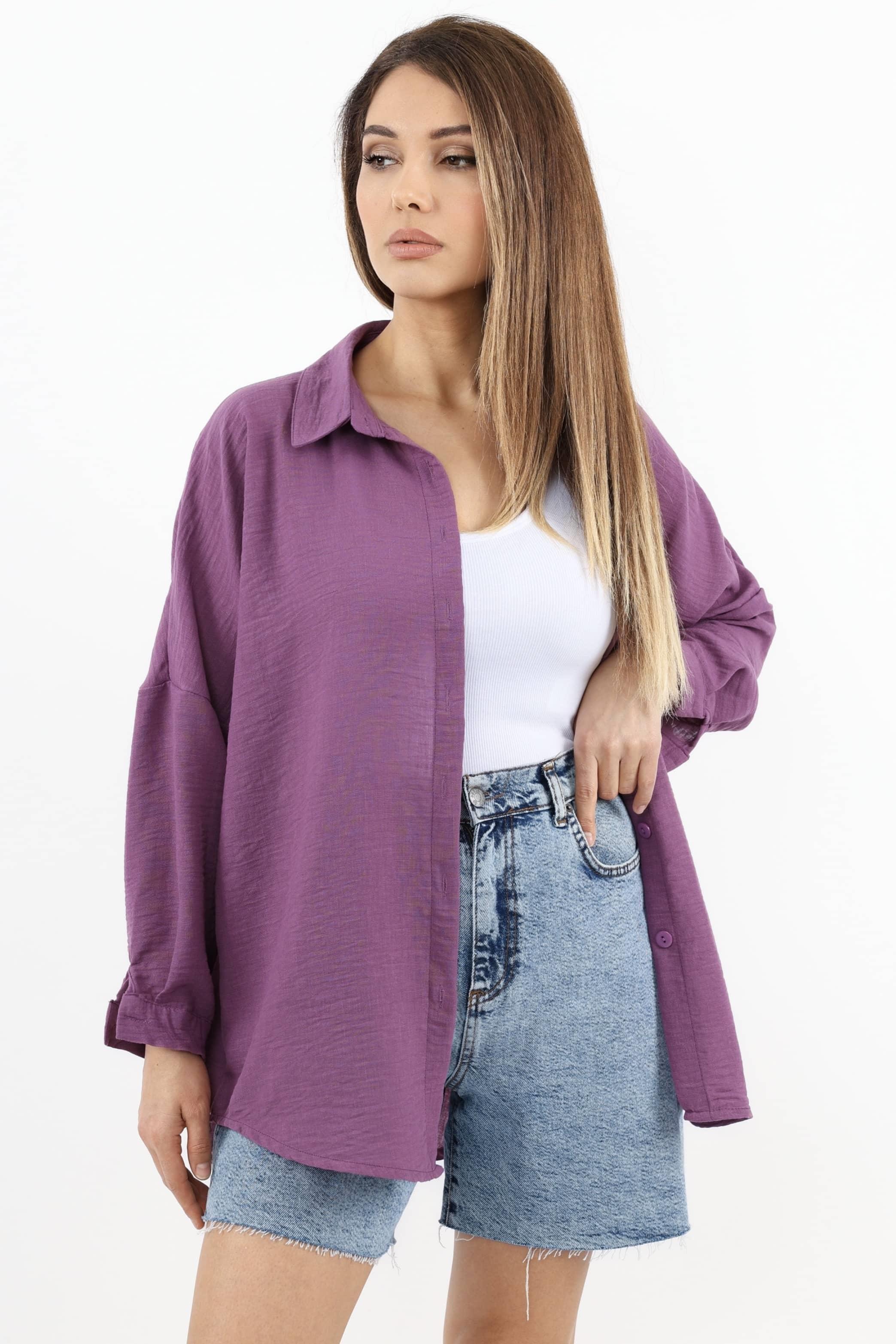 Kadın Keten Comfy Uzun Mor Gömlek