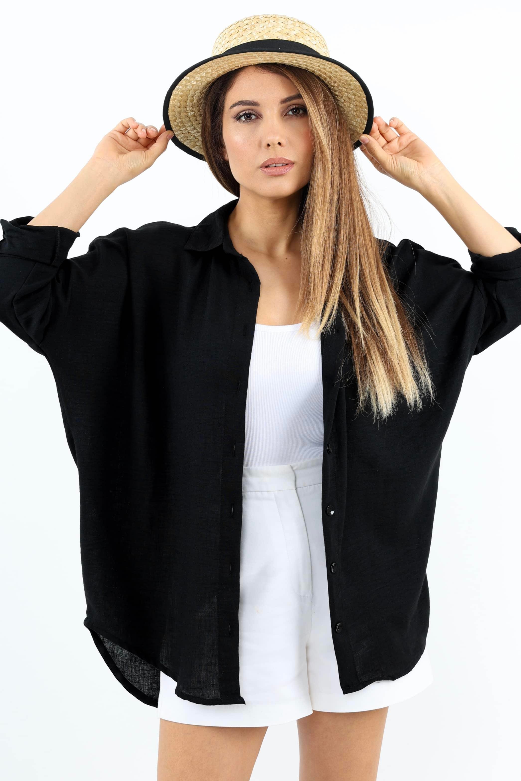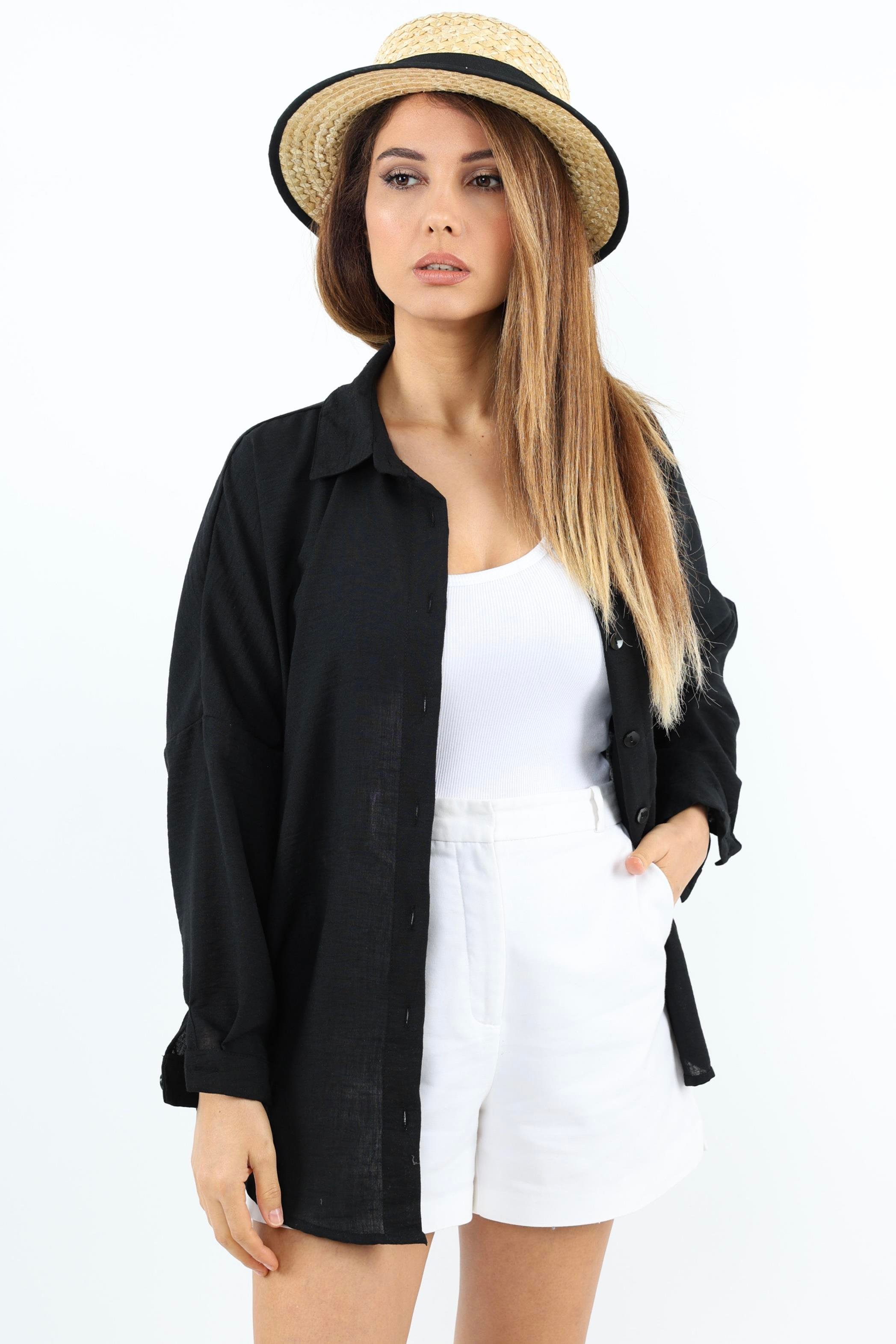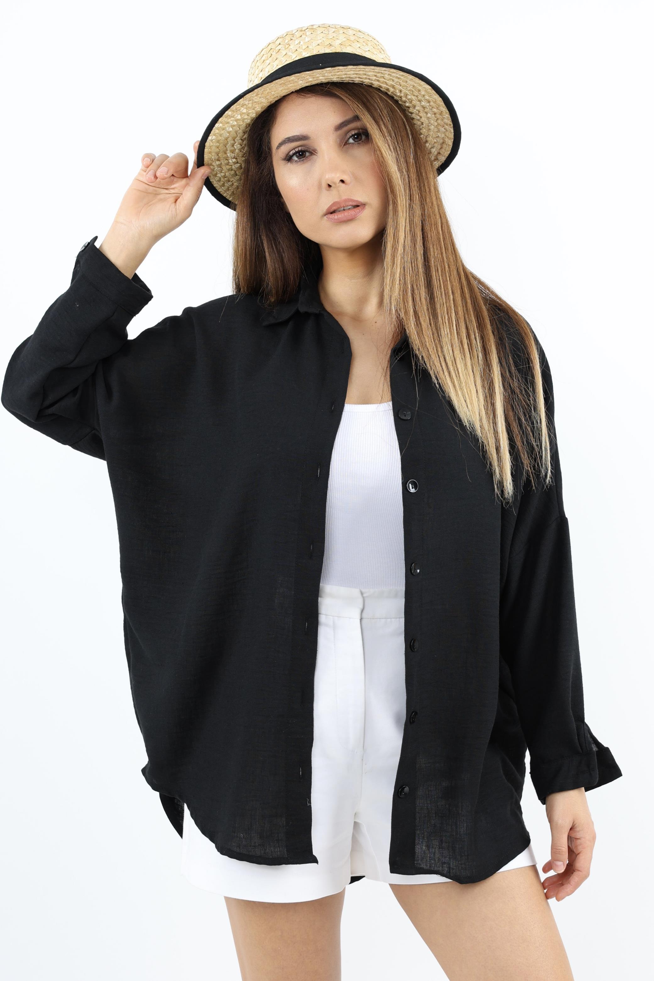 Kadın Keten Comfy Uzun Siyah Gömlek