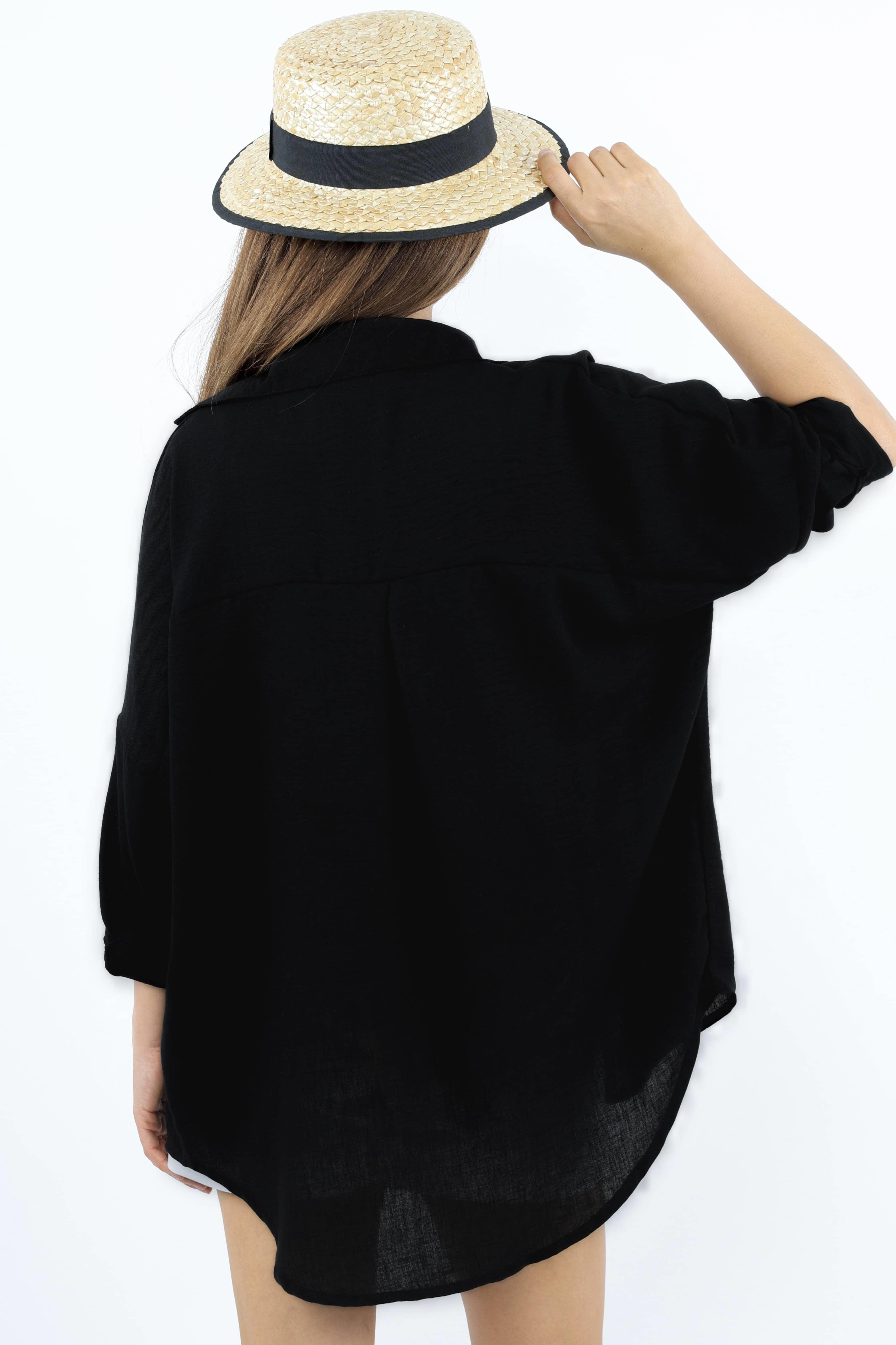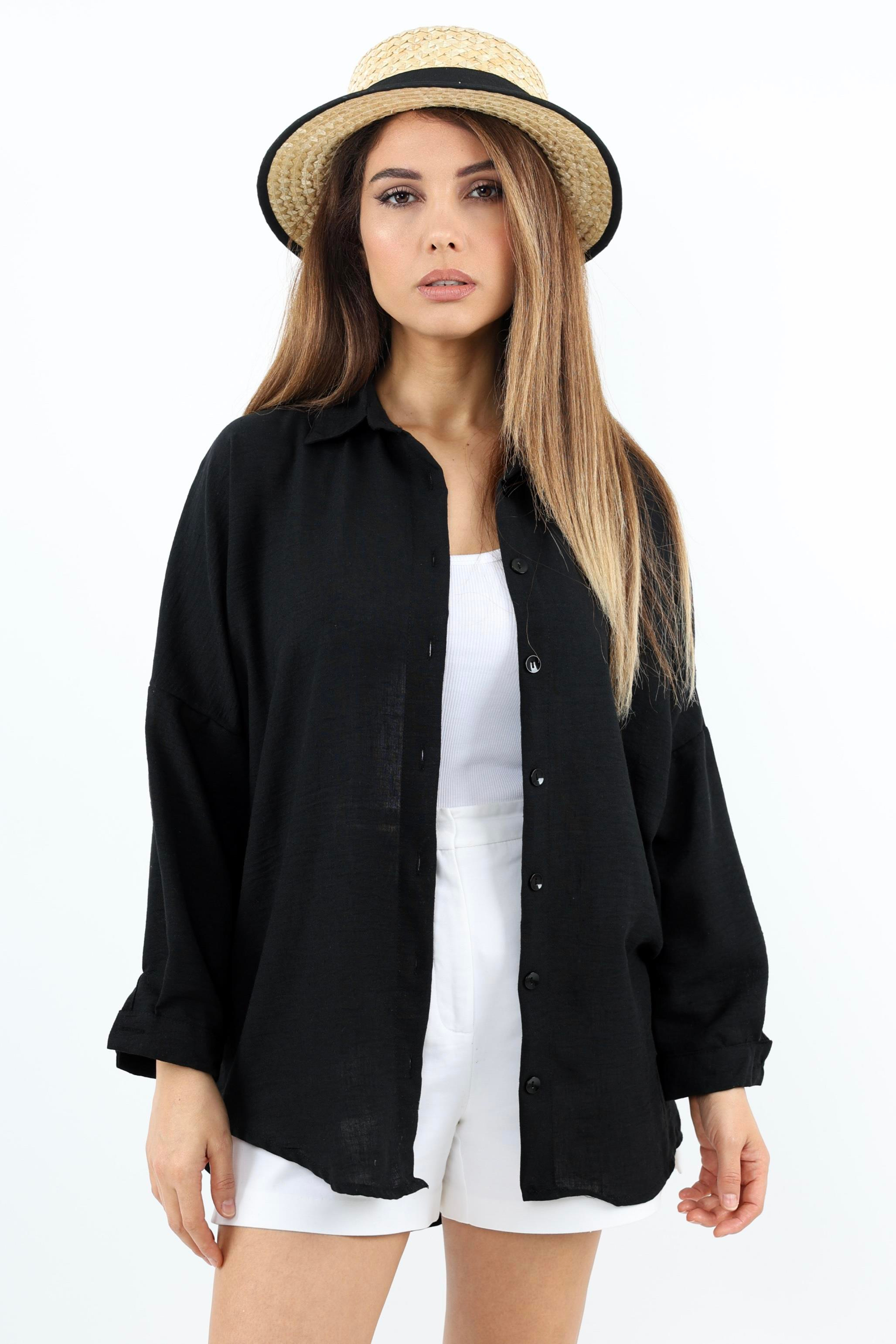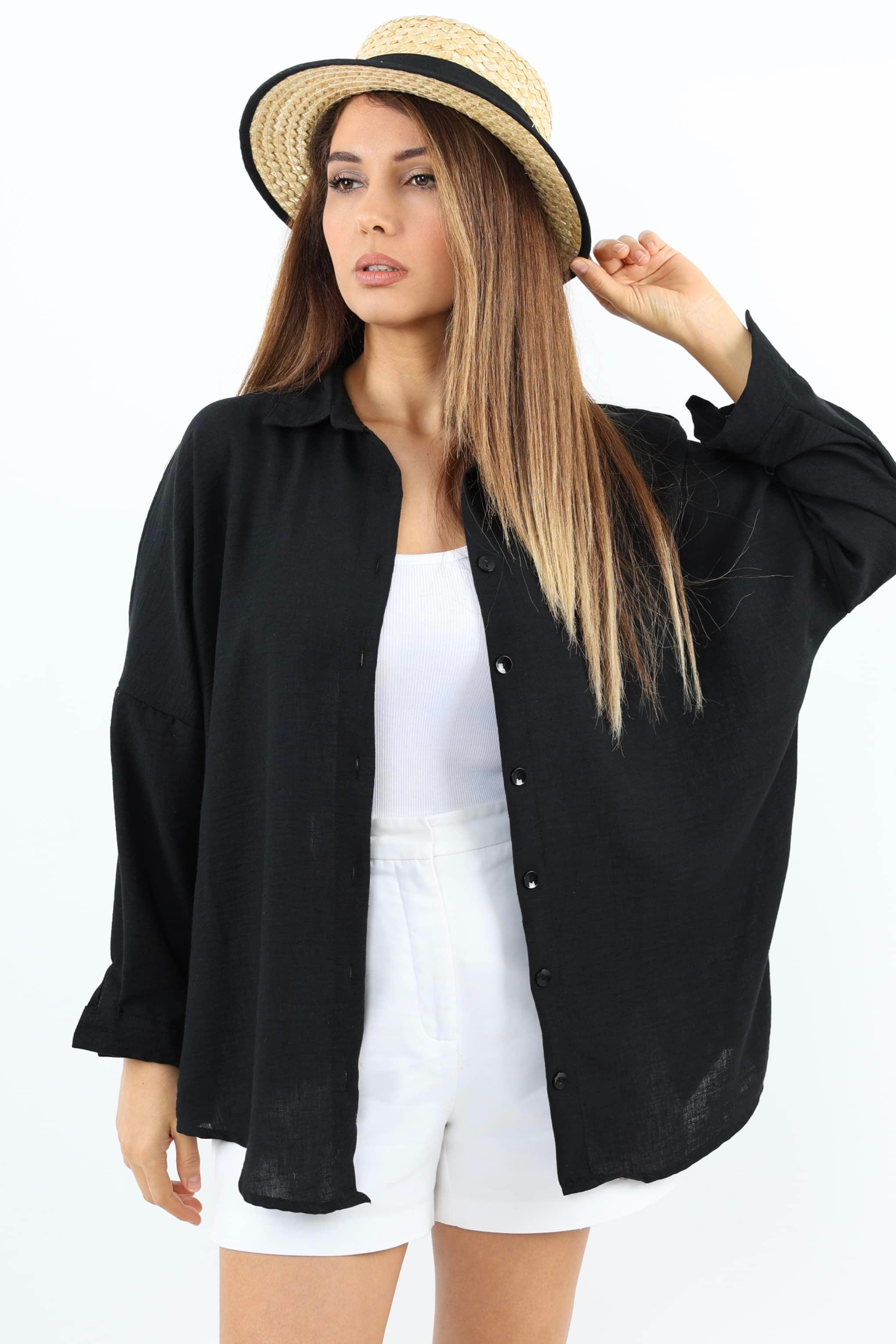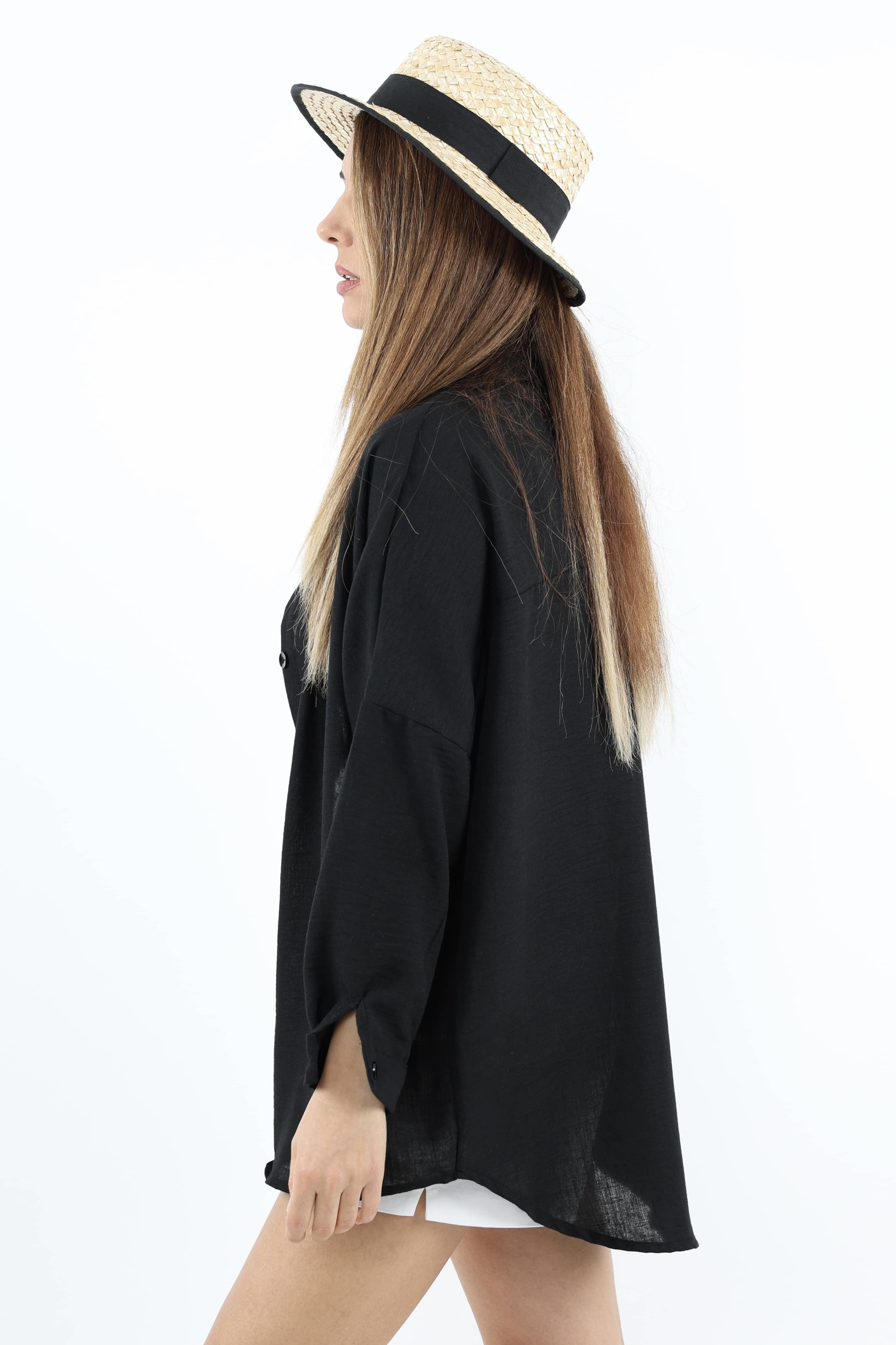 Kadın Keten Comfy Uzun Siyah Gömlek
