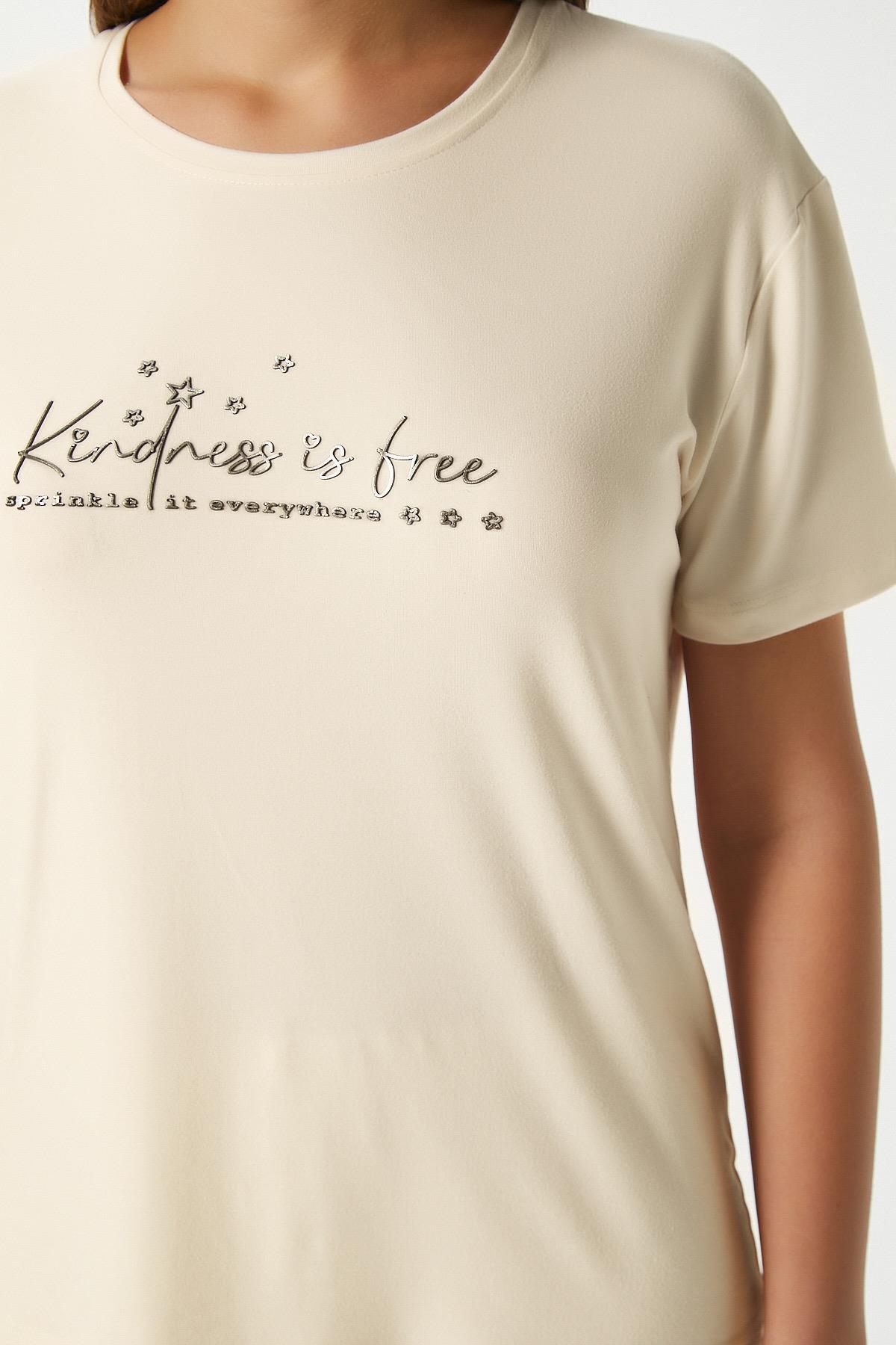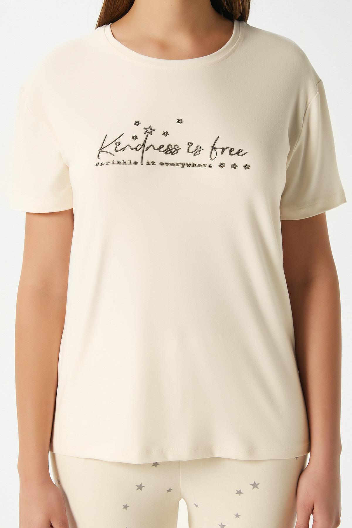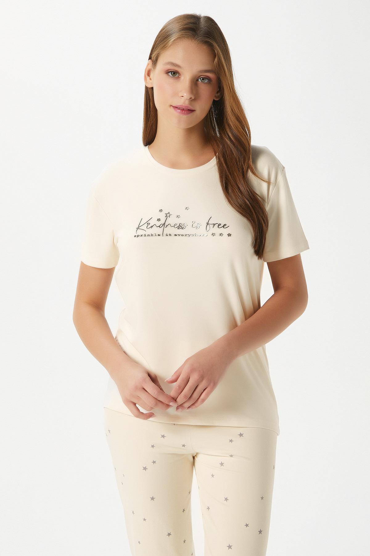 Kadın Kindness Yumuşak Doku Tereyağ Sarısı Yıldız Desen Bisiklet Yaka Kısa Kollu Alt Üst Pijama Takımı