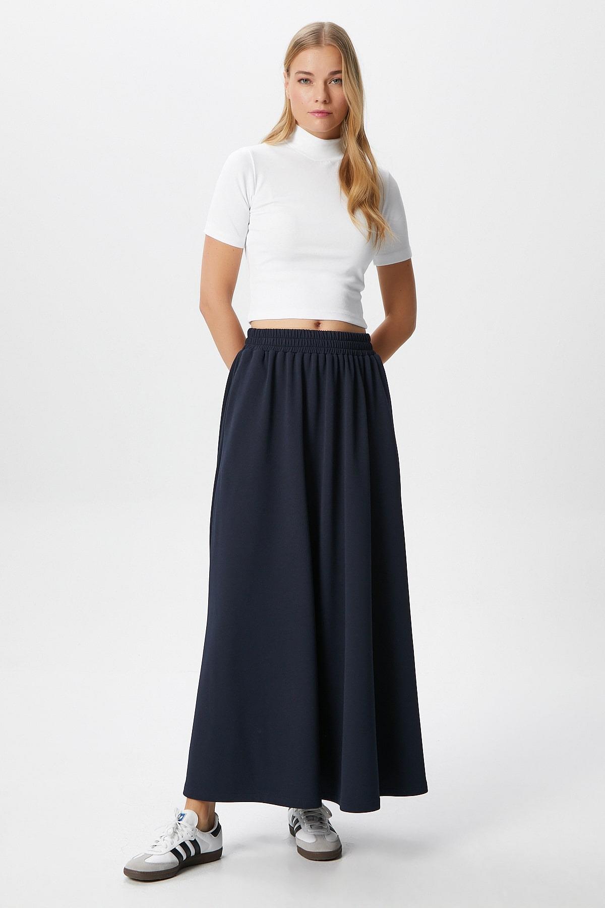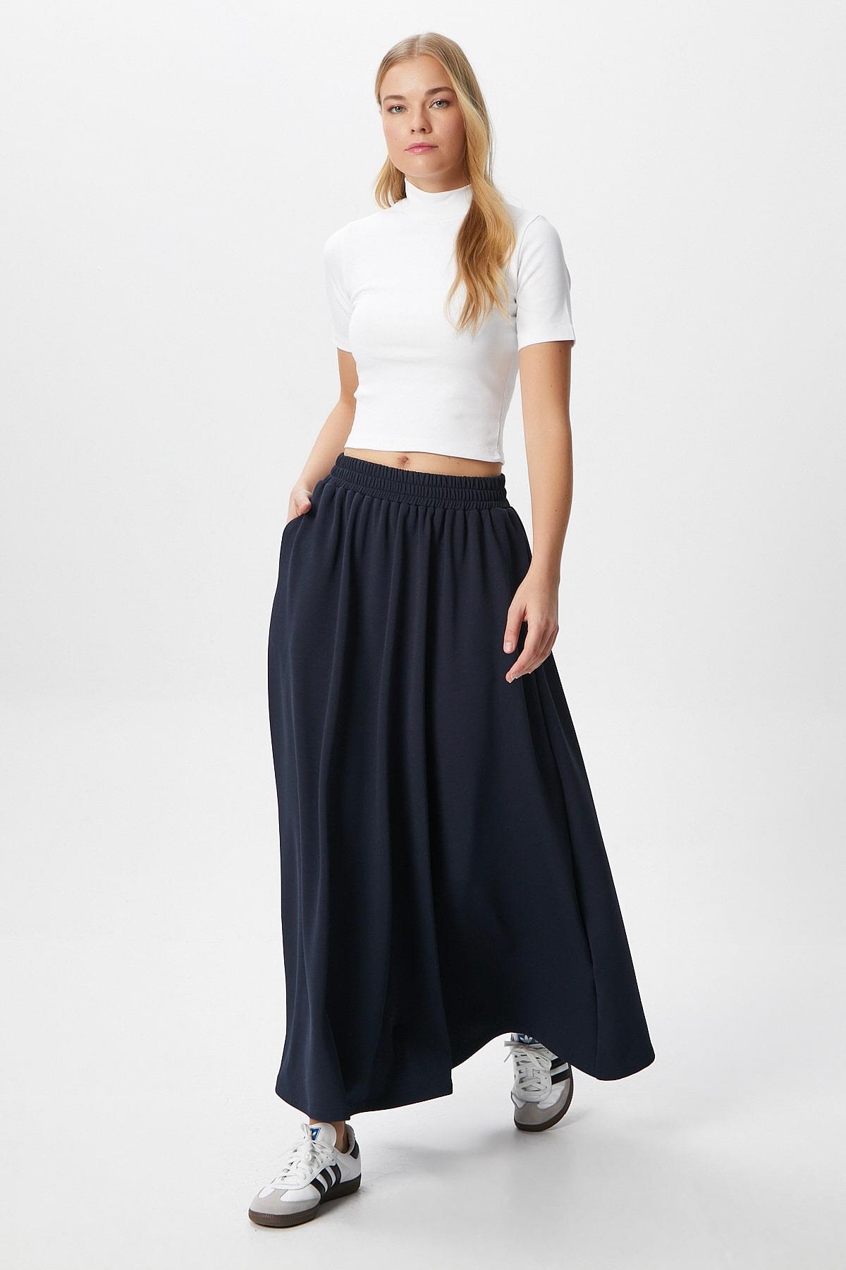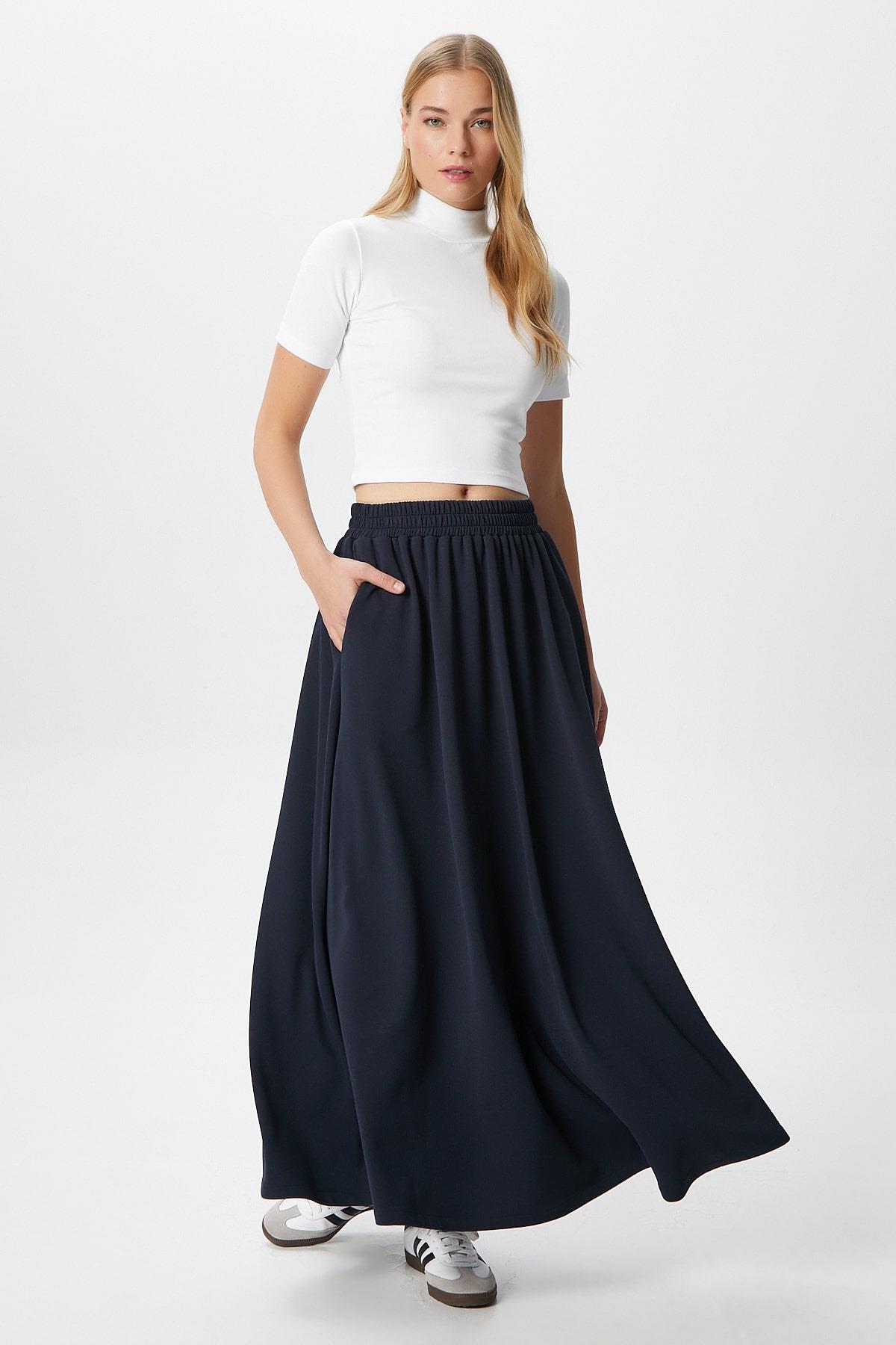 Kadın Luna Bel Lastikli Cepli Lacivert Uzun Maxi Boy Etek,