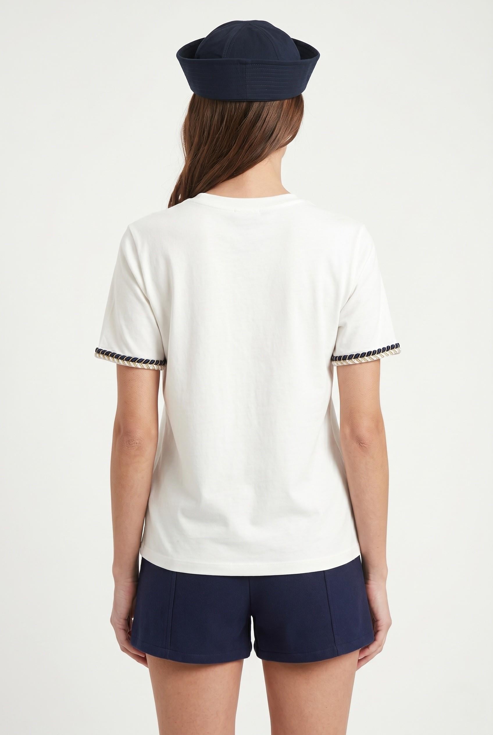 Kadın Marin Yaka İşlemeli %100 Pamuk Kısa Kol Beyaz Örme T-shirt