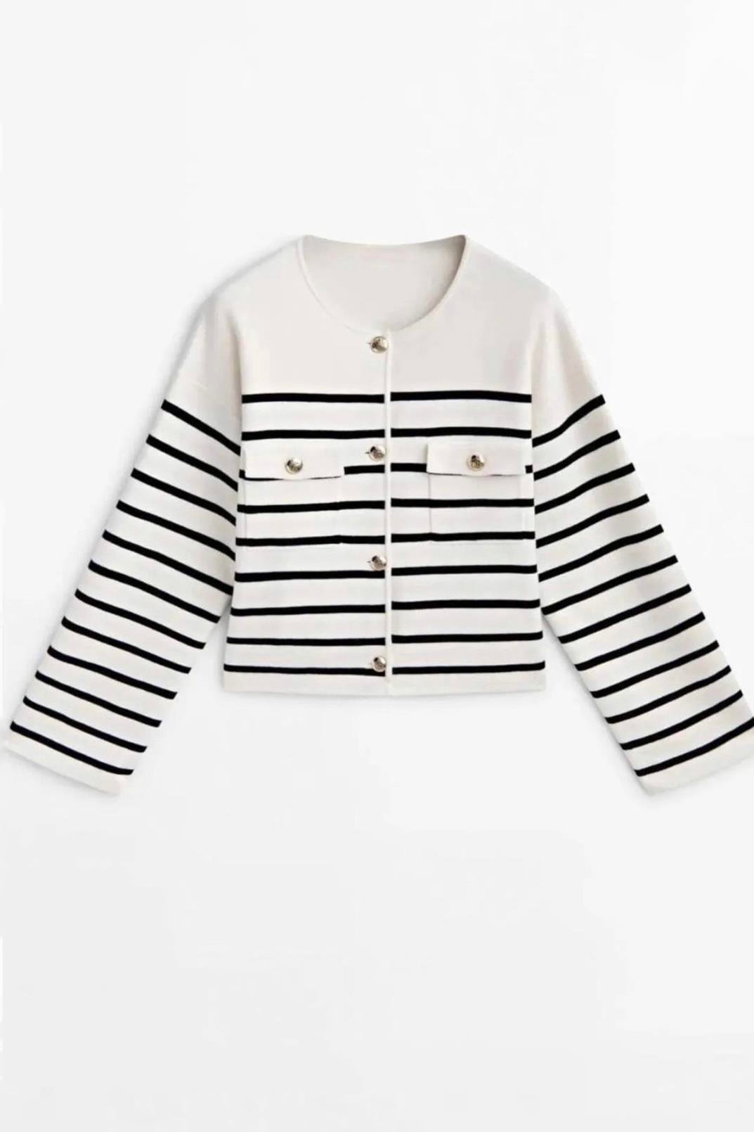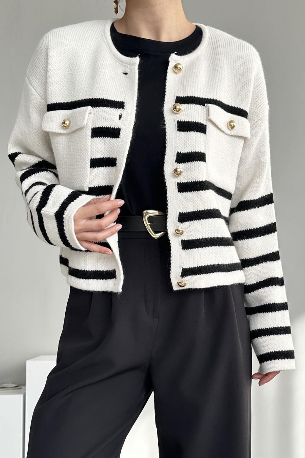 Kadın Milena Ekru Siyah Çizgili Çift Cepli Gold Düğmeli Hırka