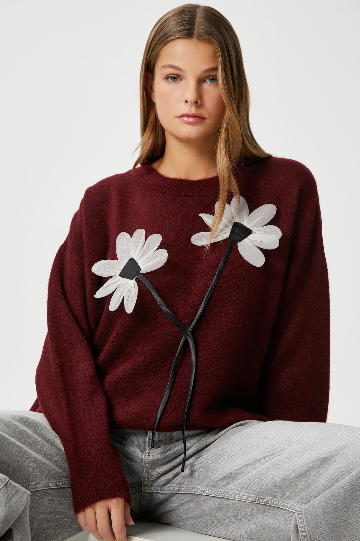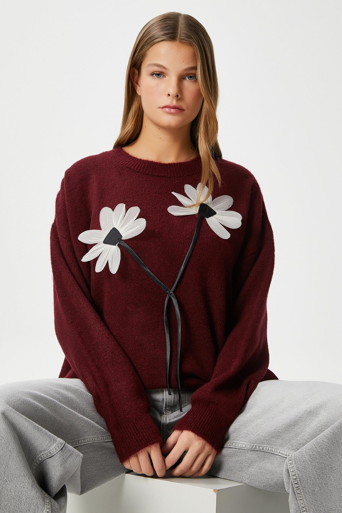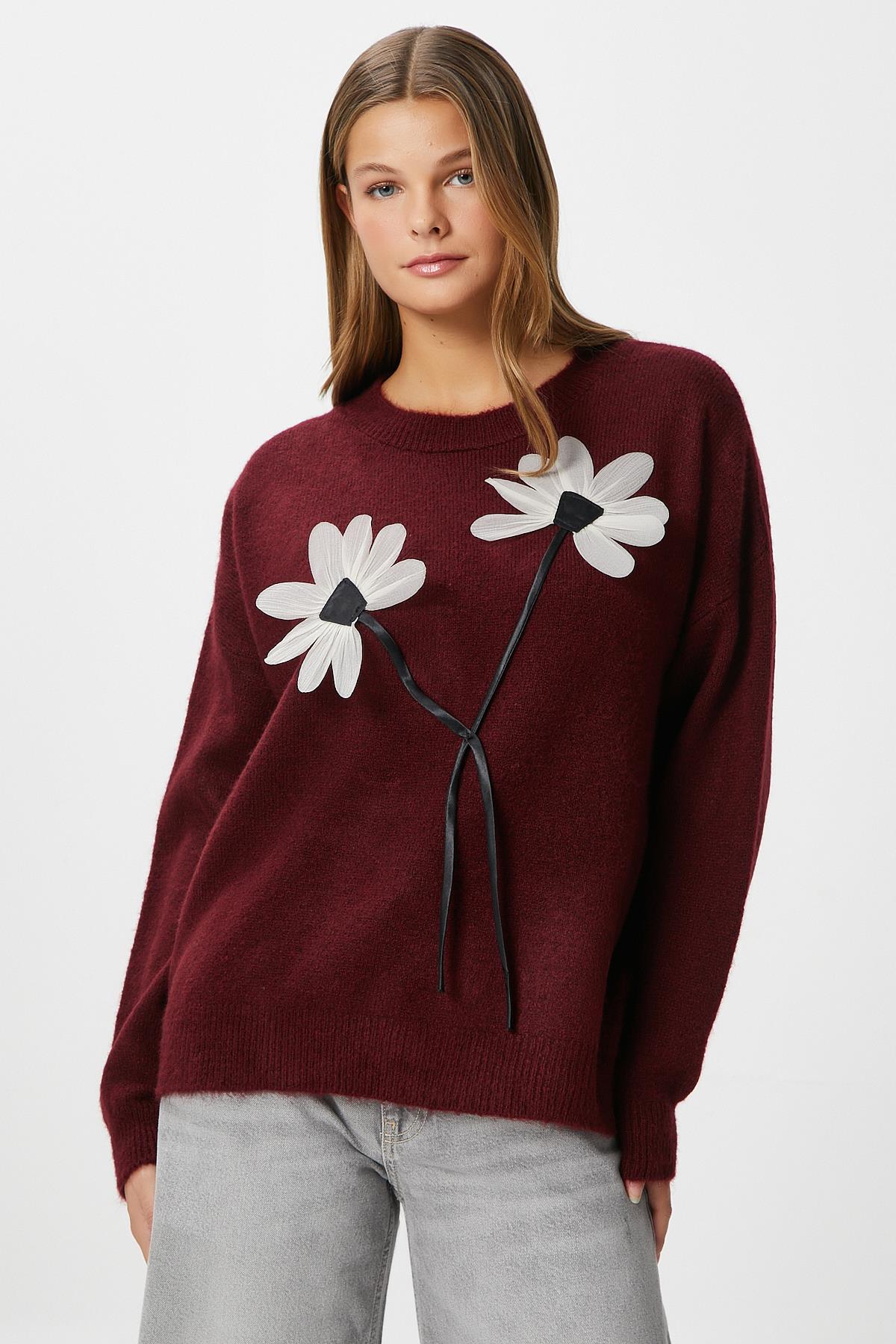 Kadın Miranda Çiçek Detay Bordo Triko KazakModel Boy 176 cm Göğüs 88 , Bel 62, Basen 93 cm