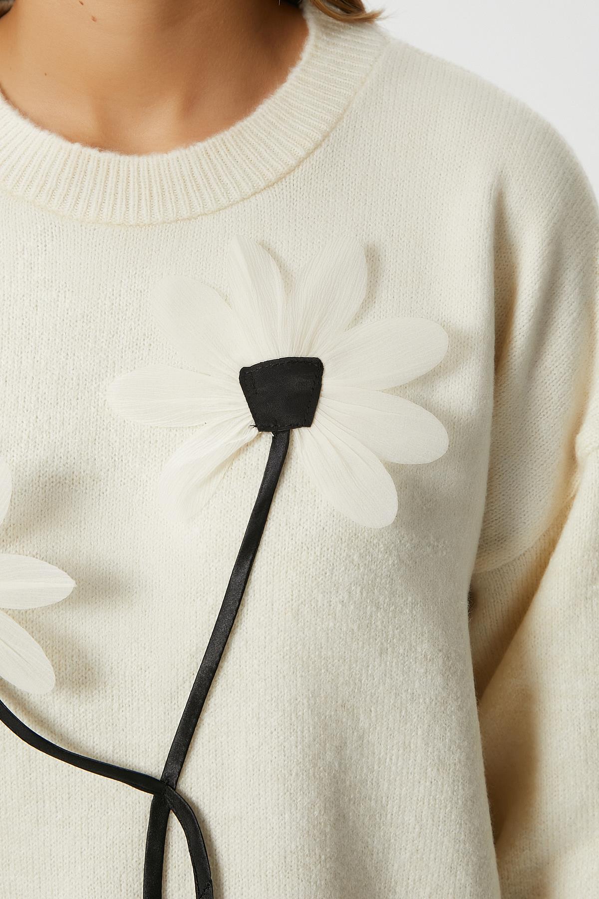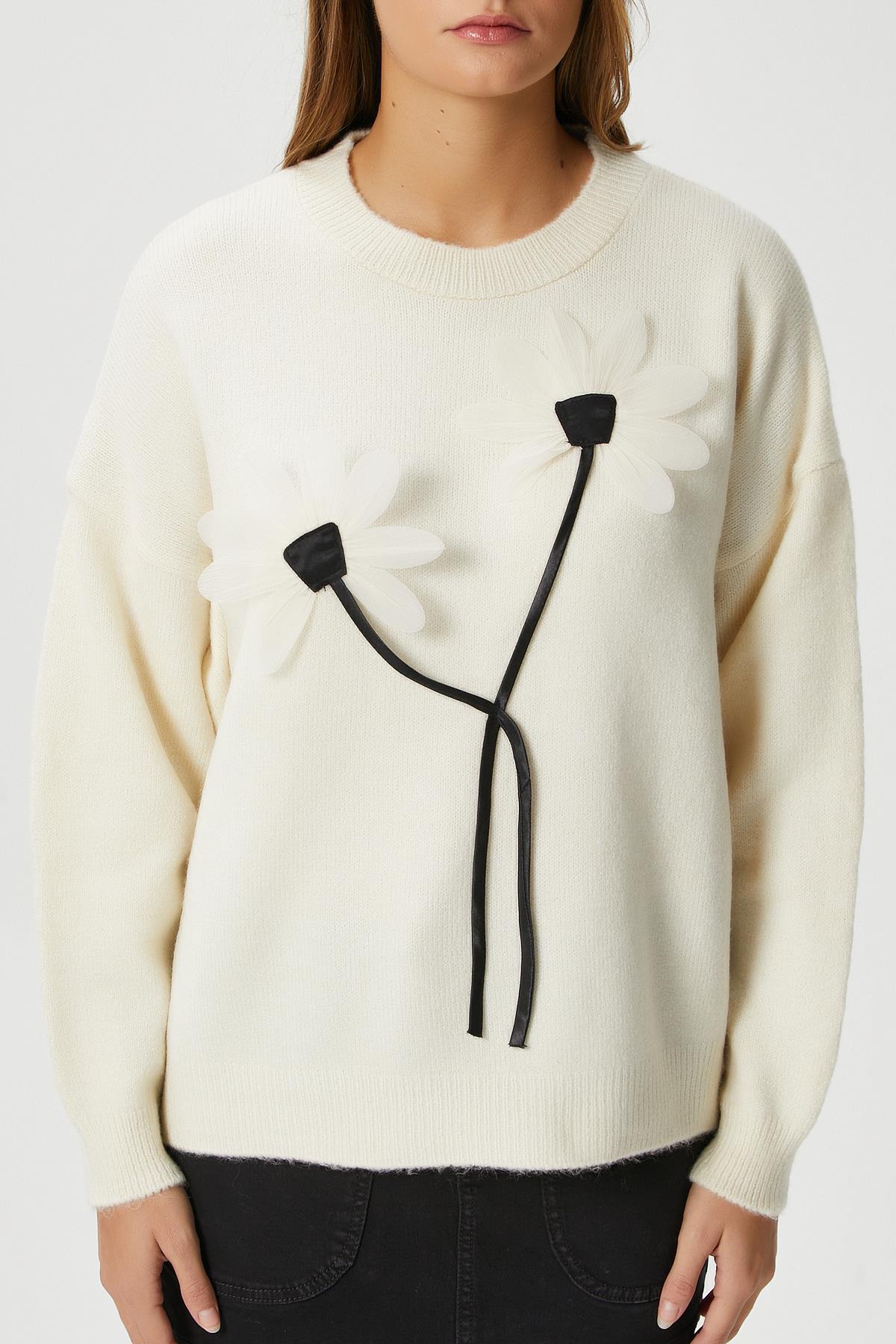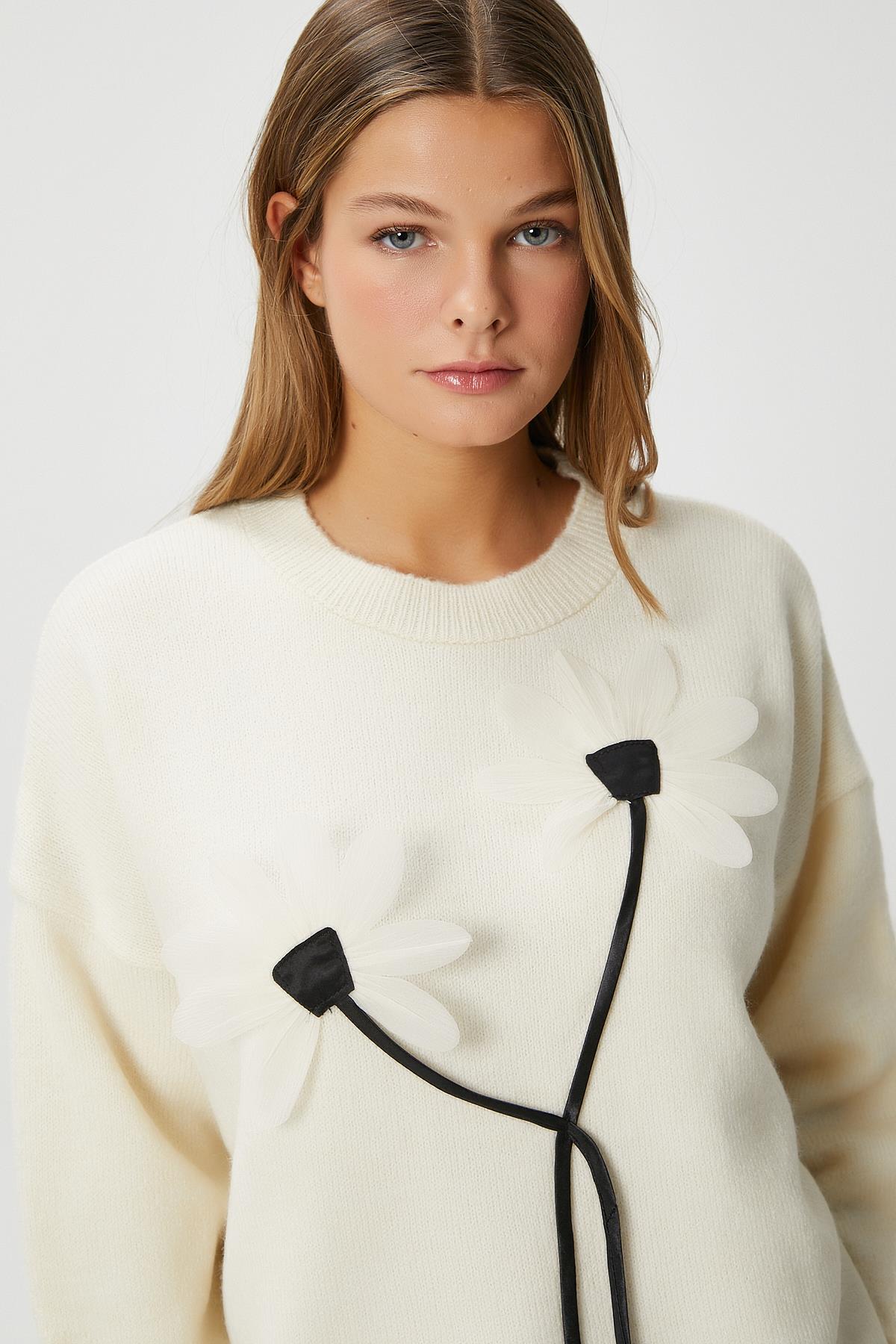 Kadın Miranda Çiçek Detay Ekru Triko KazakModel Boy 176 cm Göğüs 88 , Bel 62, Basen 93 cm
