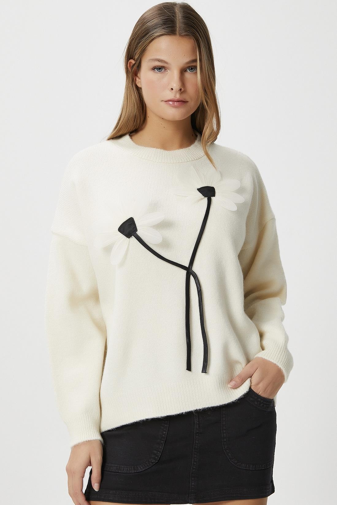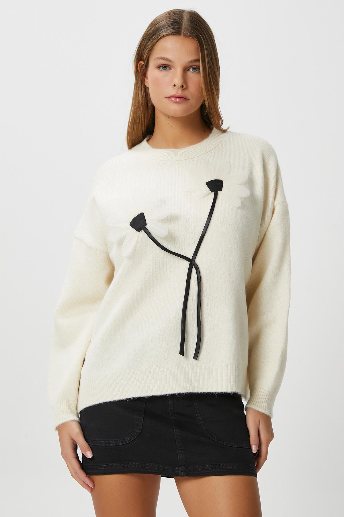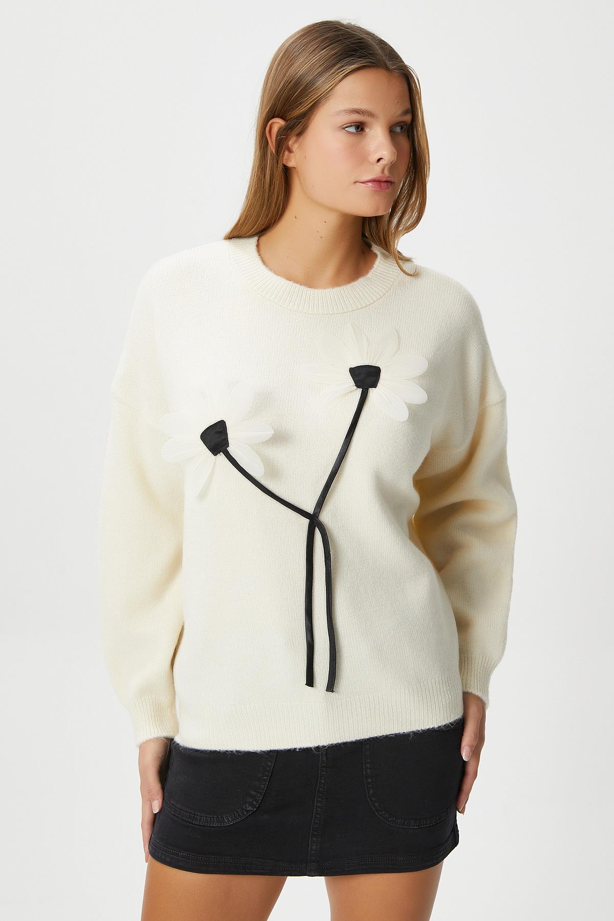 Kadın Miranda Çiçek Detay Ekru Triko KazakModel Boy 176 cm Göğüs 88 , Bel 62, Basen 93 cm