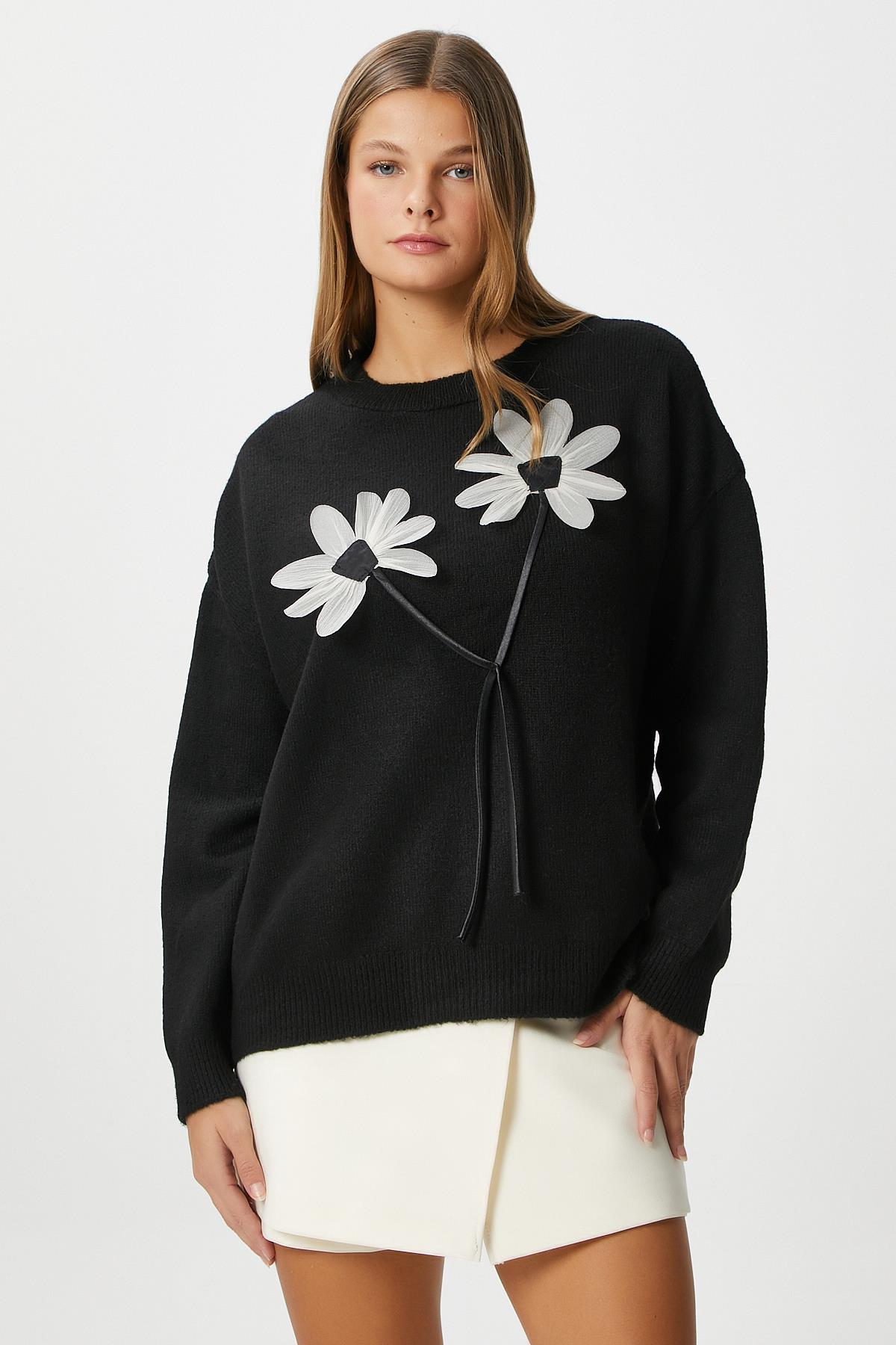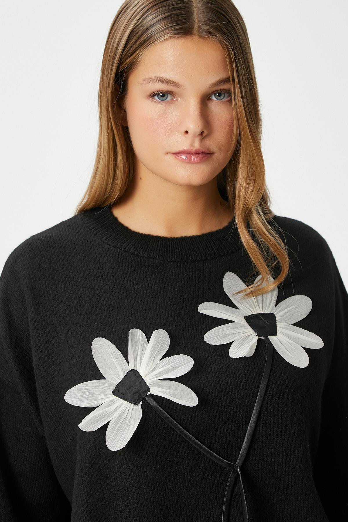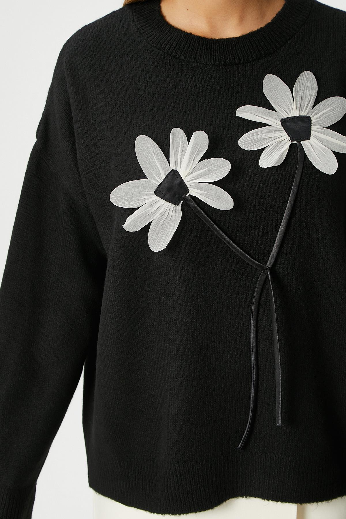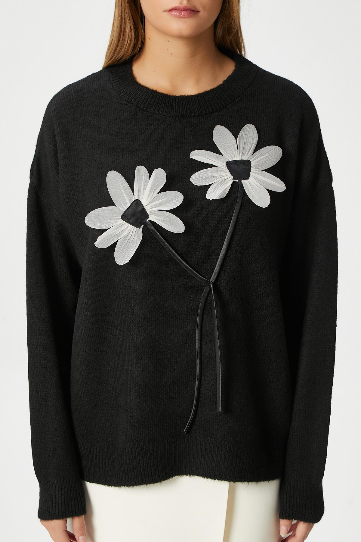 Kadın Miranda Çiçek Detay Siyah Triko KazakModel Boy 176 cm Göğüs 88 , Bel 62, Basen 93 cm