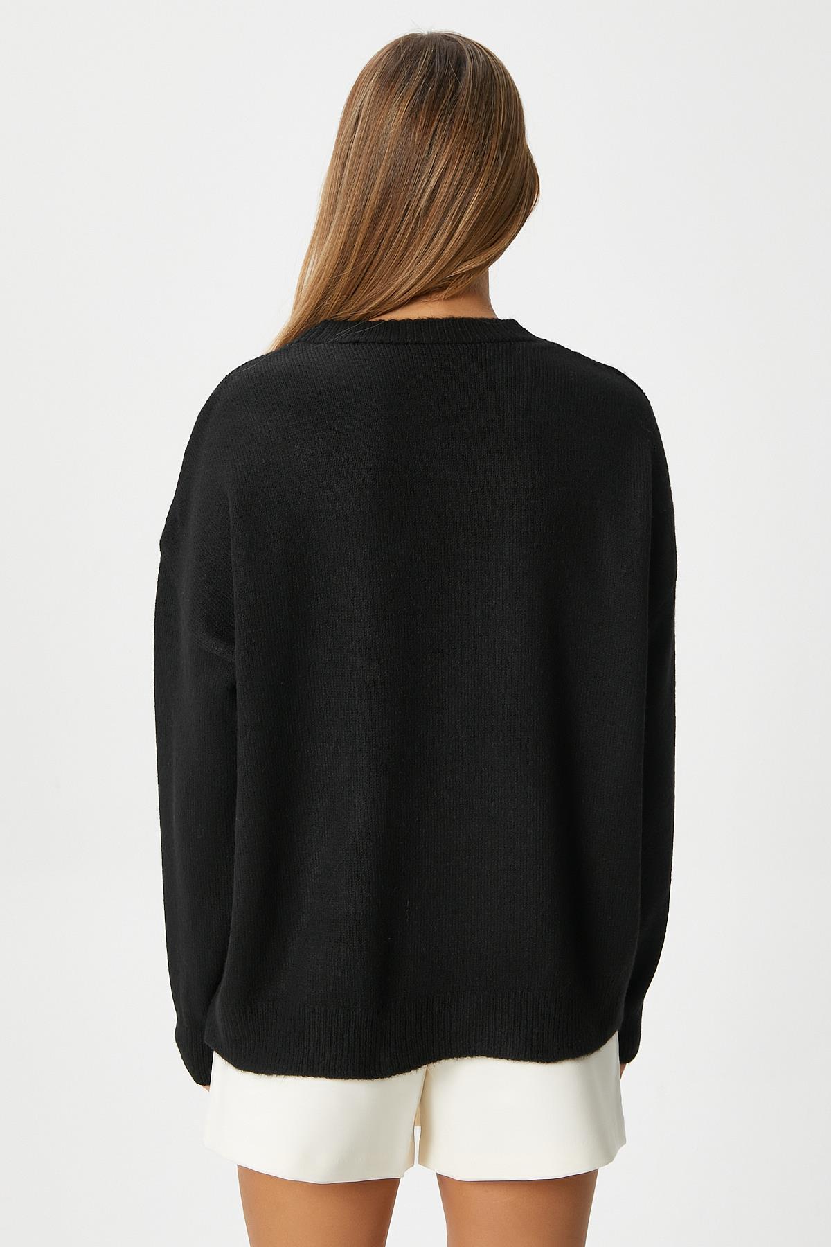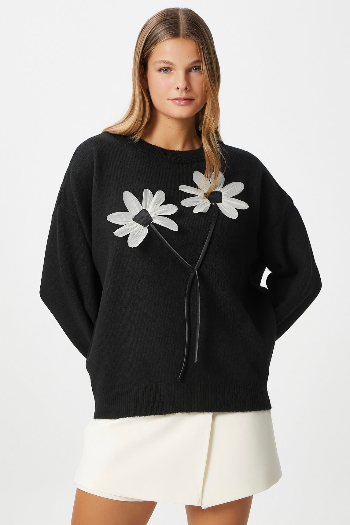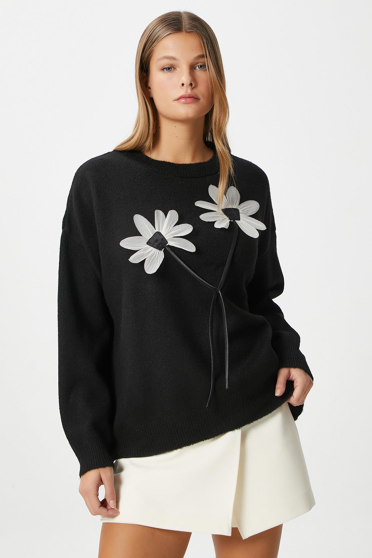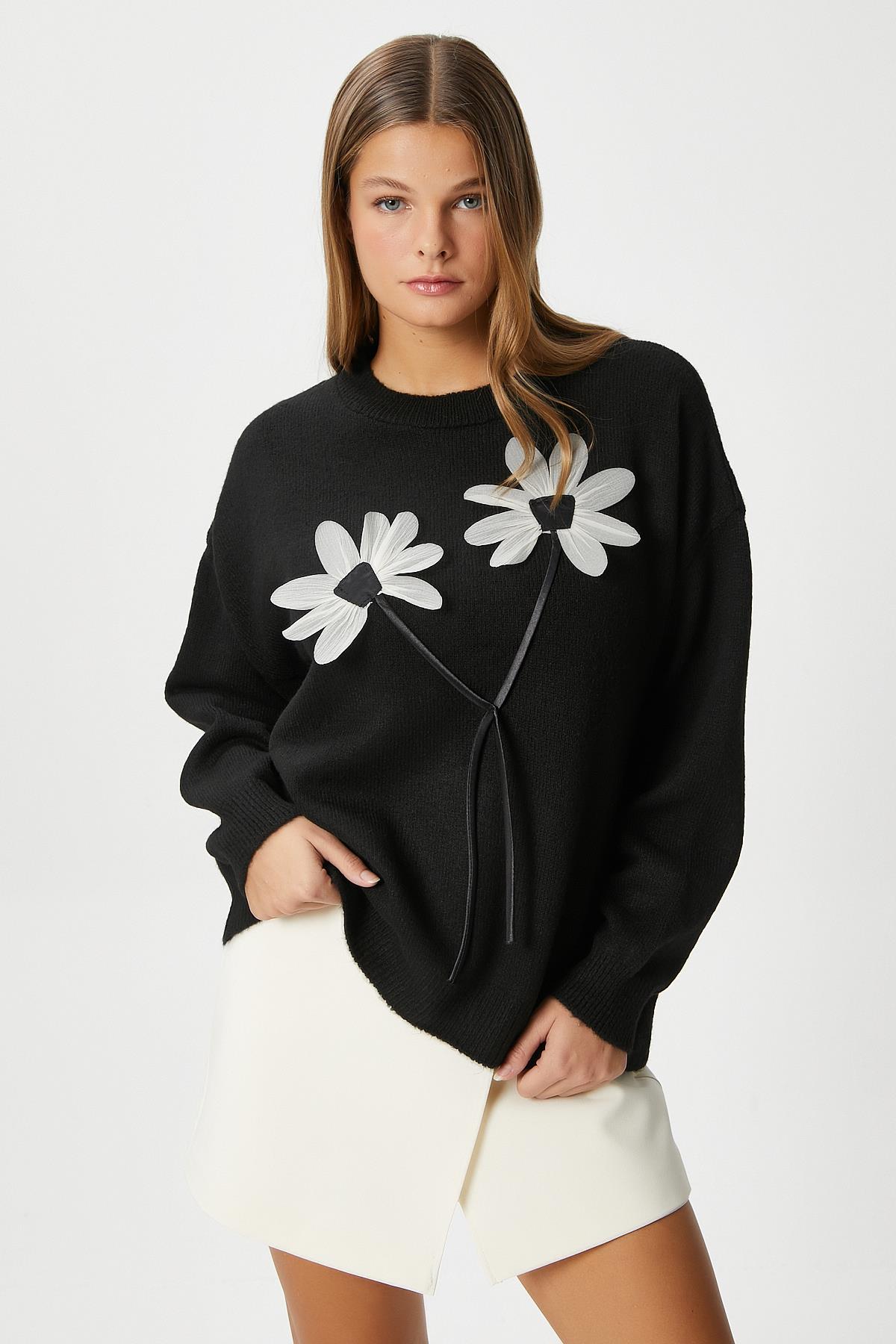 Kadın Miranda Çiçek Detay Siyah Triko KazakModel Boy 176 cm Göğüs 88 , Bel 62, Basen 93 cm