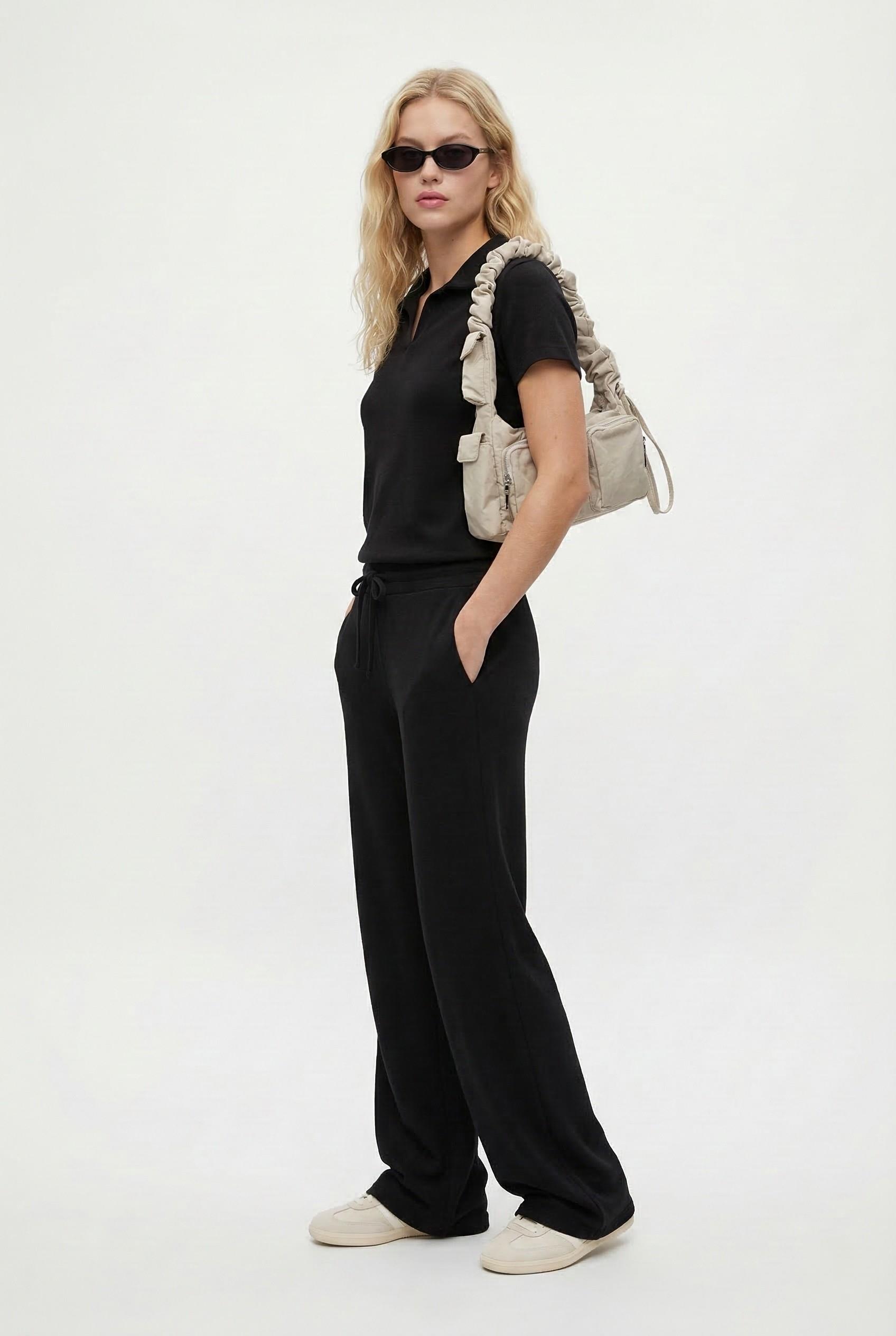 Kadın Nadia Modal Touch Polo Yaka Bel Lastikli Cepli Siyah Alt Üst Takım