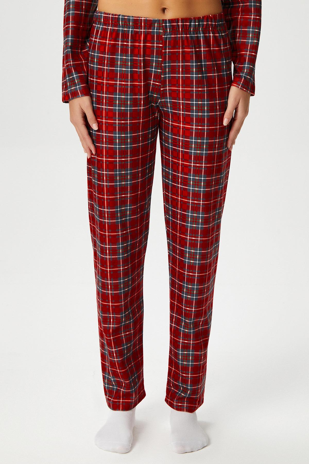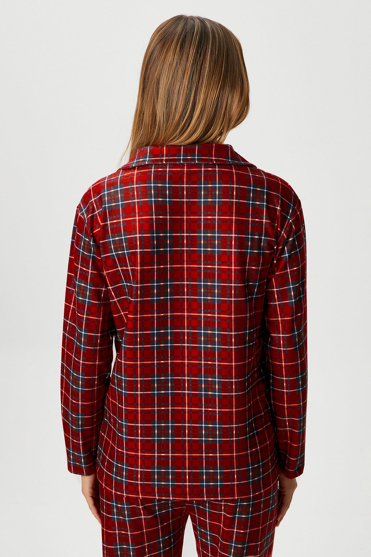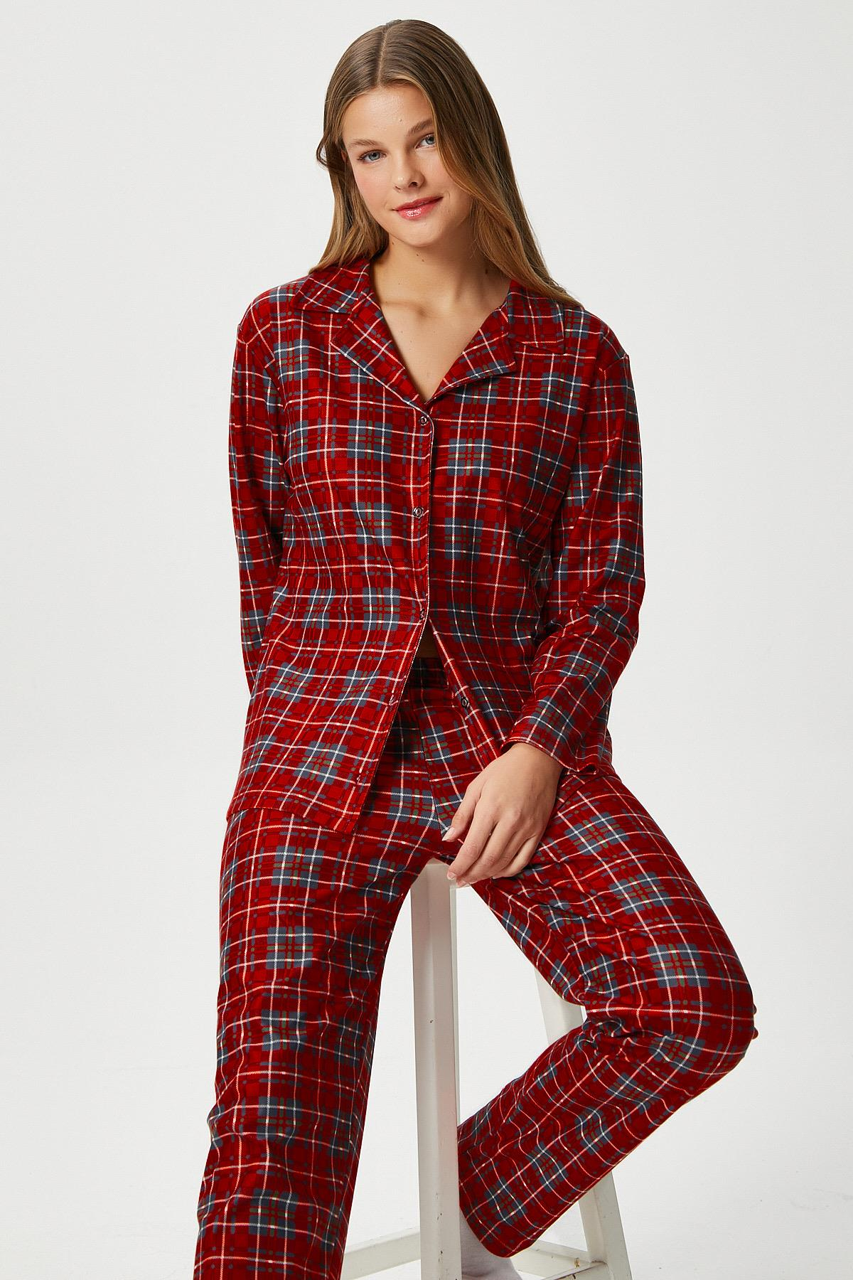 • Kadın Nora Premium Kırmızı Ekose Süet Doku Düğmeli Yılbaşı Pijama Takımı