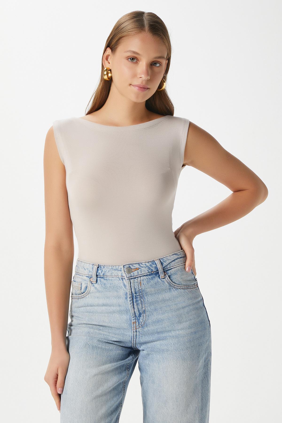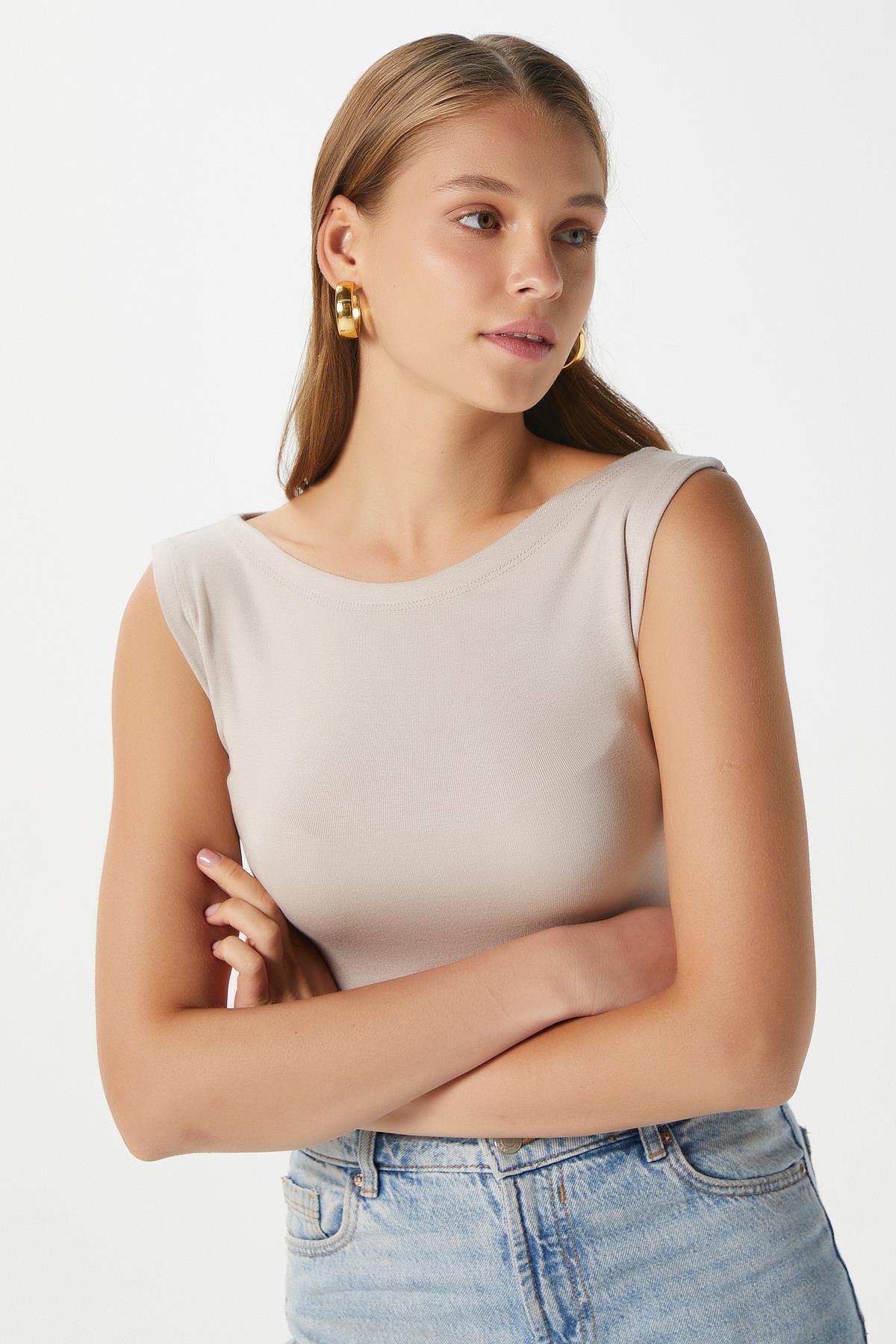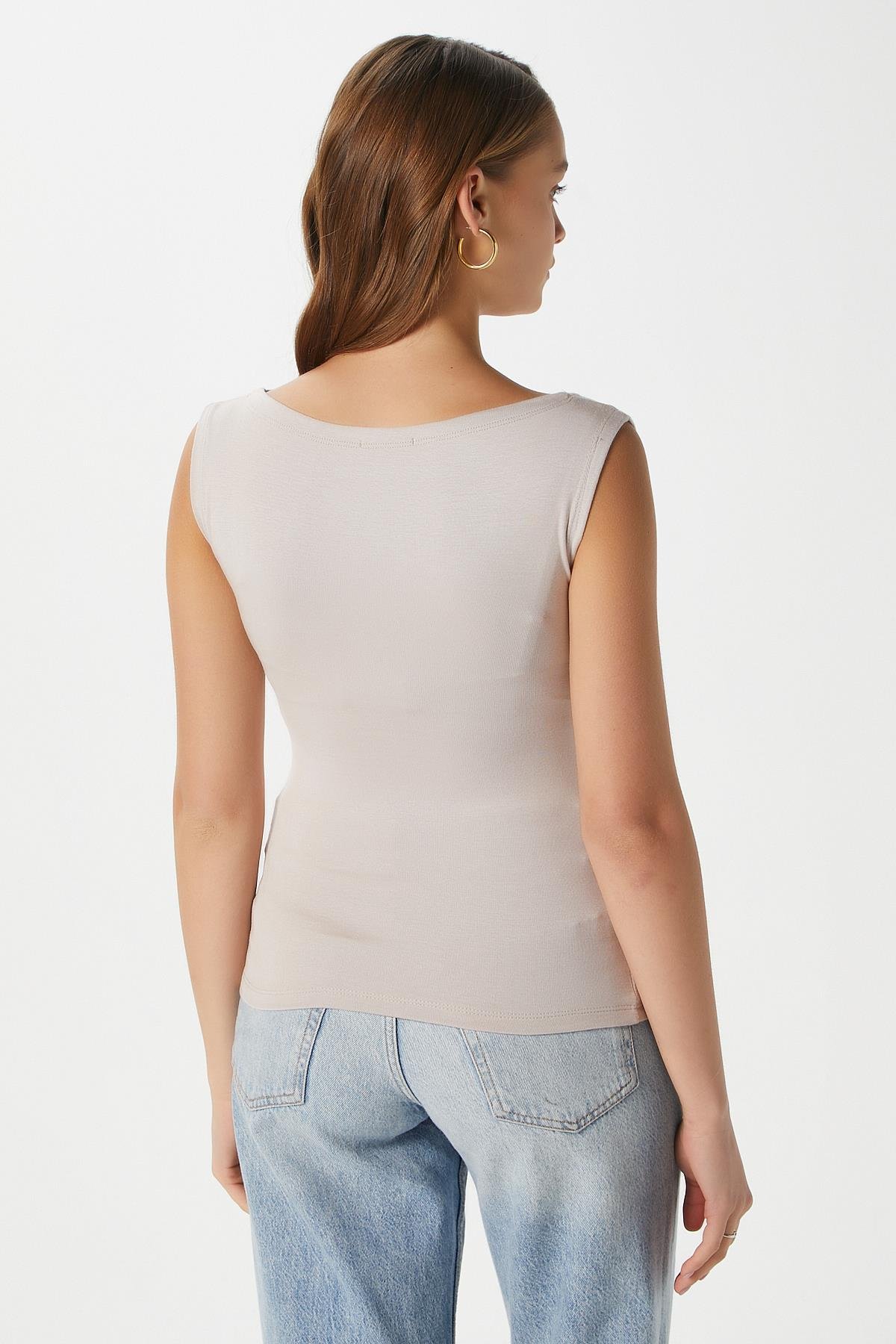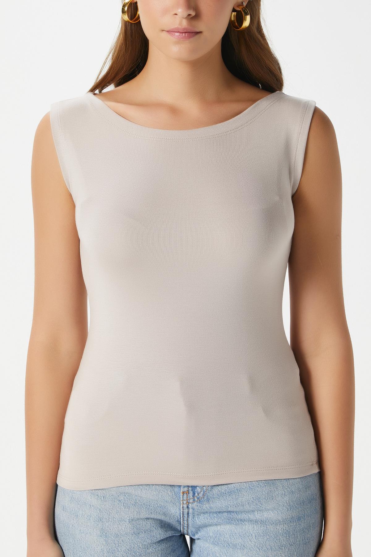 Kadın Nova Kayık Yaka Lux Touch Yumuşak Doku Kolsuz Bej Bluz