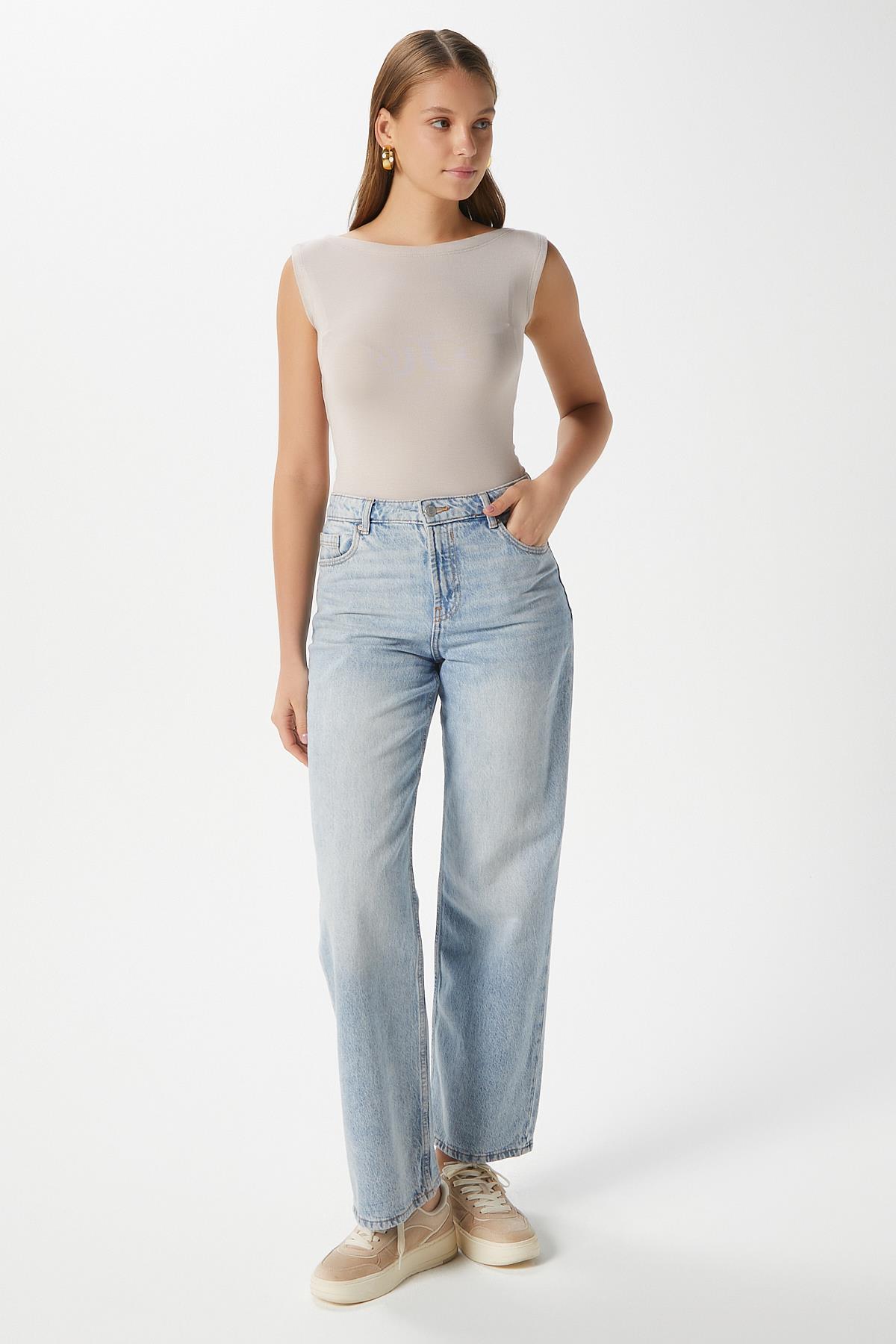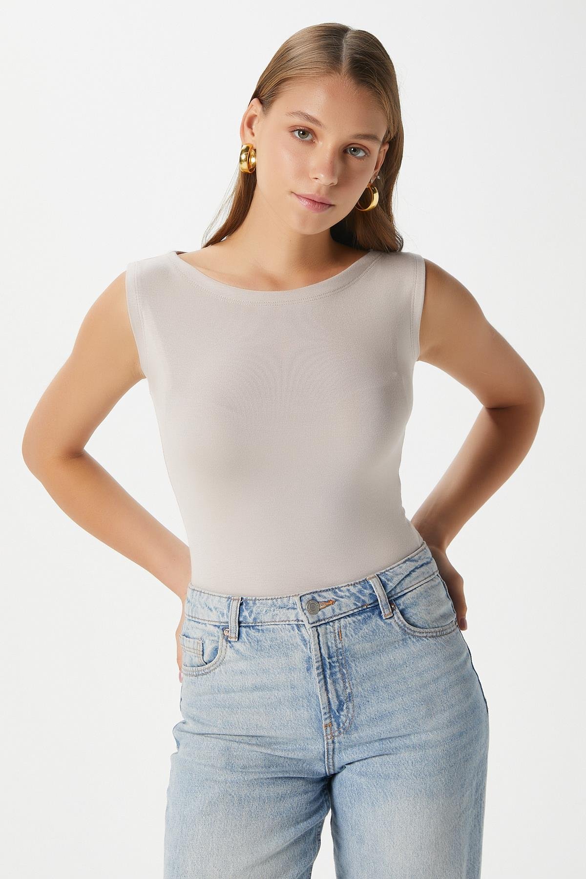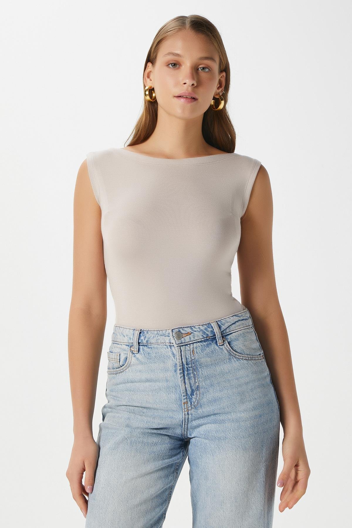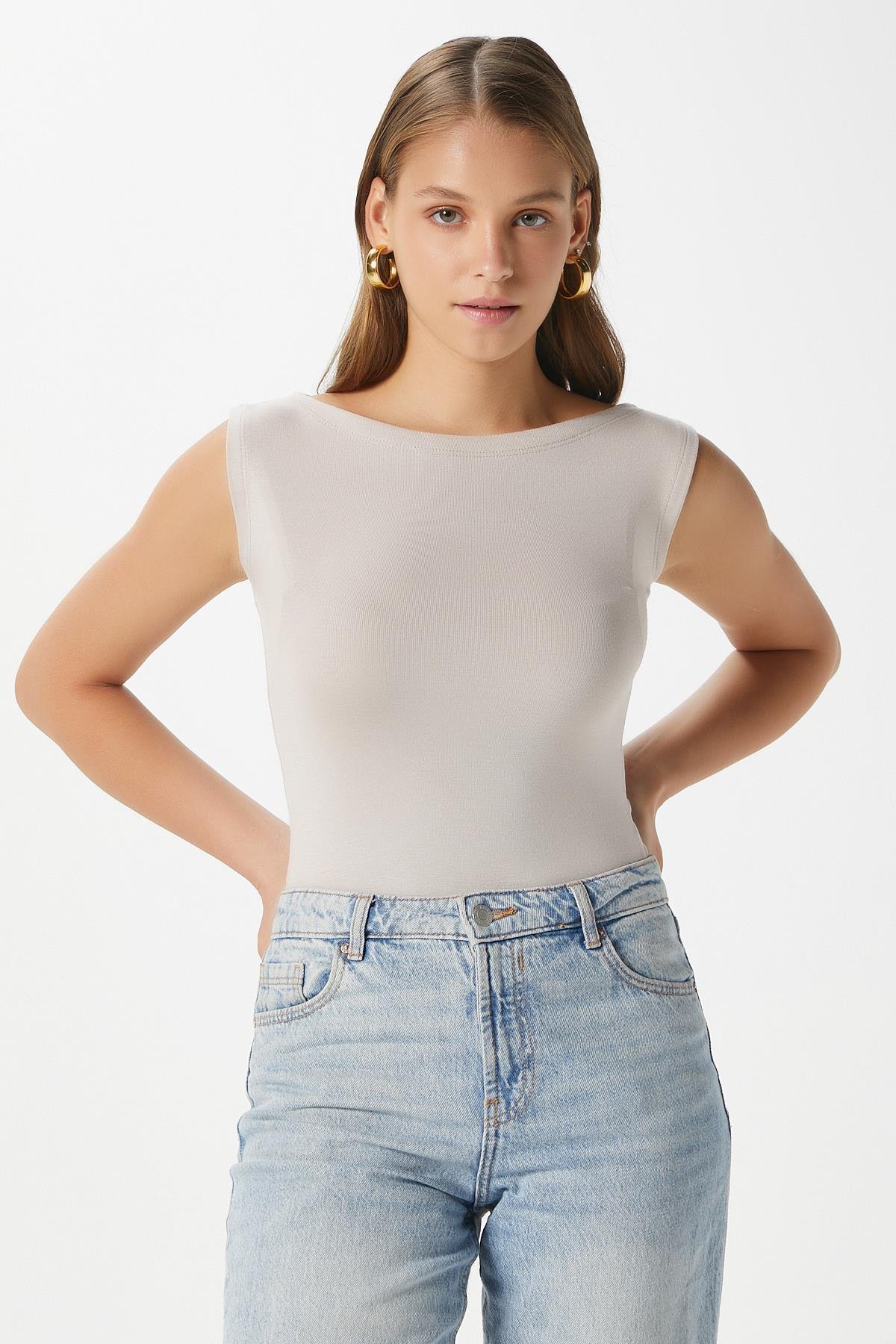Kadın Nova Kayık Yaka Lux Touch Yumuşak Doku Kolsuz Bej Bluz