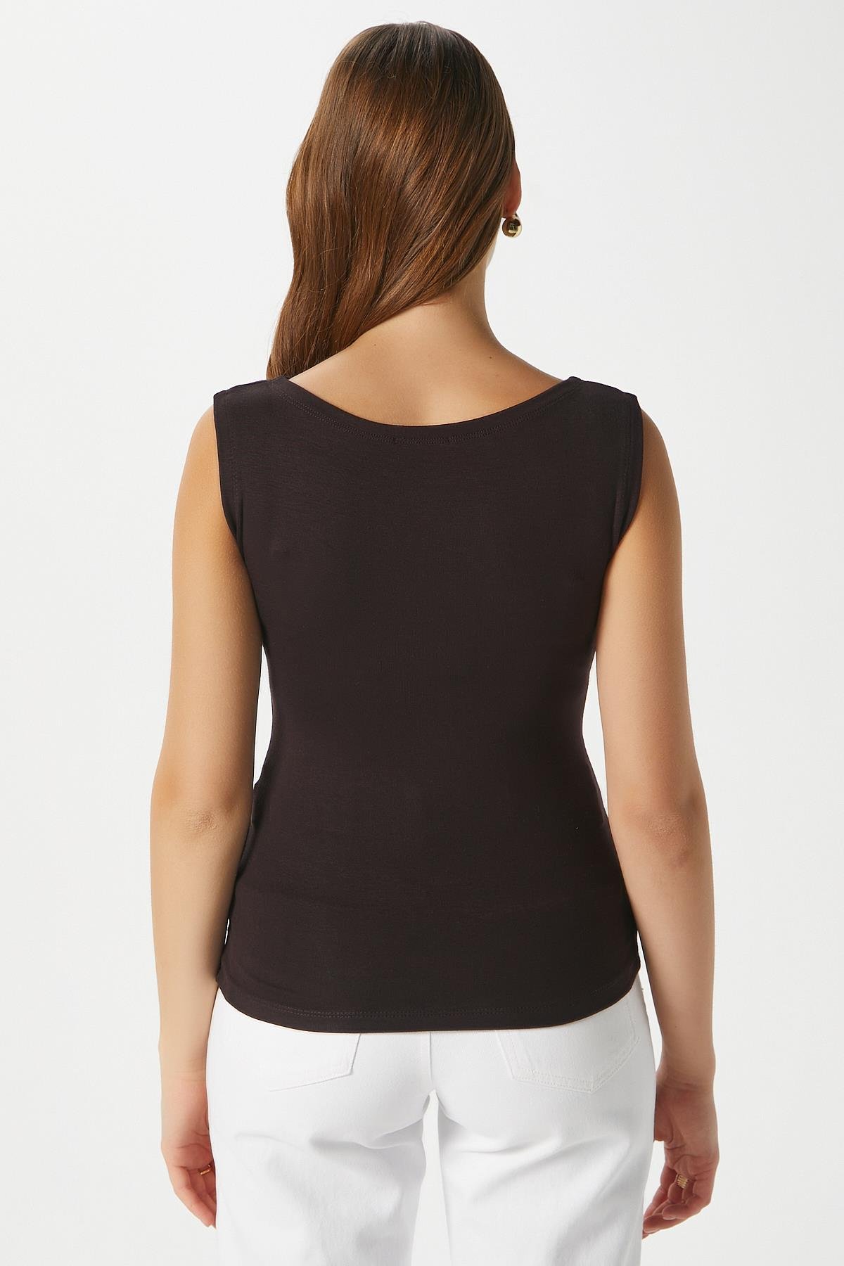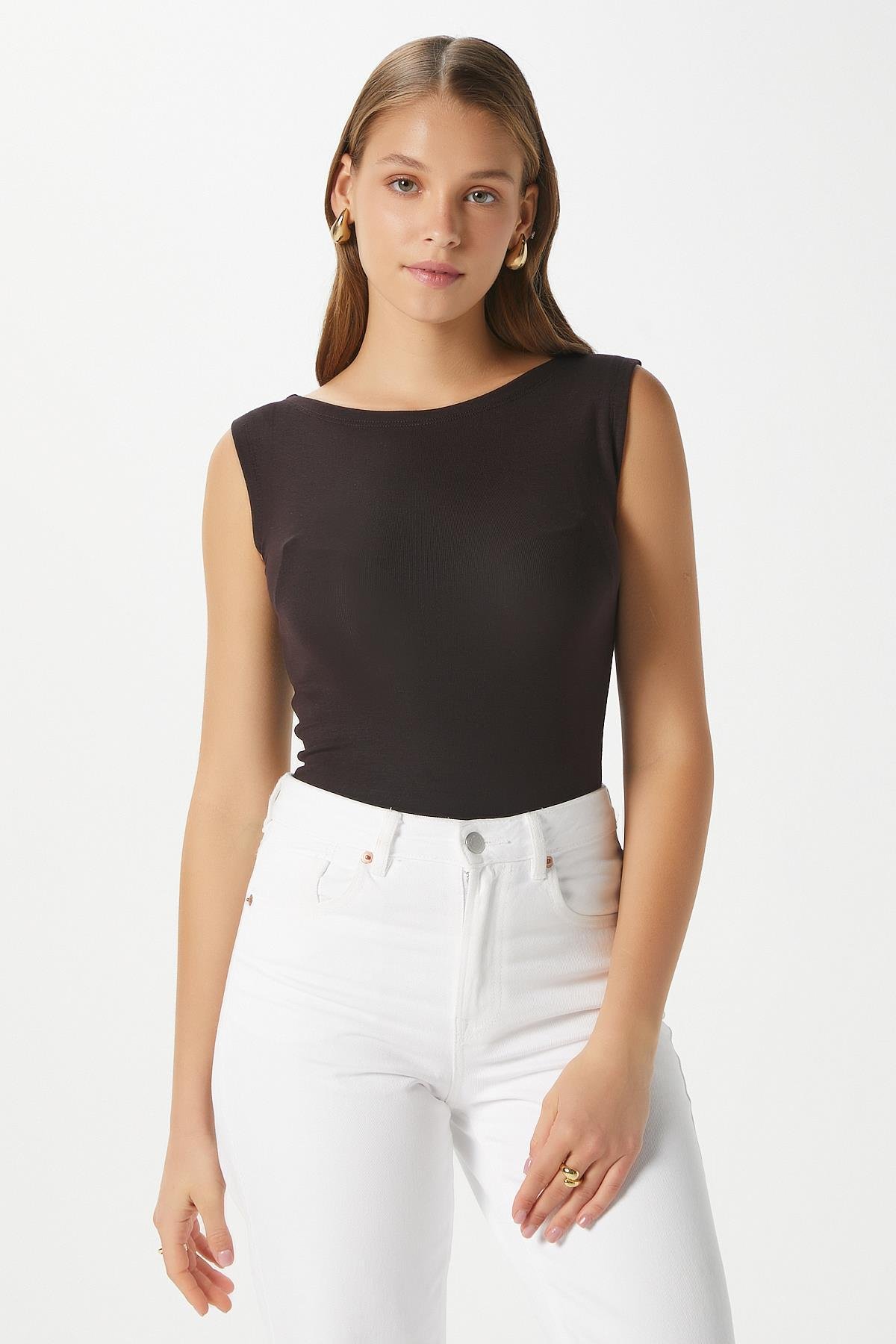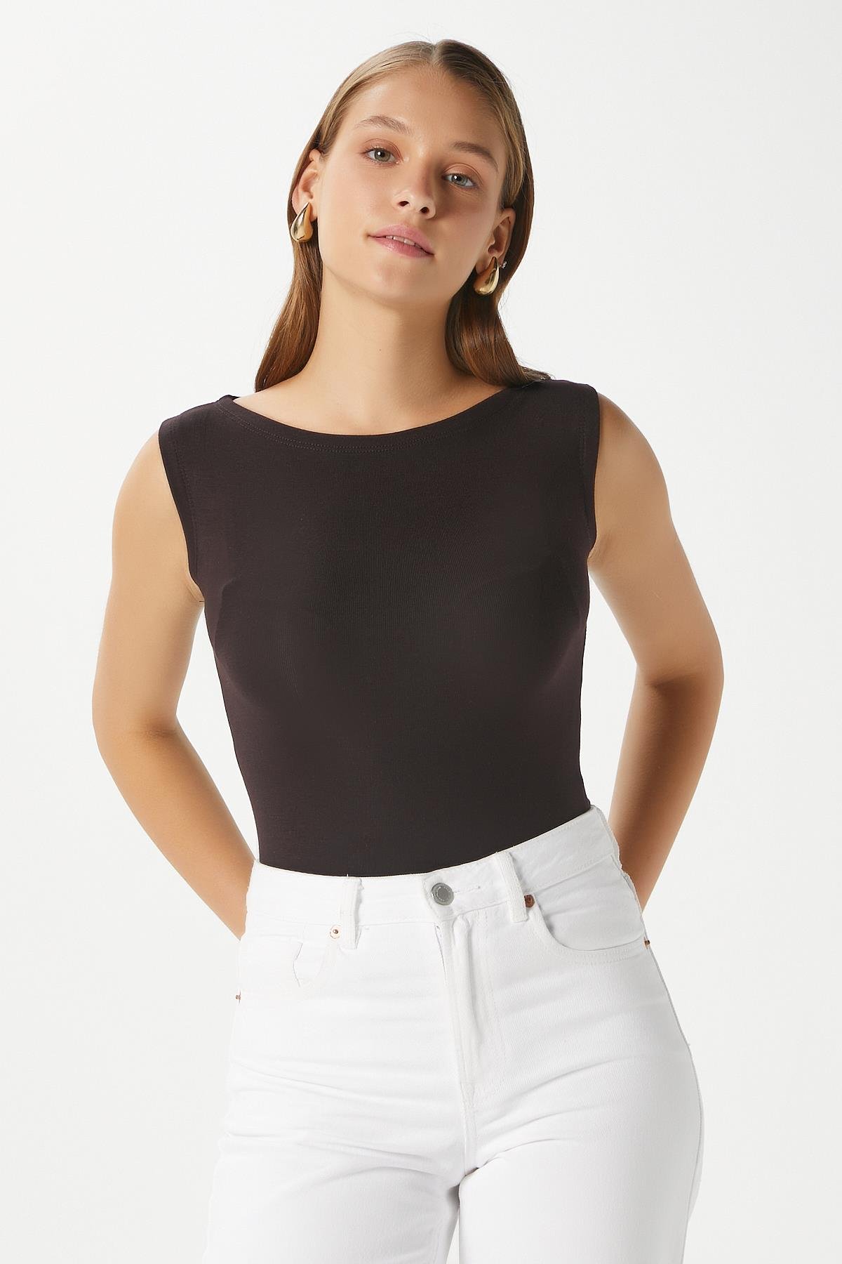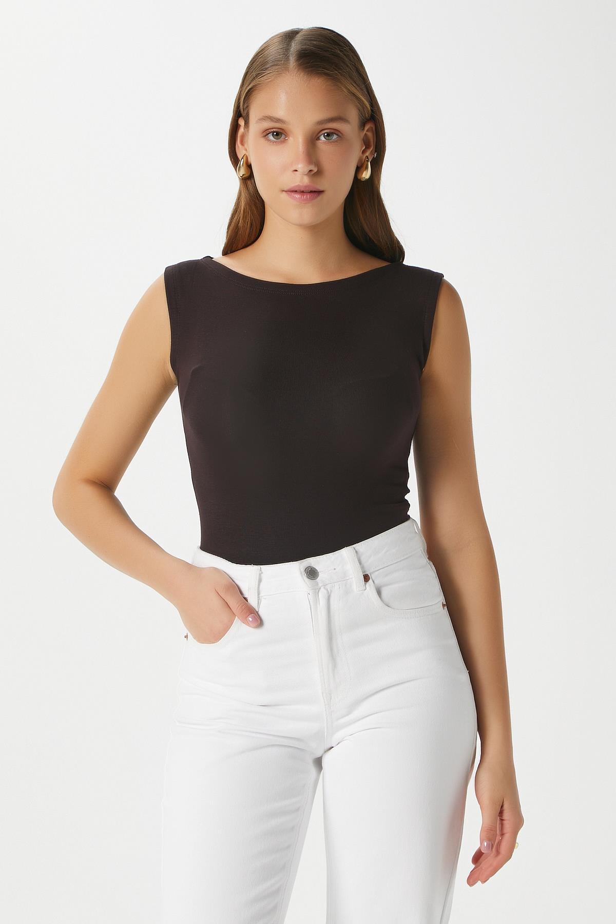 Kadın Nova Kayık Yaka Lux Touch Yumuşak Doku Kolsuz Kahve Bluz